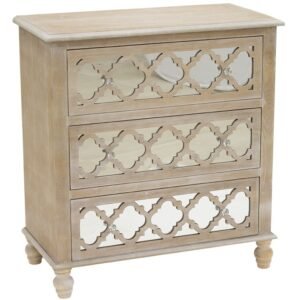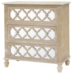 Komoda Marietta to elegancka i stylowa szafka, wykonana z połączenia szkła i MDF w kolorze srebrno-złotym. Posiada trzy szuflady z okrągłymi uchwytami, które doskonale kontrastują z delikatnymi kolorami mebla. To idealny wybór dla osób poszukujących nowoczesnego i eleganckiego elementu dekoracyjnego dla swojego wnętrza.