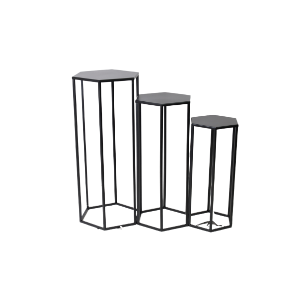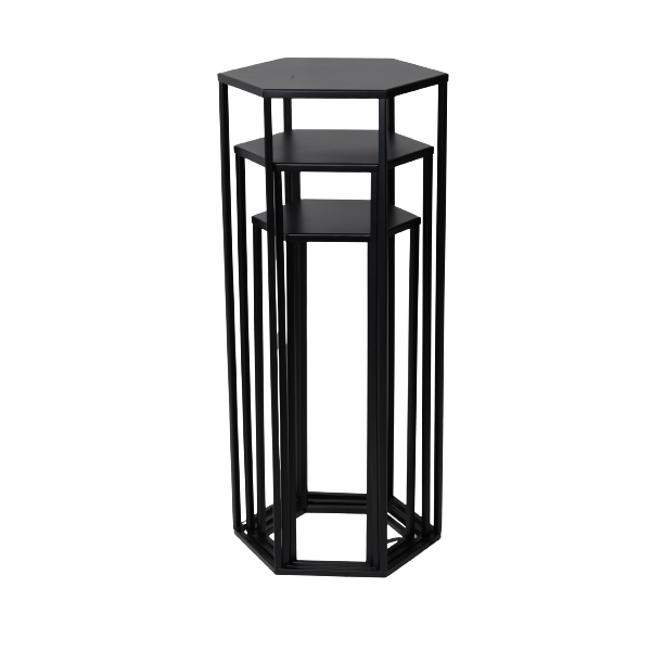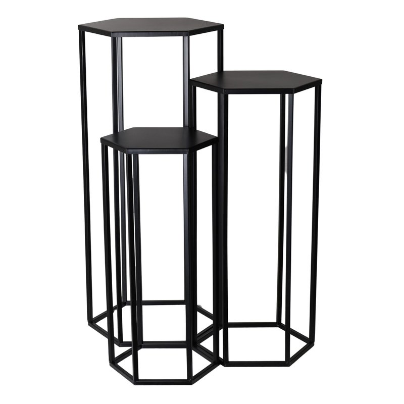Komplet 3 metalowych sześciokątnych stołków „Heksi” w eleganckim, głębokim odcieniu czerni, to idealny sposób na urozmaicenie swojego wnętrza. Każdy stołek to nie tylko praktyczne miejsce do stawiania napojów, książek czy dekoracji, ale również artystyczna forma, która zachwyci wzrok.