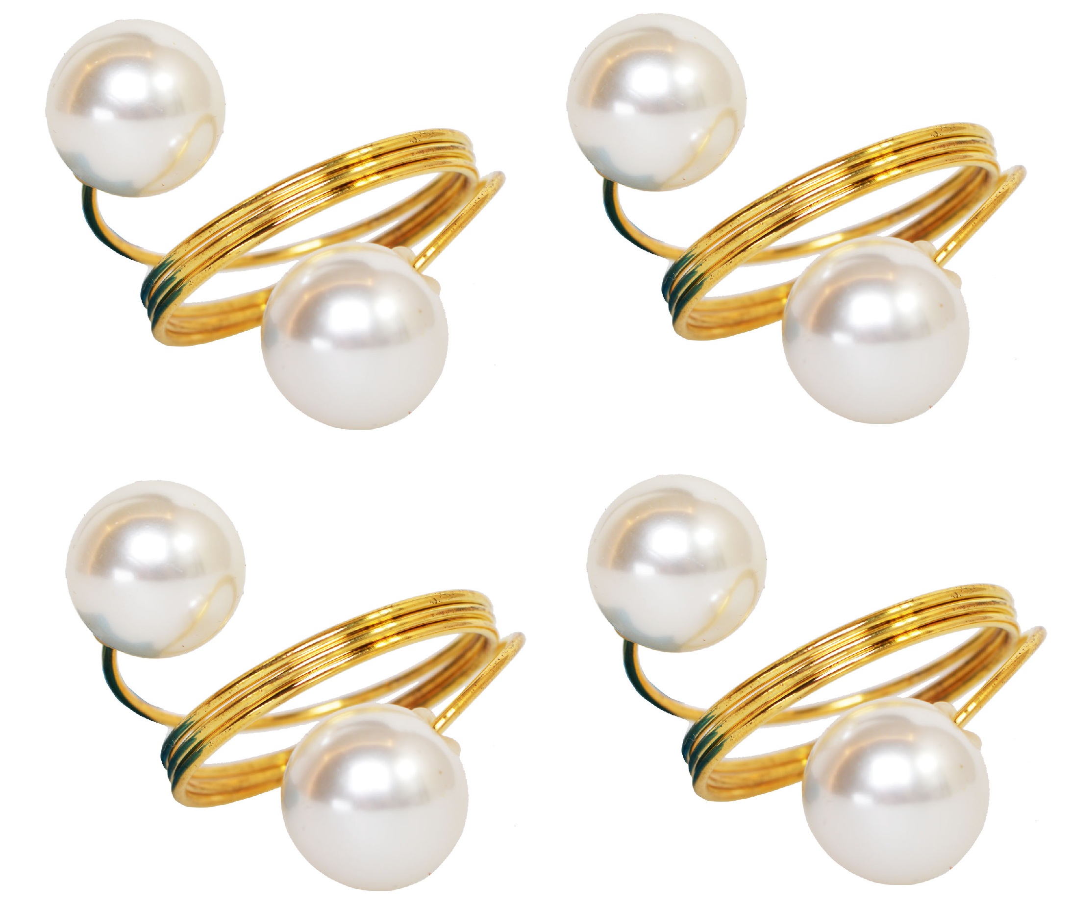 Zestaw czterech złotych serwetników z perłowymi zakończeniami. Stylowy dodatek do eleganckich aranżacji stołu.