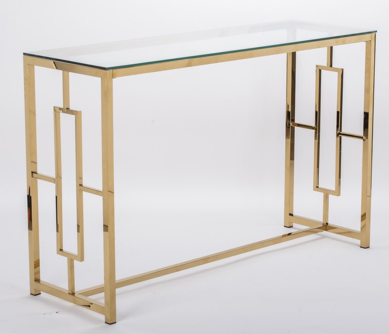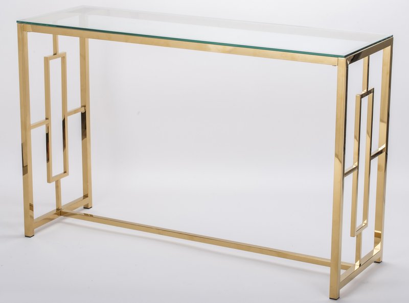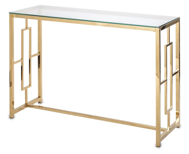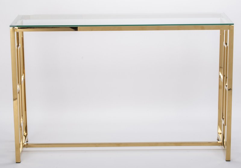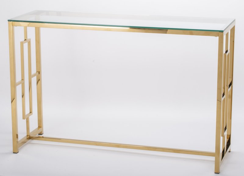 Konsola Prestiko to połączenie nowoczesnego stylu z designerskim wyglądem. Metalowe, złote nogi nadają konstrukcji eleganckiego wyglądu, a przezroczysty blat ze szkła dodaje przestrzeni lekkości. To doskonały element dekoracyjny dla Twojego mieszkania.