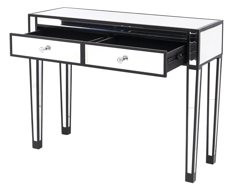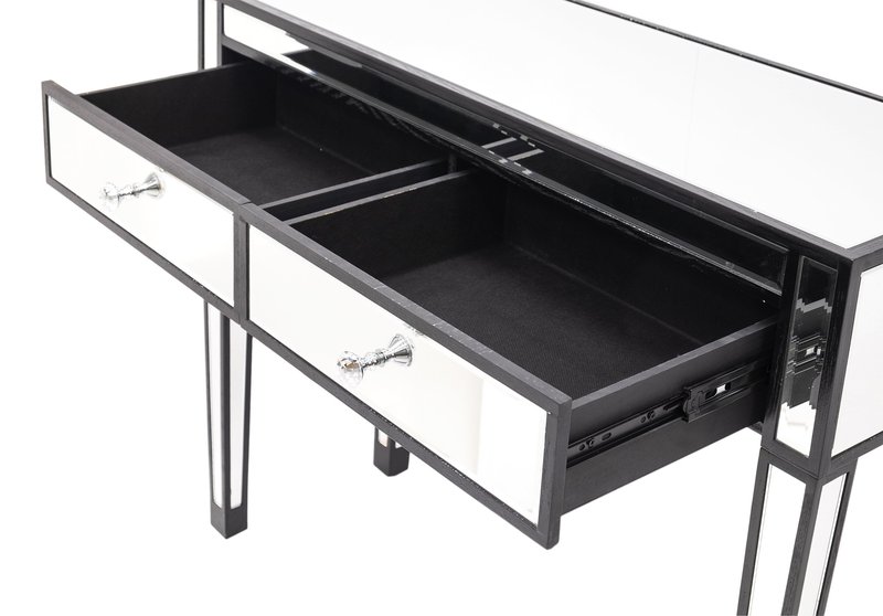Konsola szklana Marietta srebrna to produkt, który charakteryzuje się nowoczesnym wzornictwem oraz wysoką jakością wykonania. Konsola została wykonana z trwałych i odpornych na uszkodzenia materiałów, takich jak MDF i szkło, co gwarantuje długą żywotność mebla. Konsola posiada wyjątkowy design, który wyróżnia ją spośród innych mebli. Kolor dominujący to połączenie czerni i srebra, co dodaje jej szyku i elegancji.