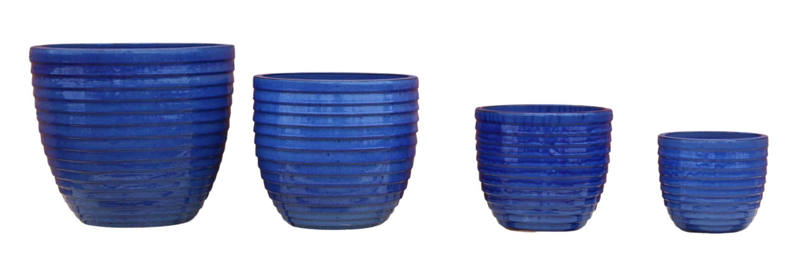 Kpl. 4 donic ceramicznych SHADOW niebieskich to zestaw stylowych donic o intensywnym, głębokim odcieniu niebieskiego i poziomej, dekoracyjnej strukturze. Połyskująca glazura dodaje im elegancji, tworząc nowoczesny akcent idealny do roślin i współczesnych aranżacji.