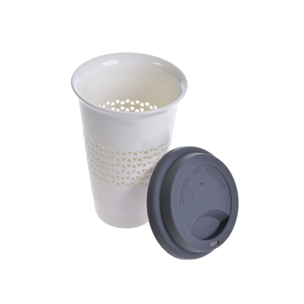 Ten biały kubek ażurowy zamykany to stylowy i praktyczny sposób na picie ulubionych napojów. Wykonany z trwałego materiału, posiada ażurowe zdobienia, a także wygodny pokrywkę, która chroni przed rozlewaniem się napoju. Idealny na codzienne podróże i chwile relaksu.