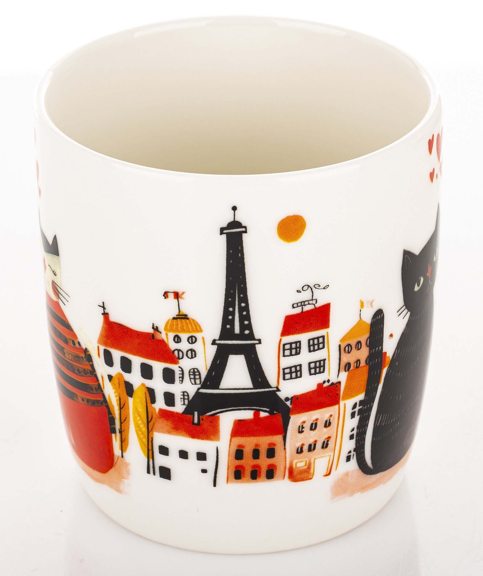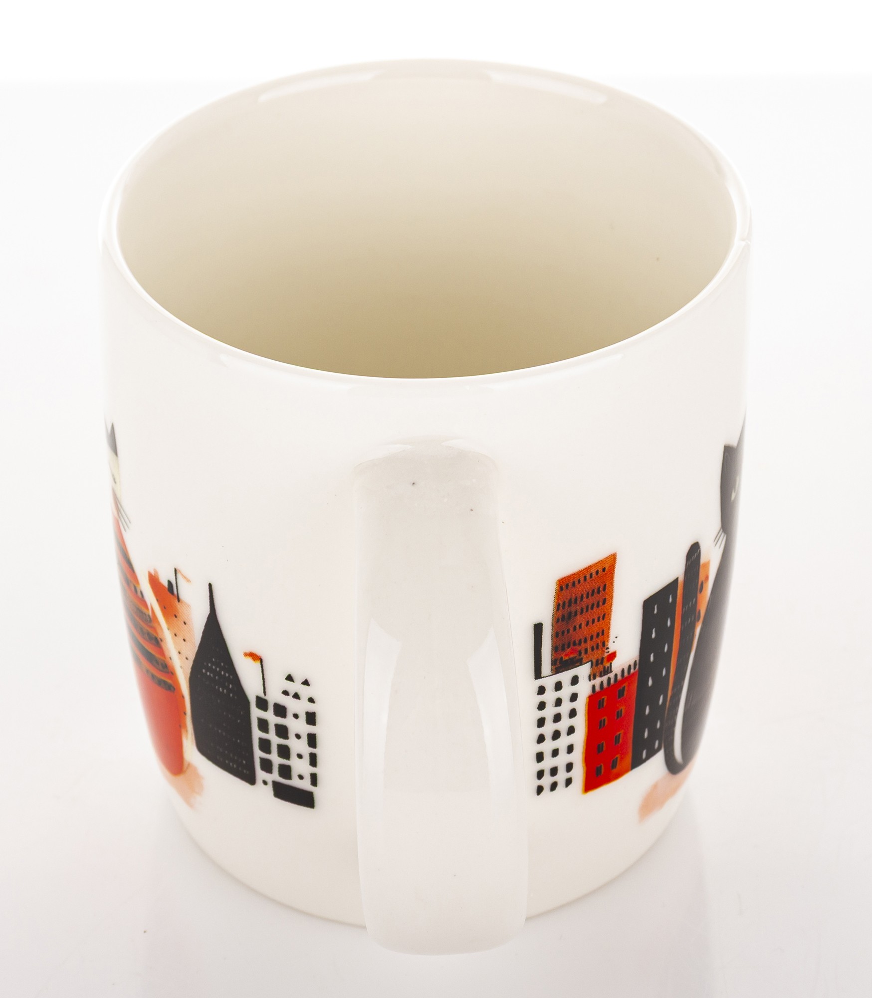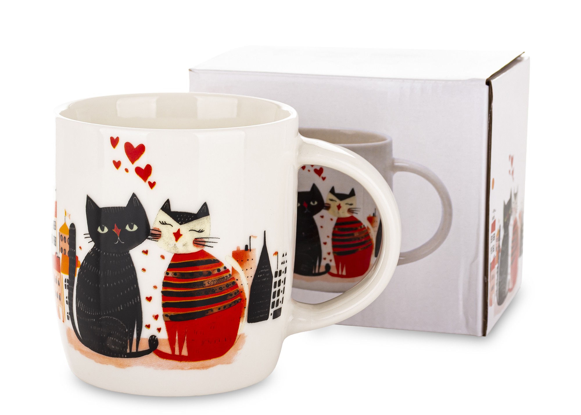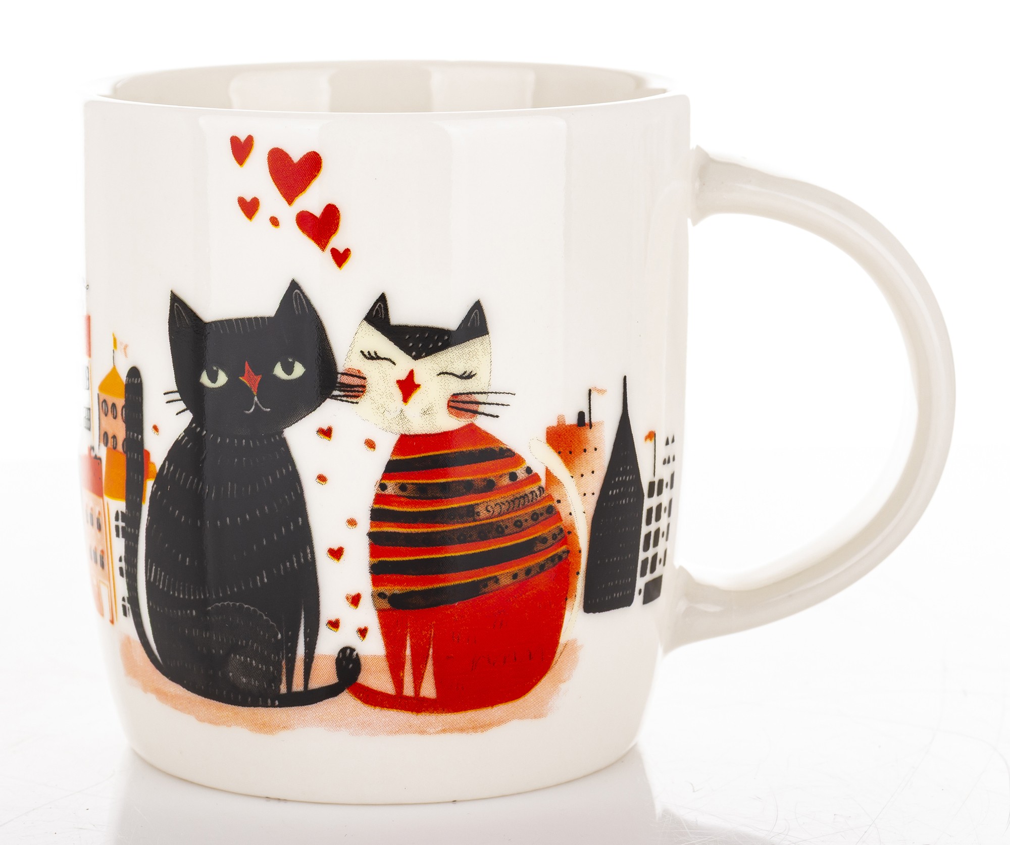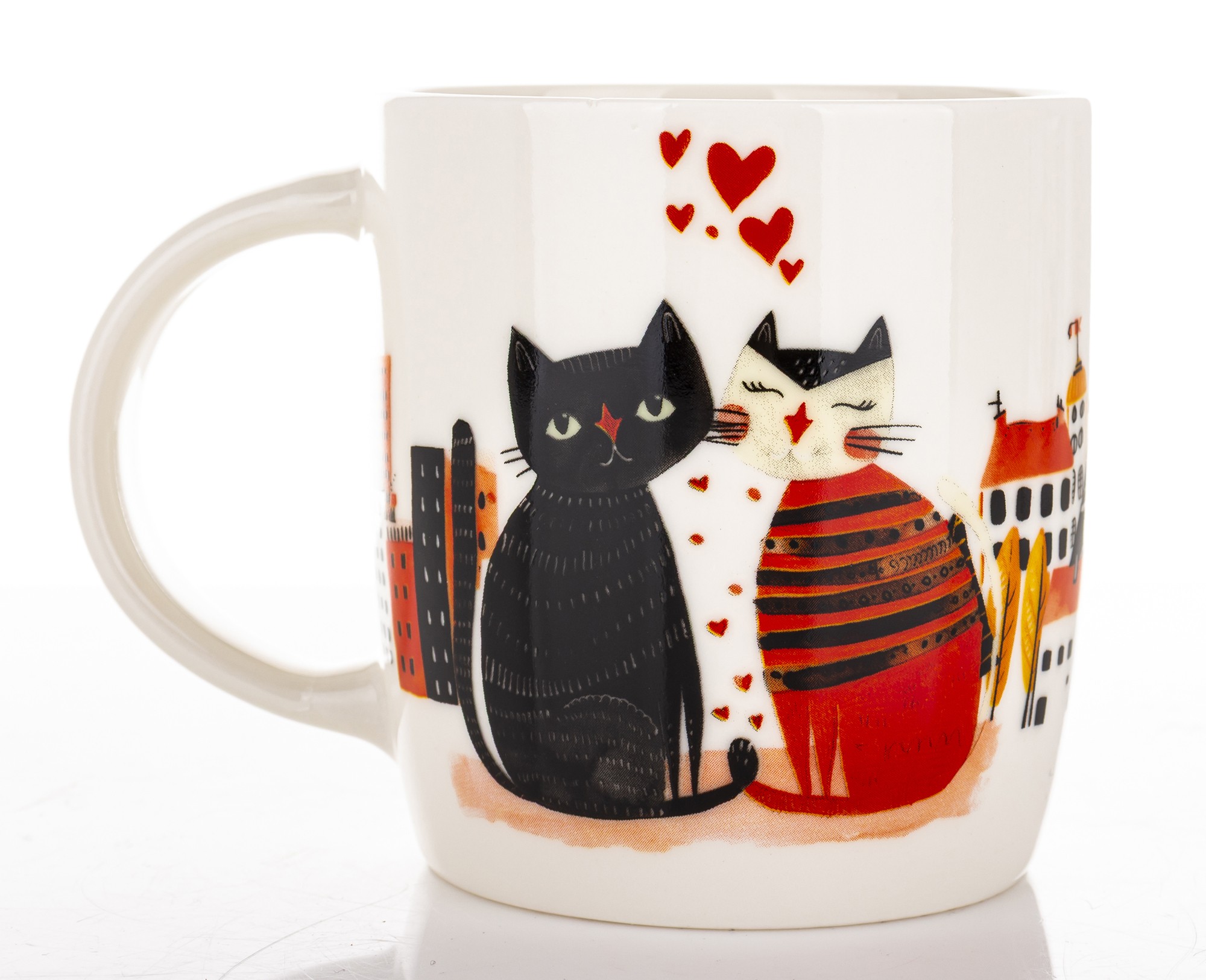 Kubek KITTIE to ceramiczna opowieść o uczuciu, bliskości i miejskiej codzienności. Na jego powierzchni widnieje para stylizowanych kotów — jeden czarny z czerwonymi akcentami, drugi biały w paski — siedzących obok siebie, otoczonych czerwonymi sercami. W tle pojawiają się abstrakcyjne budynki w odcieniach czerni i czerwieni, dodające ilustracji miejskiego charakteru i graficznej głębi.