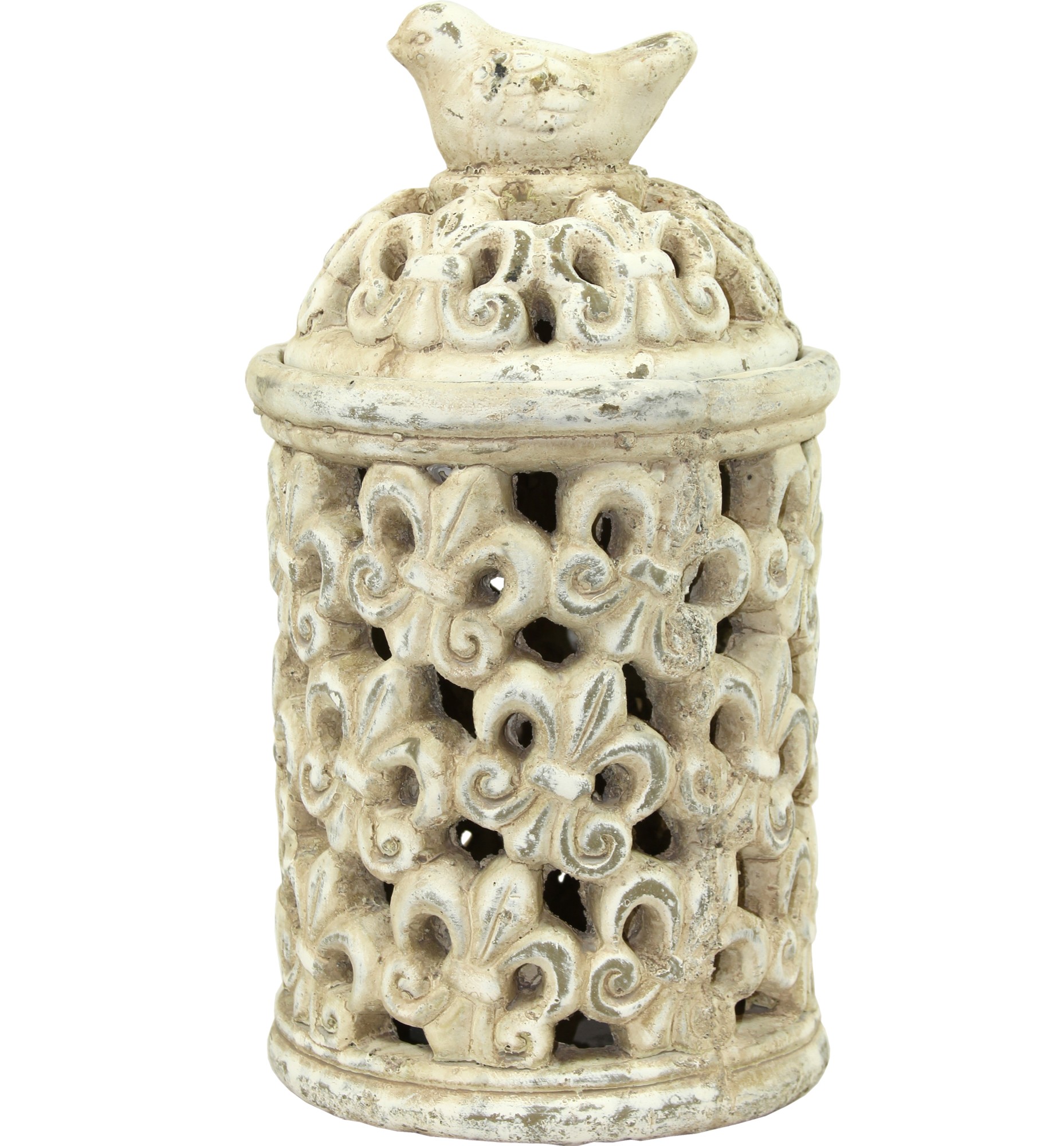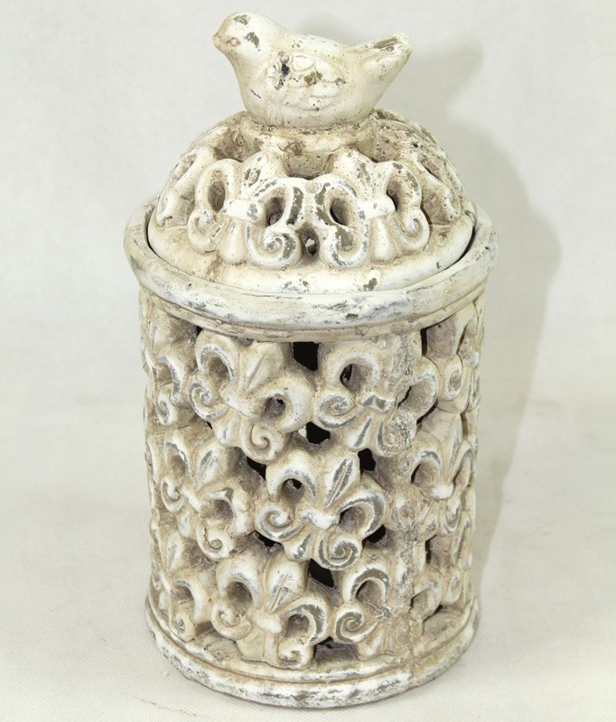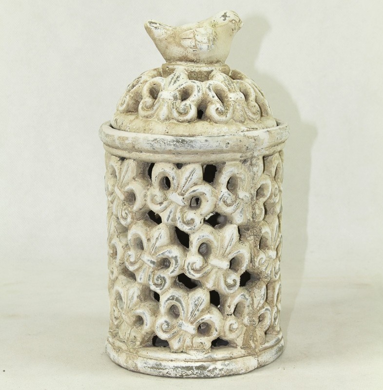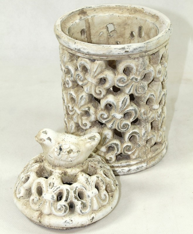 Lampion wykonano z ceramiki o przecieranym, antycznym wykończeniu w odcieniu złamanej bieli, co nadaje mu styl shabby chic z nutą francuskiej elegancji. Doskonale sprawdzi się jako dekoracja stołu, parapetu czy ogrodowego stolika, wprowadzając ciepło i przytulność do każdej aranżacji.