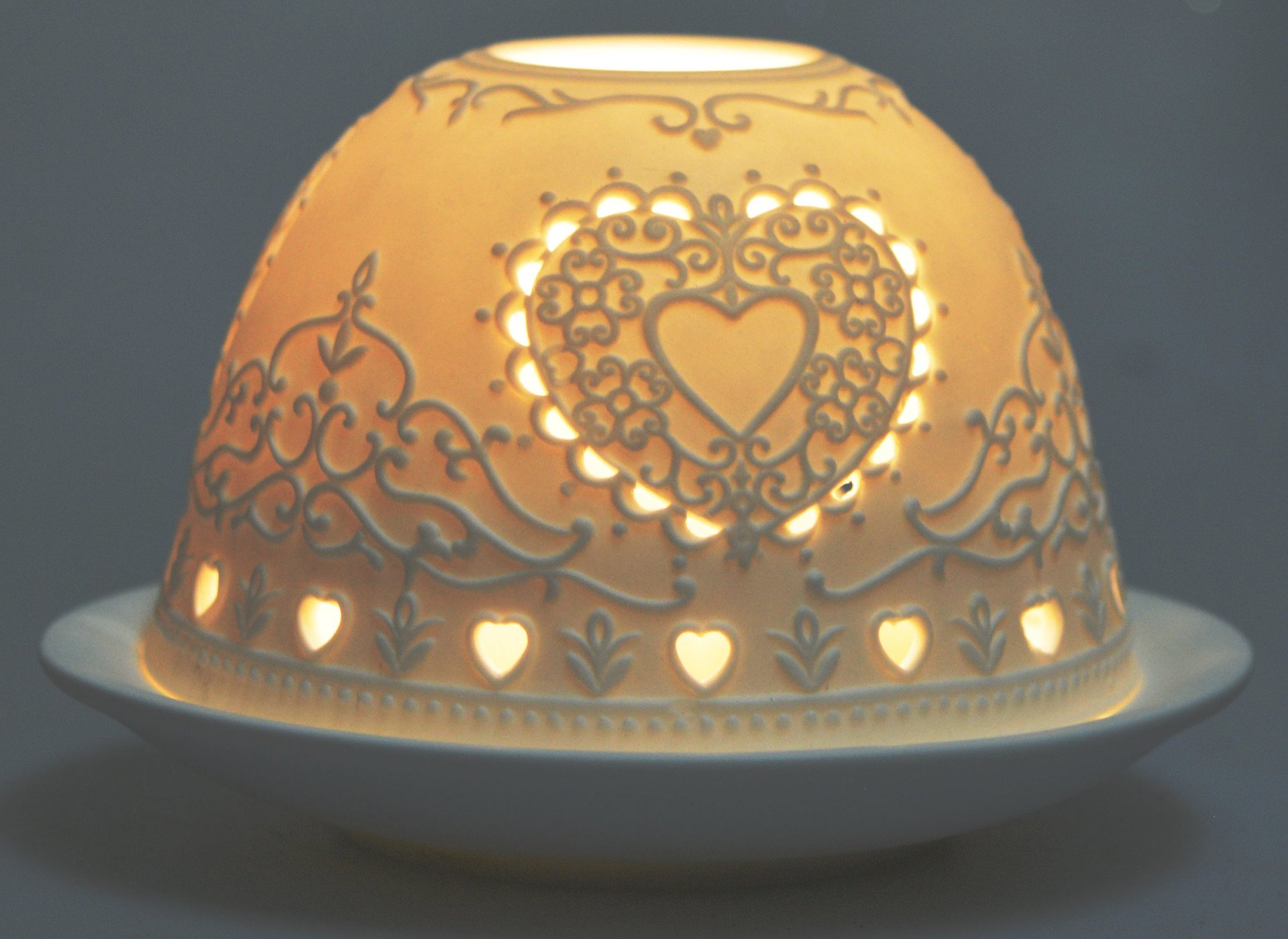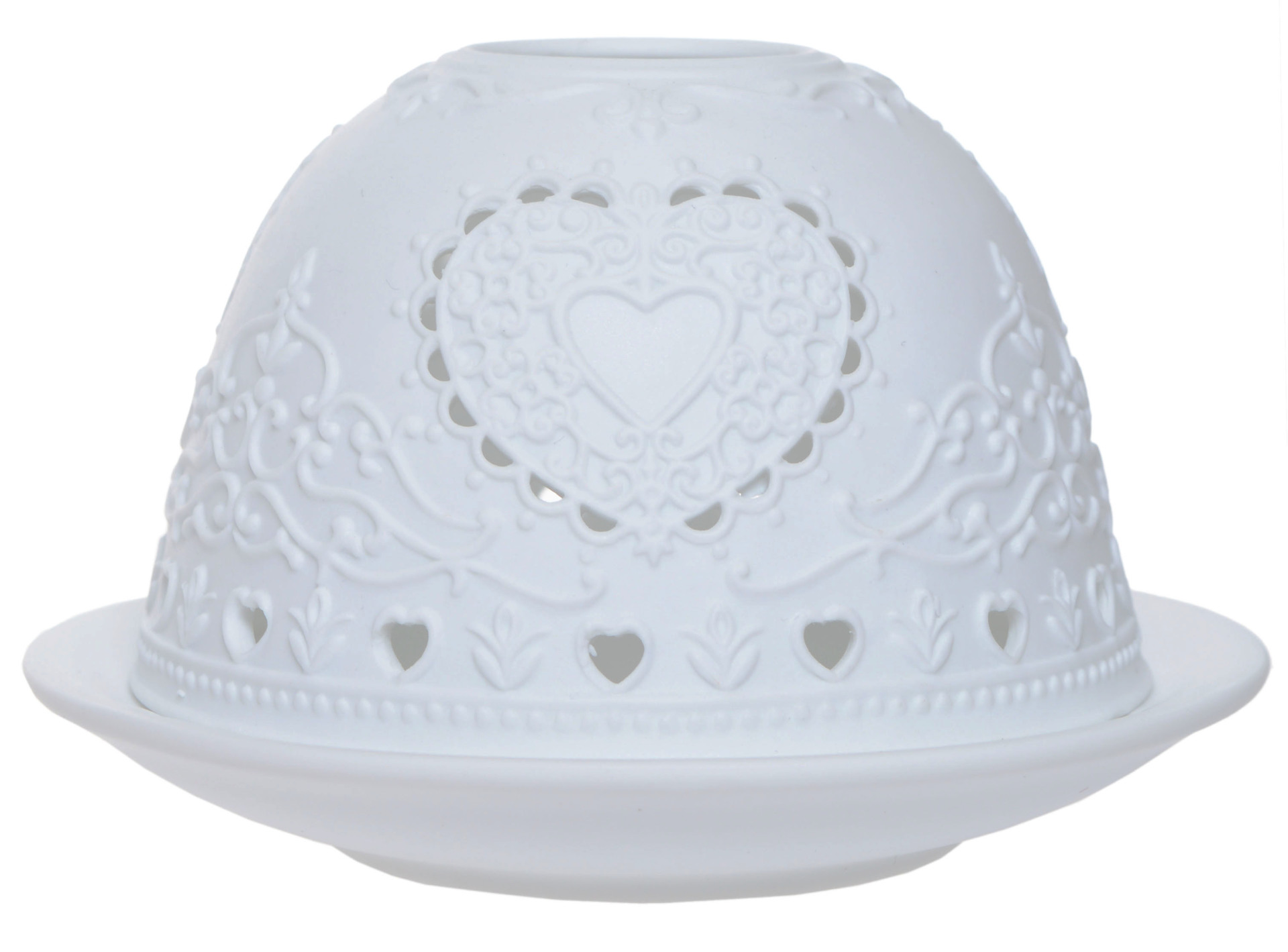 Lampion porcelanowy z sercem ażurowy LACOURA to dekoracja, która łączy funkcjonalność z artystyczną finezją. Wykonany z białej porcelany, ma kształt kopuły ozdobionej misternym, koronkowym wzorem z motywem serca w centrum. Dookoła znajdują się drobne wycięcia w kształcie serduszek i kwiatów, które po zapaleniu tealighta tworzą subtelny taniec światła i cienia.