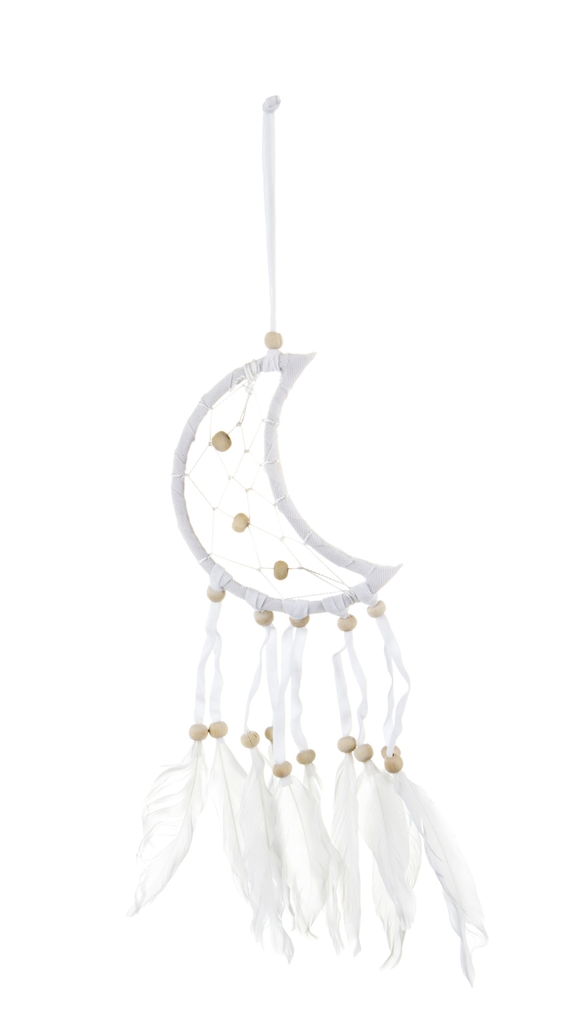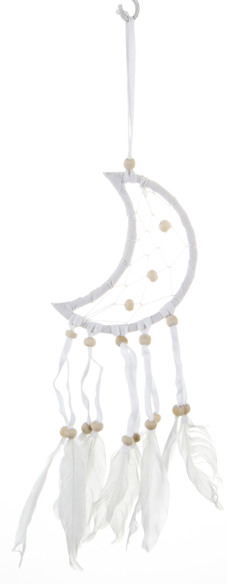Ten piękny łapacz snów w kształcie księżyca oplatanego białą bawełnianą nicią przyciąga wzrok delikatną koronką w środku. Wplecione koraliki dodają mu elegancji, a opadające sznurki zdobione piórami tworzą niezwykły efekt wizualny. To idealny dodatek do każdej sypialni, który wprowadzi spokój i harmonię. Zadbaj o swoje sny dzięki temu magicznemu amuletowi.