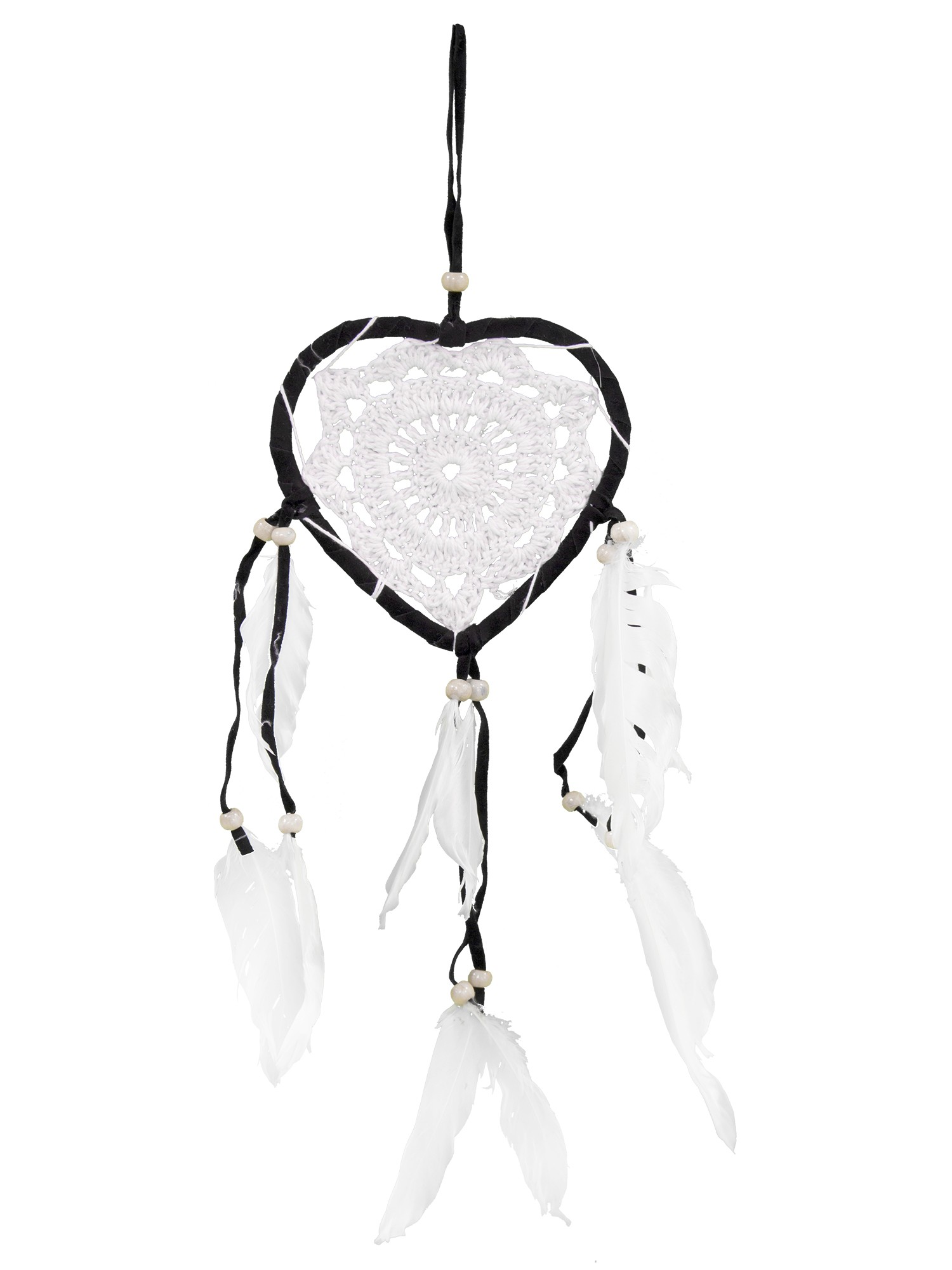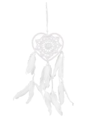 Biały łapacz snów w kształcie serca to elegancki dodatek, który przyciąga wzrok swoim misternym wzorem i subtelnością. W centrum czarnego serca widoczny jest precyzyjnie spleciony gwieździsty wzór w białym kolorze, dodający mu wyjątkowego uroku. Z głównego elementu opadają trzy sznurki ozdobione białymi piórkami i delikatnymi koralikami, tworząc efekt lekkości i harmonii. To idealny wybór dla tych, którzy poszukują nie tylko estetycznej ozdoby, ale także symboliki i spokoju w swoim otoczeniu.