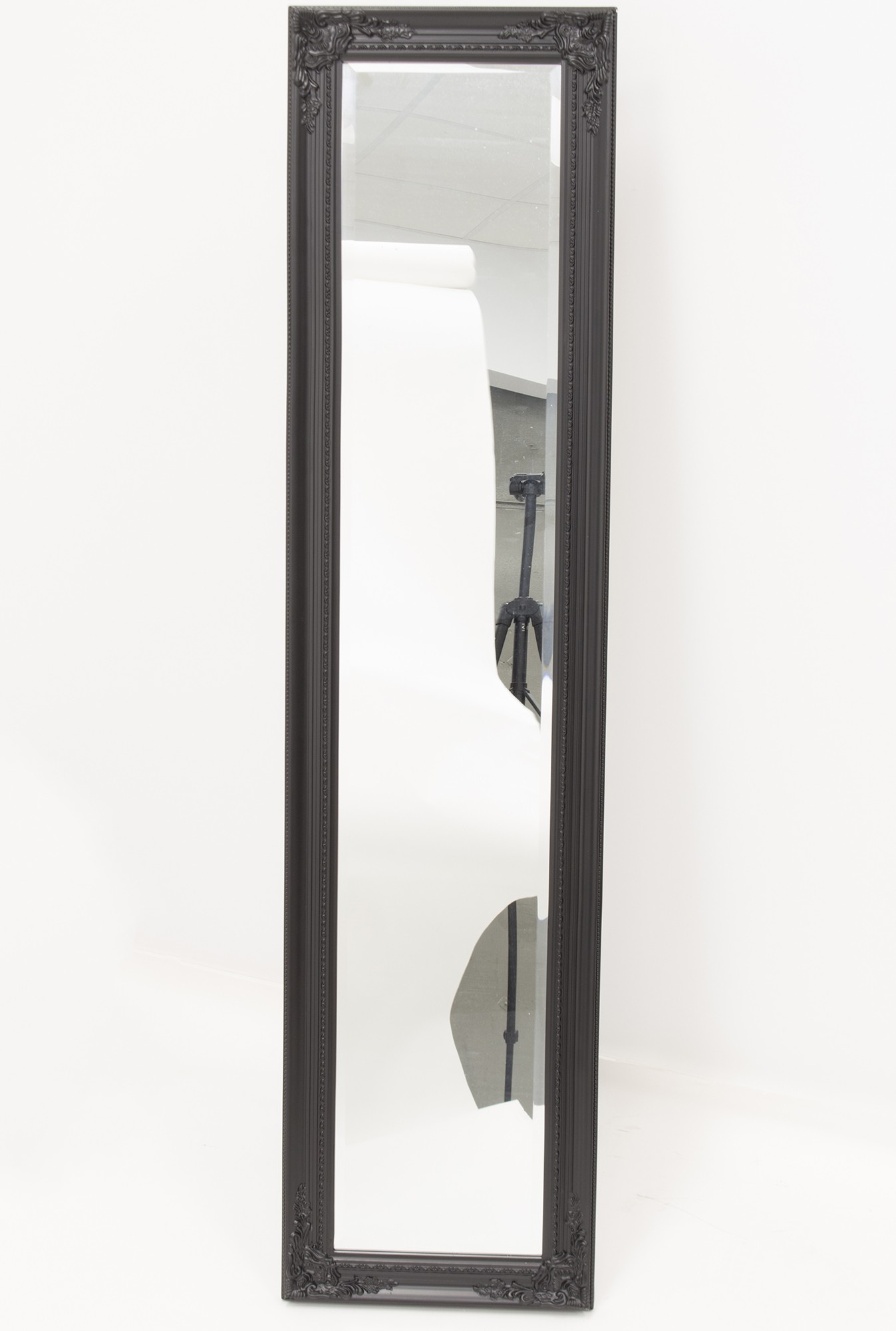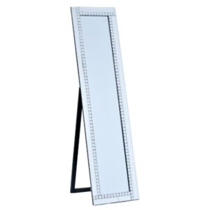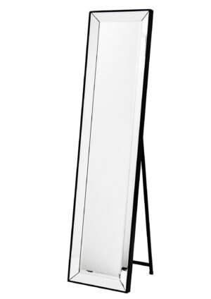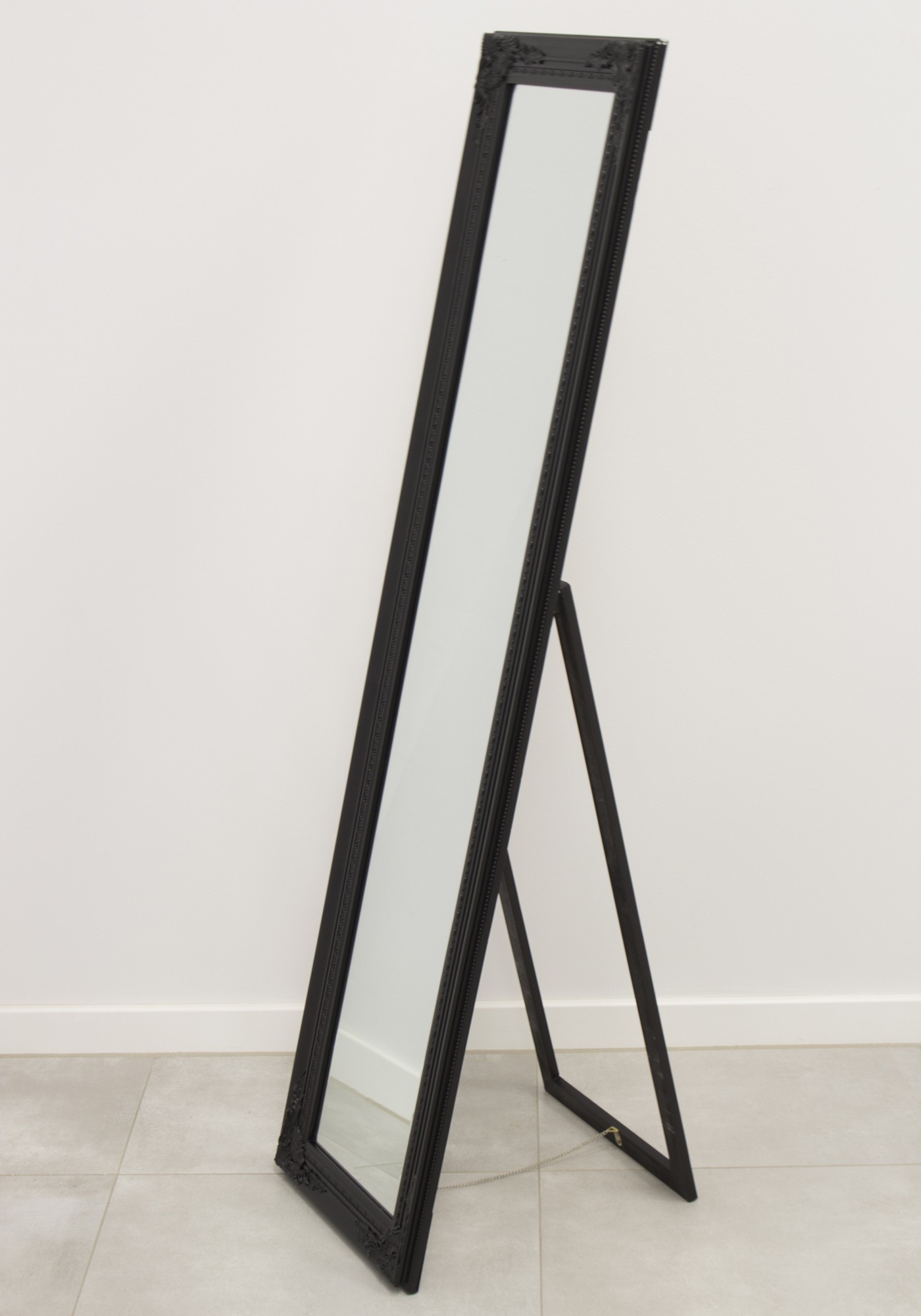 Odkryj nasze stojące lustro w drewnianej ramie w eleganckim czarnym kolorze, które emanuje klasą i wyrafinowanym stylem. Delikatne roślinne ornamenty w narożnikach oraz minimalistyczne zdobienia wzdłuż całej ramy nadają mu subtelny, ale niezwykle elegancki charakter. To lustro wprowadza do wnętrza głębię i wyjątkowy styl. Stanowi idealne uzupełnienie każdego wnętrza, będąc funkcjonalnym i estetycznym elementem każdego pomieszczenia. Solidna konstrukcja z wysokiej jakości materiałów zapewnia trwałość na lata, a design przyciąga wzrok i podkreśla wyrafinowany gust właściciela. Umieść je w sypialni, salonie czy przedpokoju, a odmienisz każde wnętrze, dodając mu klasy i elegancji. Wybierz nasze lustro, aby cieszyć się pięknem i funkcjonalnością każdego dnia. Dodaj wyjątkowy akcent do swojego domu, który zachwyci zarówno domowników, jak i gości.