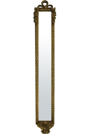 To wąskie prostokątne lustro z drewnianą, pozłacaną ramą, wprowadza do wnętrza elegancję i styl. Wyjątkowym elementem jest wykończenie górnej krawędzi ramy w postaci pięknie zdobionych róż, co dodaje lustrze romantycznego i delikatnego charakteru. Lustro o wymiarach 122x18x4 cm doskonale sprawdzi się w przedpokoju lub garderobie, doskonale wkomponowując się w przestrzeń. Solidna konstrukcja z drewna zapewnia trwałość produktu. Dekoracyjne zdobienia i staranne wykonanie sprawiają, że lustro jest nie tylko praktycznym dodatkiem, ale również efektowną ozdobą wnętrza. Idealne do wnętrz zarówno klasycznych, jak i nowoczesnych, wprowadzi do nich odrobinę luksusu i elegancji.