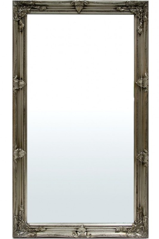 Eleganckie prostokątne lustro o wymiarach 134×74 cm, w drewnianej, ozdobnej ramie w srebrnym kolorze z efektem postarzenia. Styl vintage podkreślają zdobienia w narożnikach i centralnych punktach ramy. Idealne do wnętrz klasycznych i eklektycznych, dodając im wyjątkowego charakteru i elegancji.