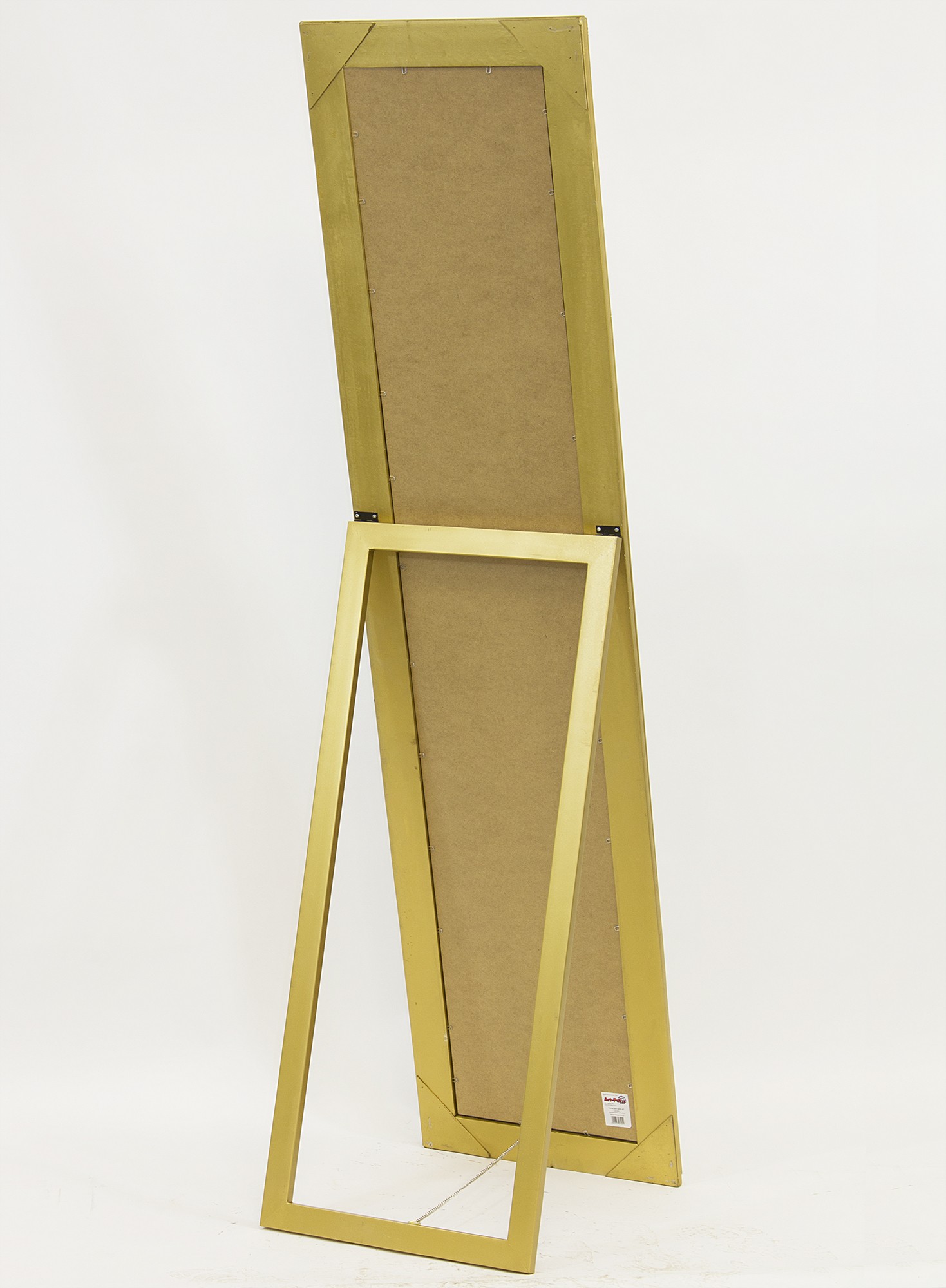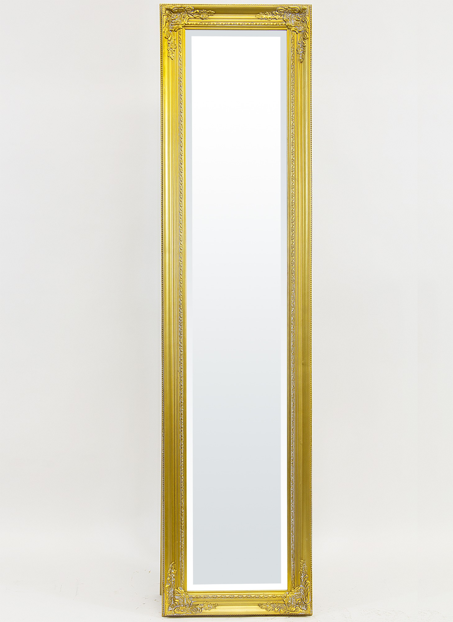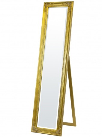 Złote stojące lustro w drewnianej ramie, wyróżnia się nie tylko pięknym designem, ale także wyjątkową solidnością. Jego złocisty kolor i delikatne roślinne ornamenty w narożnikach tworzą niepowtarzalny efekt, podkreślając luksus i elegancję każdego wnętrza. Subtelne, minimalistyczne zdobienia wzdłuż ramy dodają mu dodatkowego uroku, czyniąc z niego nie tylko lustro, ale prawdziwe dzieło sztuki. Doskonale komponuje się zarówno w tradycyjnych, jak i nowoczesnych aranżacjach, nadając każdemu pomieszczeniu niepowtarzalny charakter. To nie tylko element dekoracyjny, ale także praktyczne rozwiązanie, które we wspaniały sposób ożywia wnętrze. Wykonane z najwyższej jakości materiałów, nasze lustro zapewnia nie tylko estetykę, ale także trwałość na lata. Dodaj odrobinę luksusu do swojego domu i przeglądaj się w tym złotym lustrze niezależnie od tego, czy umieścisz je w przedpokoju, garderobie czy sypialni.