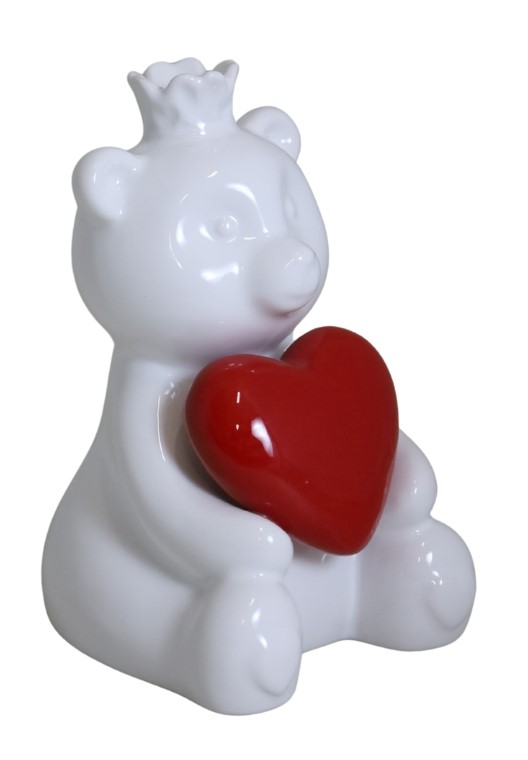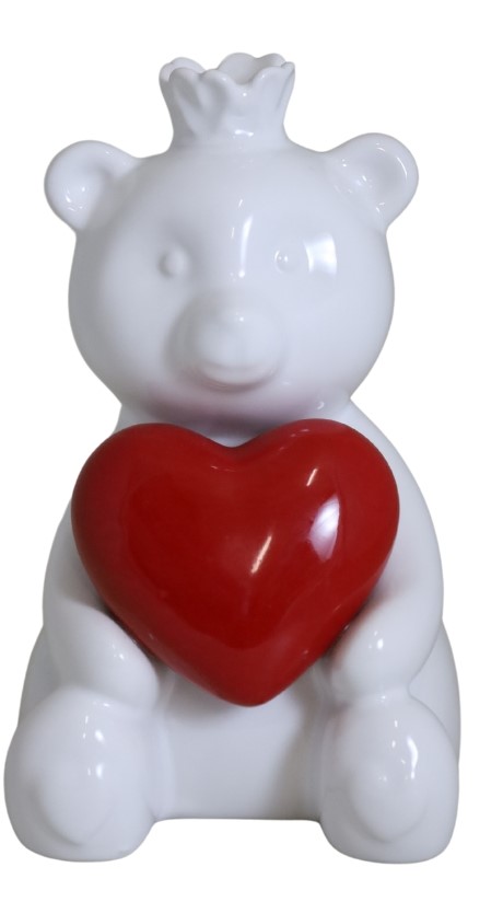 Miś ROYAL to mała, biała figurka ceramiczna z koroną i czerwonym sercem. Uroczy akcent do wnętrza, idealny jako prezent pełen emocji.