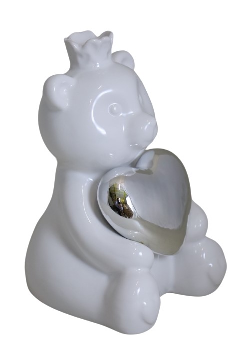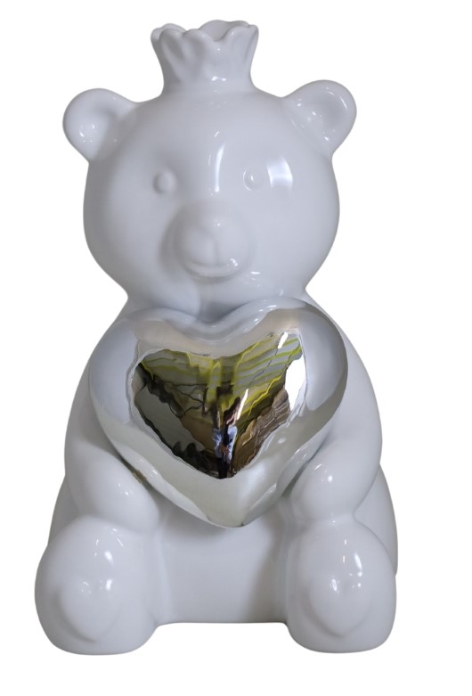 Miś ceramiczny ROYAL biały ze srebrnym sercem mały to wyjątkowa figurka, która łączy delikatność formy z wyrazistym przesłaniem. Wykonany z gładkiej, białej ceramiki miś siedzi z wyciągniętymi łapkami, tuląc intensywnie srebrne serce — symbol miłości, wdzięczności i czułości. Korona dodaje mu królewskiego charakteru, dzięki czemu staje się nie tylko dekoracją, ale także małym ambasadorem uczuć.