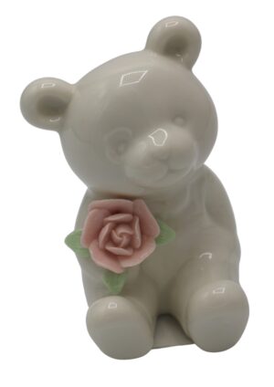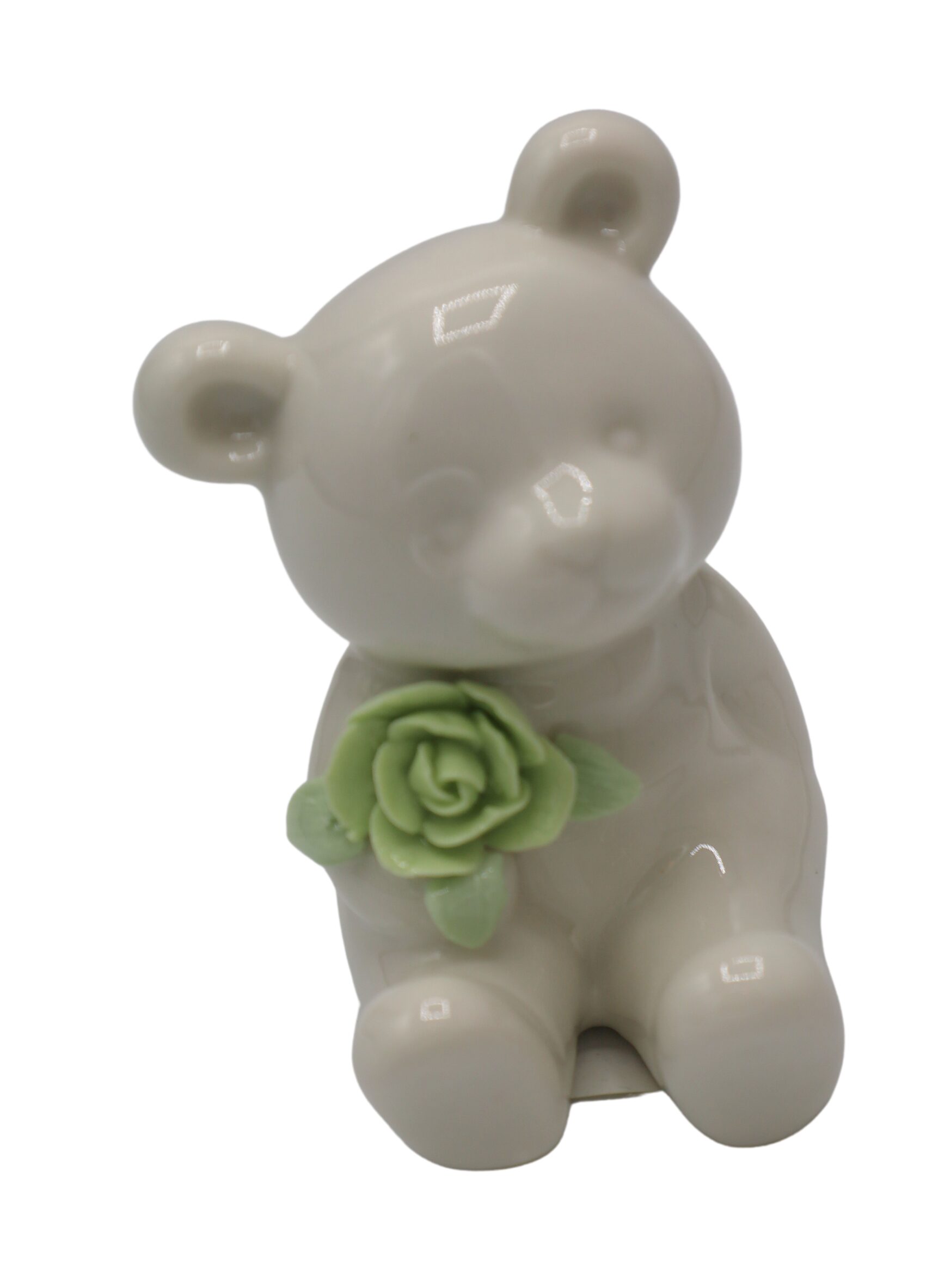 Miniaturowa figurka misia z błyszczącej ceramiki, trzymającego zielony kwiatek. Uroczy detal do wnętrza lub prezentu.