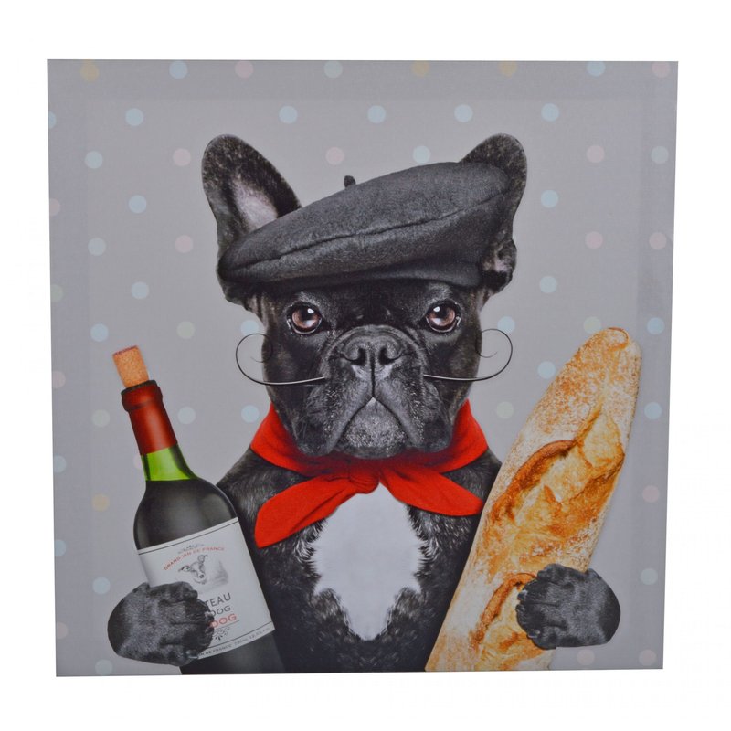 Obraz Frenchie z buldogiem francuskim to wykonany z tworzywa sztucznego wizerunek buldoga francuskiego w kaszkiecie, trzymającego w jednej łapie bagietkę a w drugiej butelkę wina. Idealny prezent dla miłośników tej rasy psów i świetny motyw dekoracyjny dla kuchni.