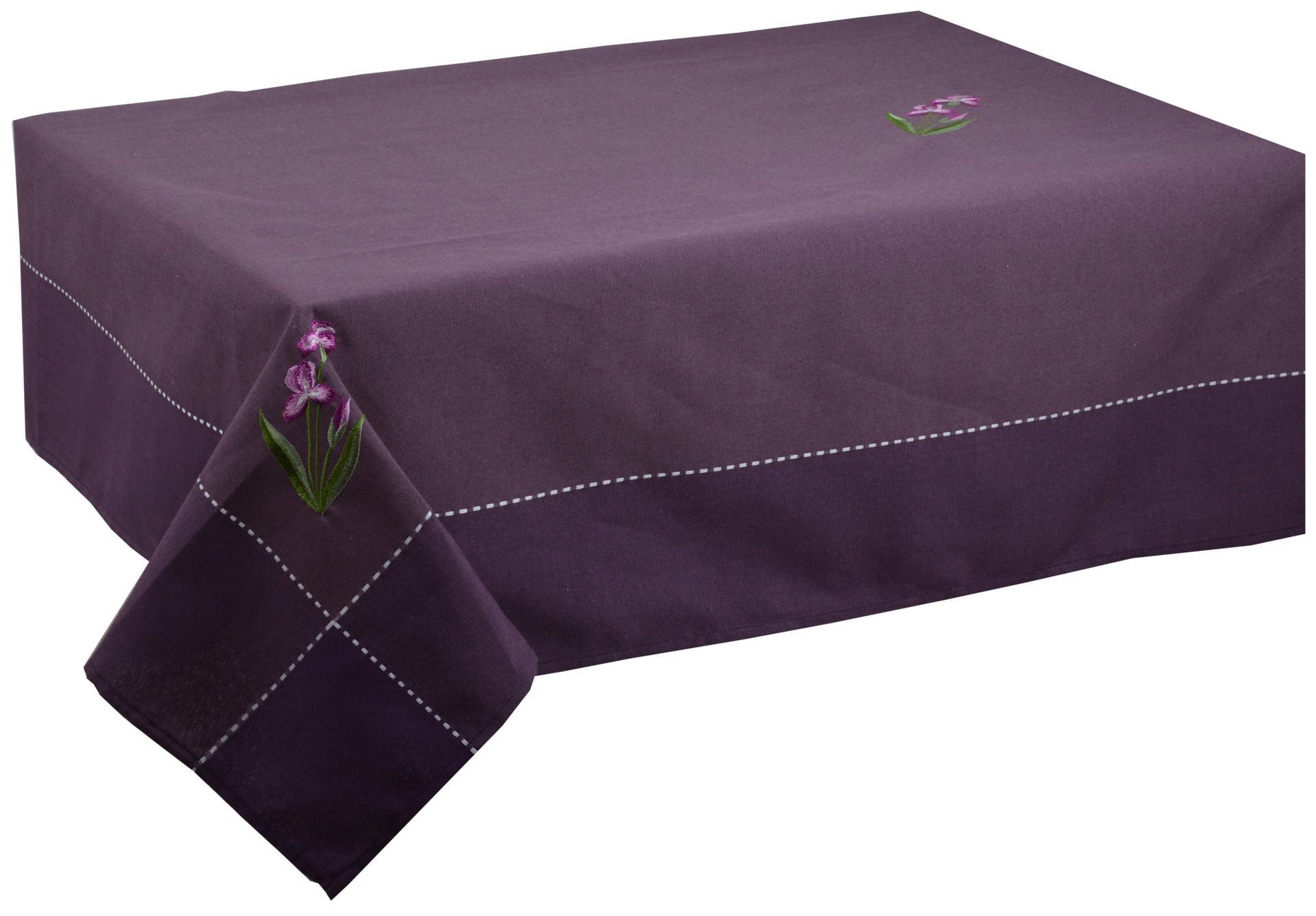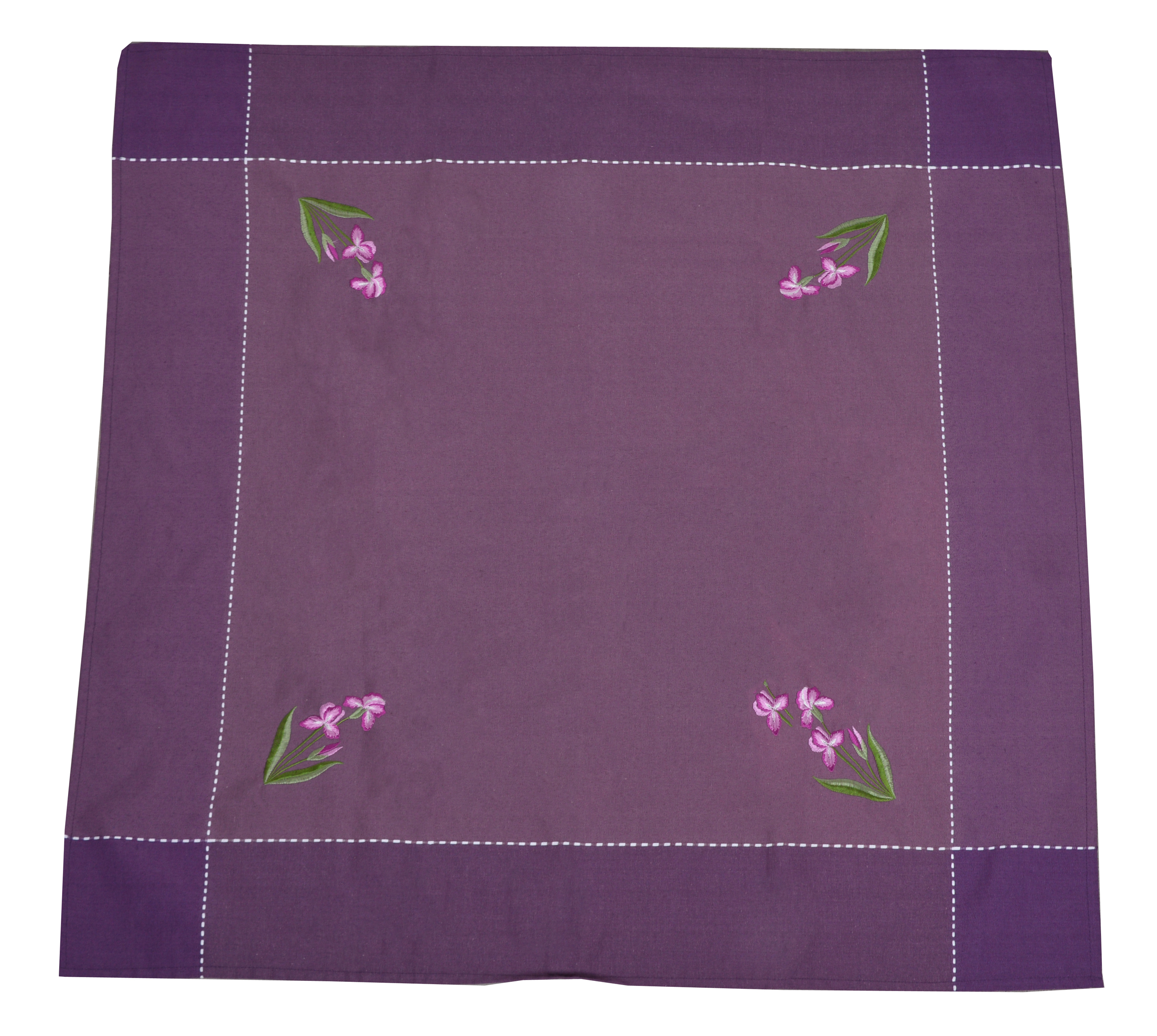 Fioletowy obrus BOLSO, 85×85 cm, z subtelnymi różowymi haftami kwiatowymi i białym wzorem kwadratowym. Idealny do dekoracji stołu w klasycznym stylu.