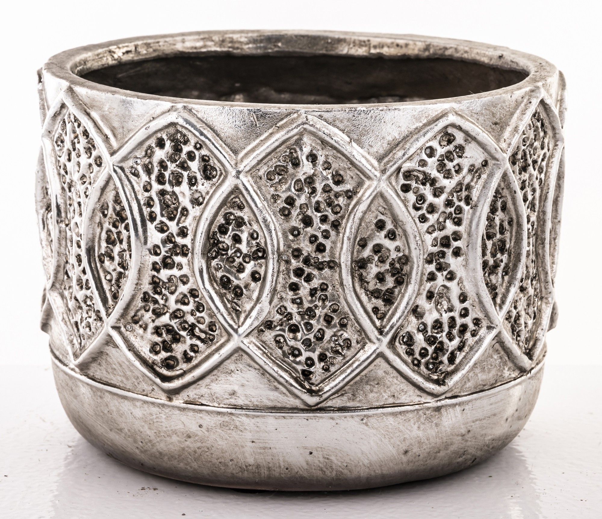 Okrągła osłonka na doniczkę o średnicy 18 cm w srebrnym kolorze to esencja elegancji i wyrafinowania. Jej powierzchnia ozdobiona jest wyrzeźbionymi kształtami liści, które tworzą subtelny, ale efektowny wzór. Ciekawa faktura dodaje osłonce unikalnego charakteru. Srebrny kolor osłonki doskonale komponuje się z różnorodnymi stylami aranżacyjnymi, dodając blasku i nowoczesności każdemu pomieszczeniu. Idealny dodatek do mieszkania, podkreślający piękno roślin i przykuwający uwagę swoim unikalnym designem. To nie tylko funkcjonalny element, ale także artystyczny akcent, który wzbogaci każdą przestrzeń o wyjątkowy charakter i elegancję.