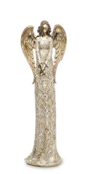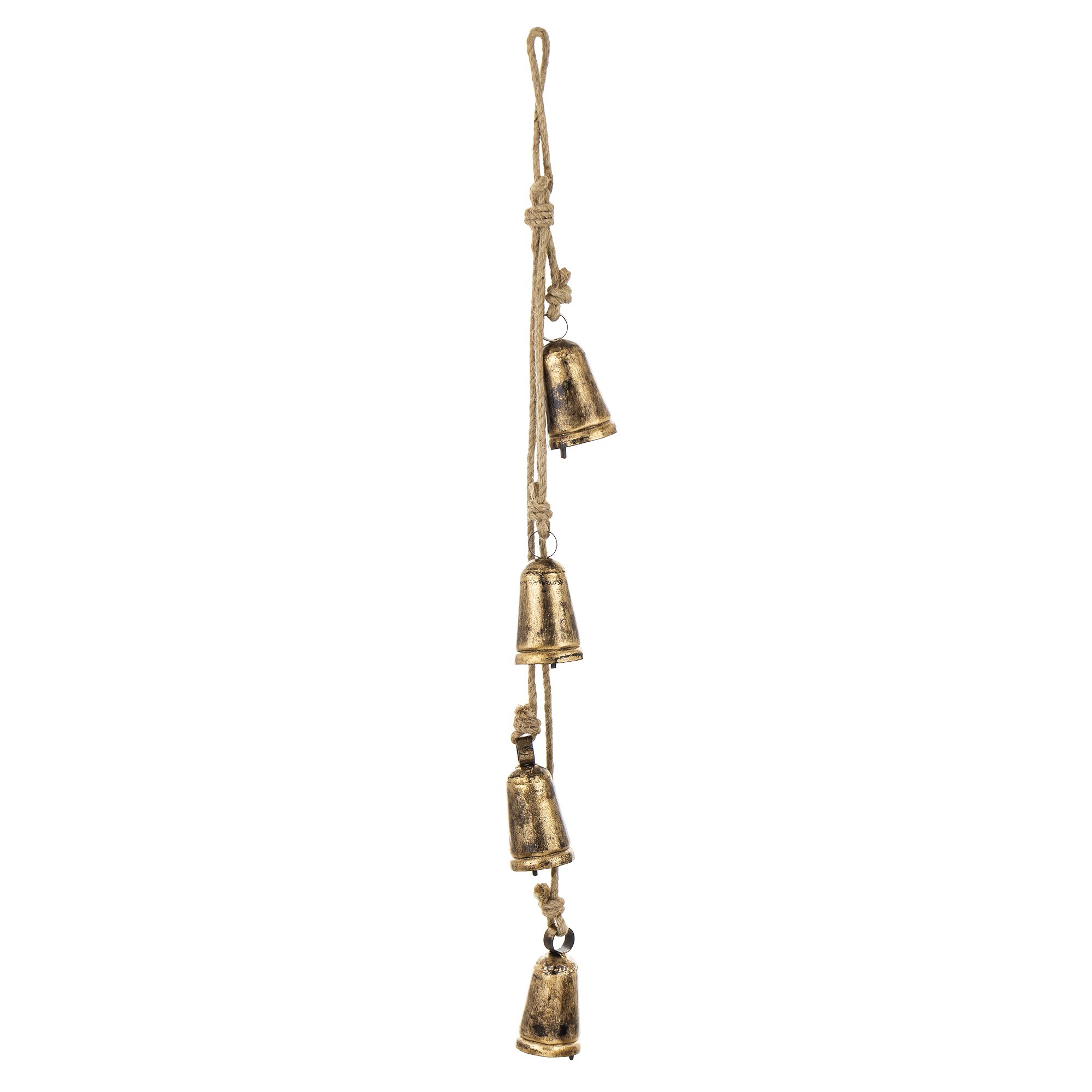 Elegancka wisząca ozdoba składająca się z czterech podłużnych dzwonków w złotym kolorze. Dzięki postarzanemu wykończeniu dzwonki nabierają wyjątkowego charakteru, tworząc klimatyczną dekorację. Zawieszone na naturalnym sznurze, dzwonki doskonale sprawdzą się jako ozdoba do ogrodu, na balkon lub zawieszona w drzwiach. Wymiary całości to 87x10x10 cm.