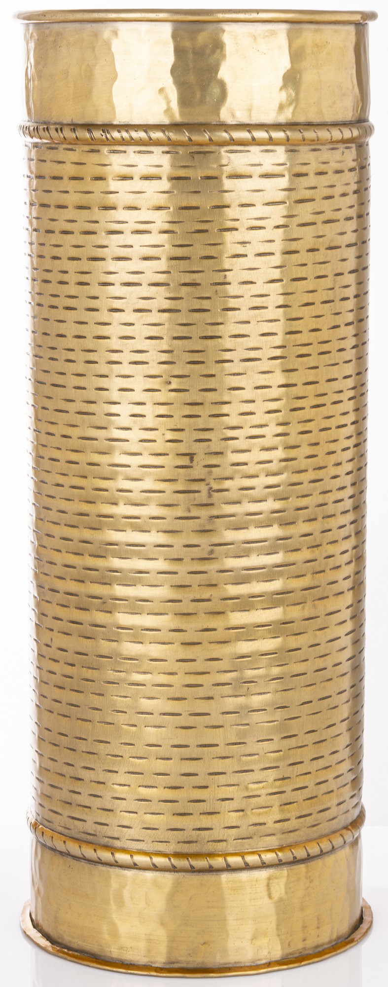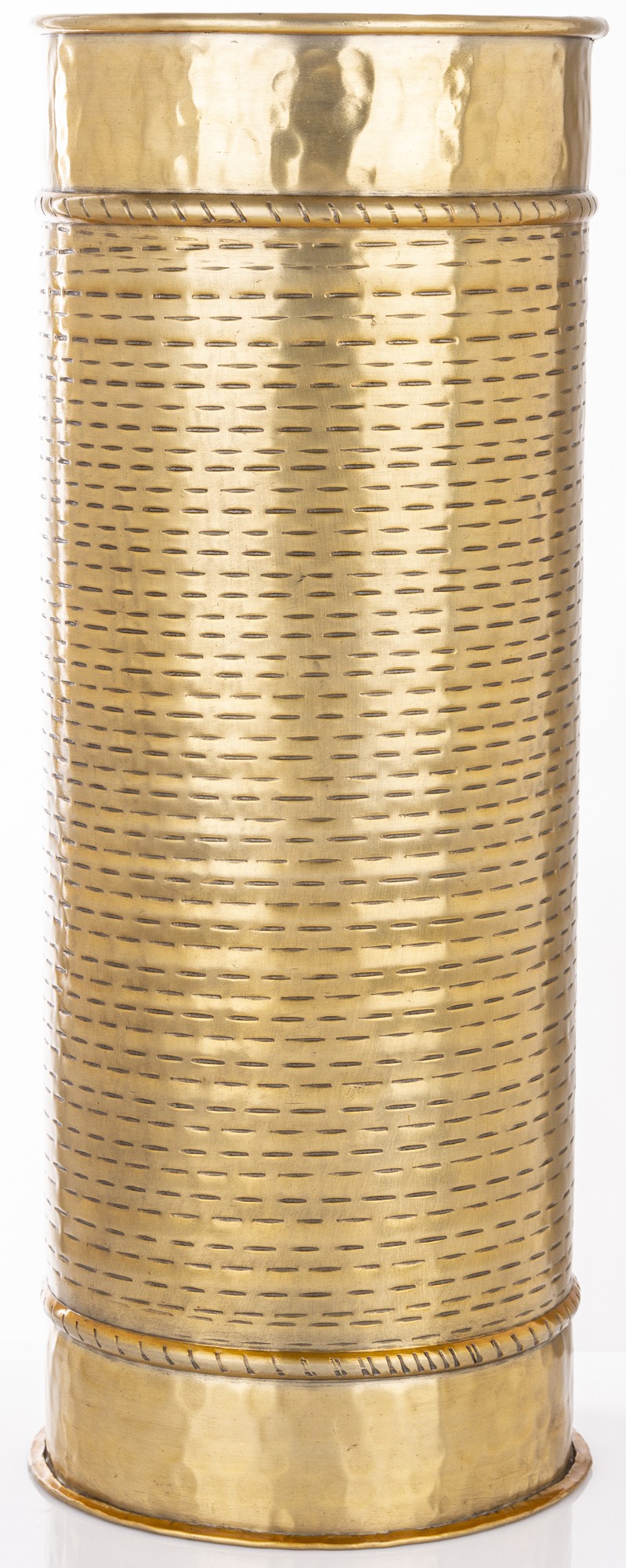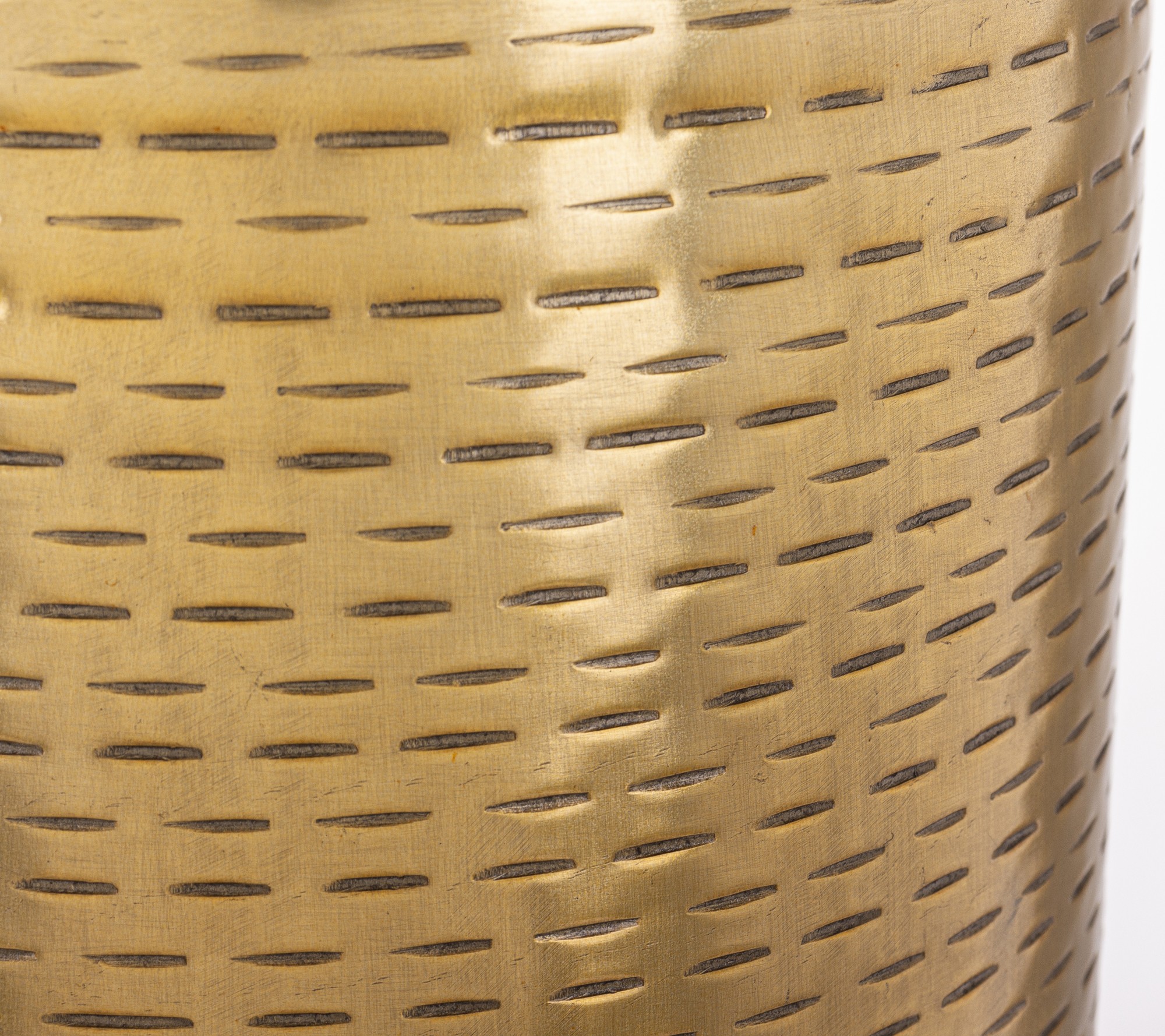 BRASS WEAVE to parasolnik, który łączy funkcjonalność z wyrafinowanym designem. Wykonany z metalu w eleganckim, mosiężnym odcieniu, zachwyca dekoracyjną plecioną fakturą oraz subtelnym młotkowaniem, które nadaje mu unikatowego charakteru. Gładkie, lekko rozszerzane krawędzie u góry i u dołu tworzą harmonijny kontrast z bogatą strukturą środkowej części.
