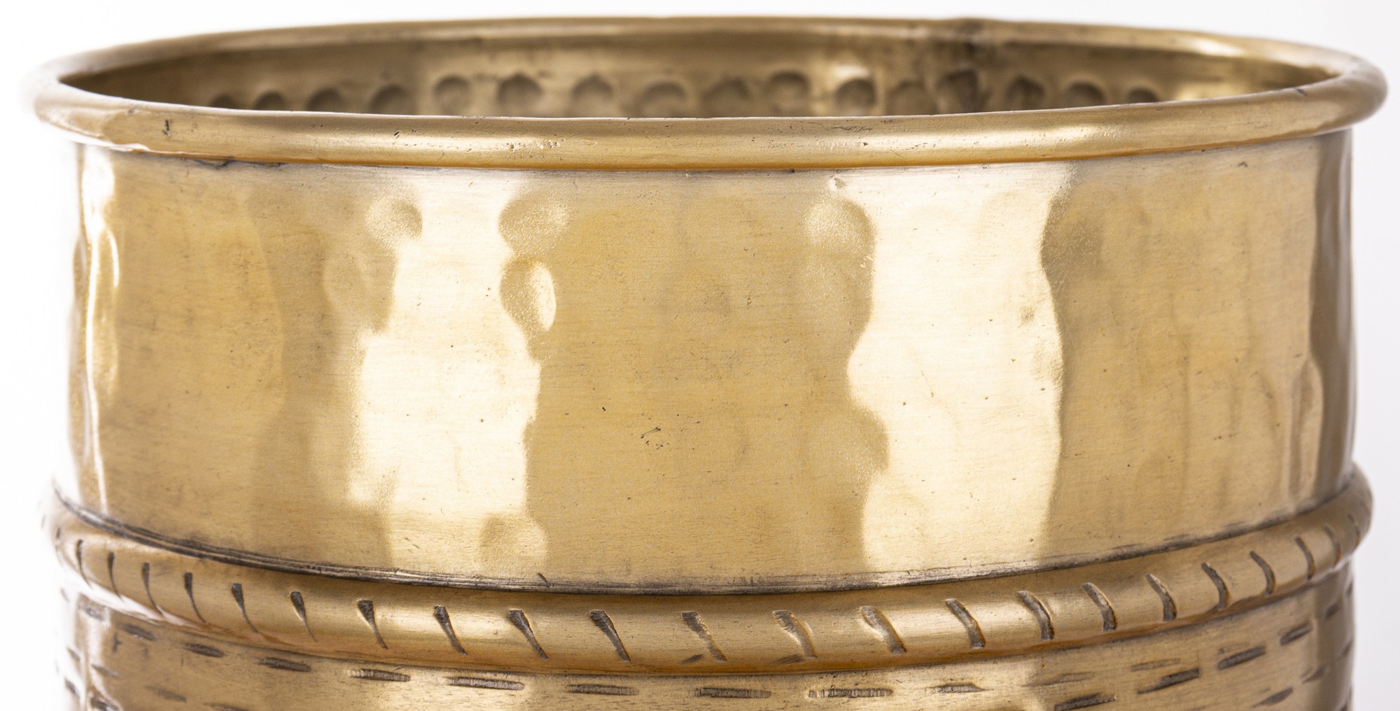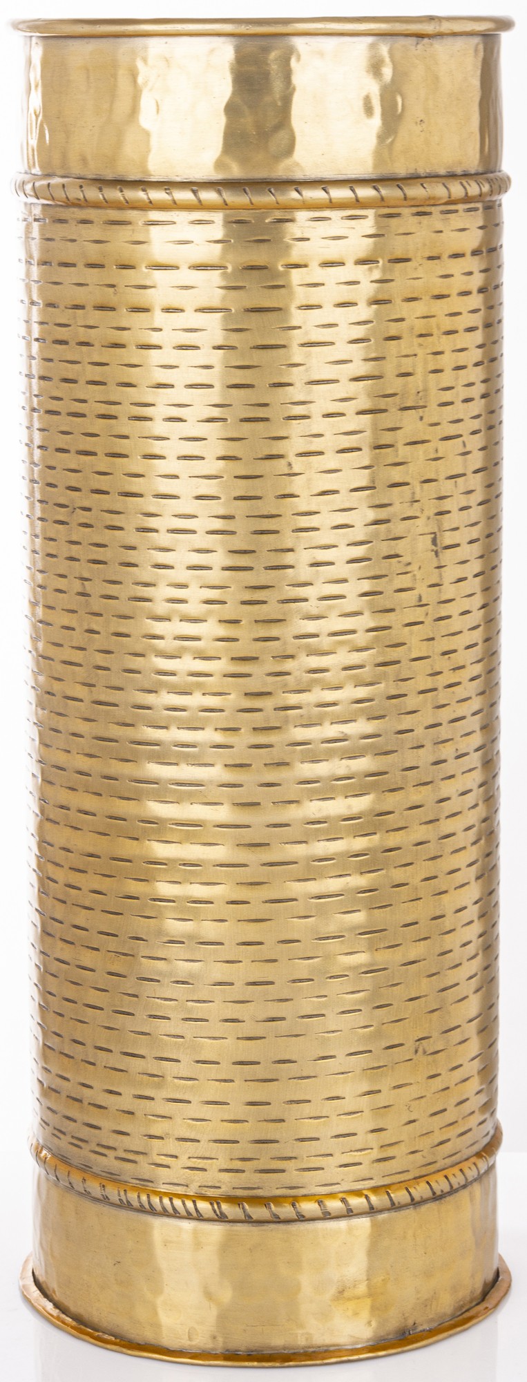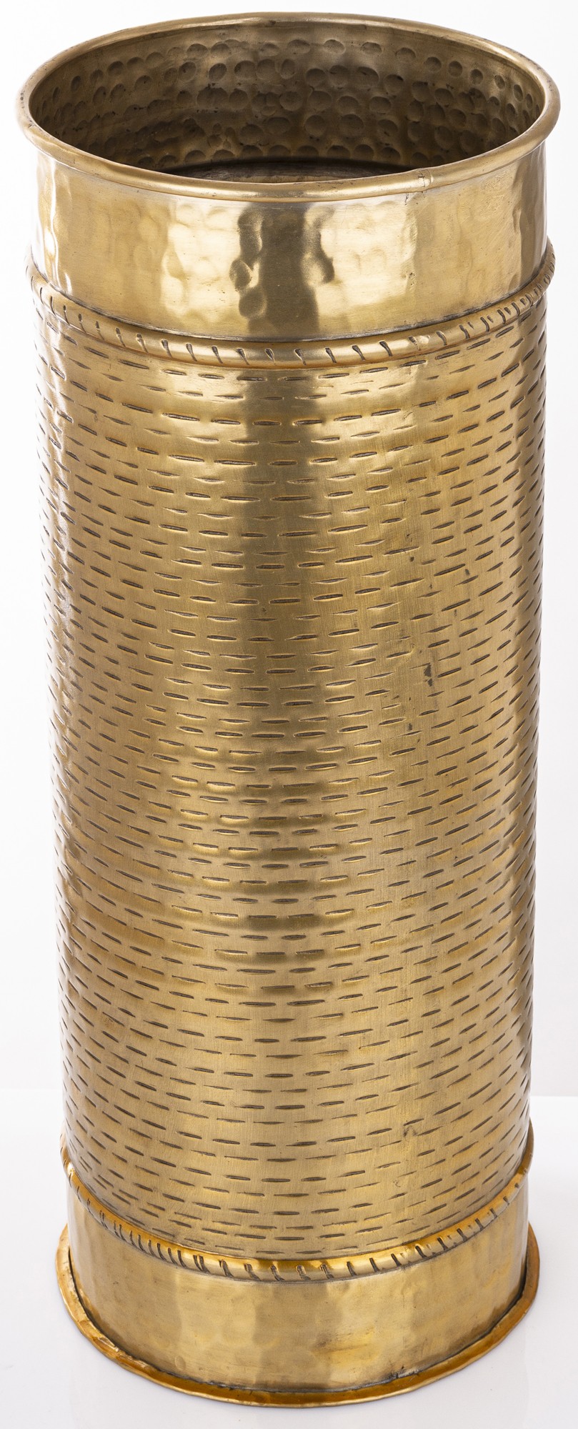 BRASS WEAVE to parasolnik, który łączy funkcjonalność z wyrafinowanym designem. Wykonany z metalu w eleganckim, mosiężnym odcieniu, zachwyca dekoracyjną plecioną fakturą oraz subtelnym młotkowaniem, które nadaje mu unikatowego charakteru. Gładkie, lekko rozszerzane krawędzie u góry i u dołu tworzą harmonijny kontrast z bogatą strukturą środkowej części.