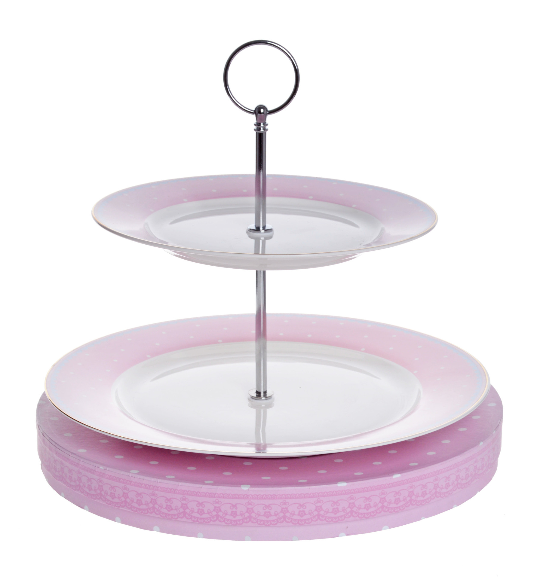 Dwupoziomowa patera na ciasta wykonana z porcelany KENIZ, z metalowym uchwytem na górze. Patera ma dwa talerze w kolorze różowym z białymi kropkami, umieszczone jeden nad drugim. Idealna do serwowania ciast, ciasteczek i innych słodkości podczas przyjęć i spotkań towarzyskich.