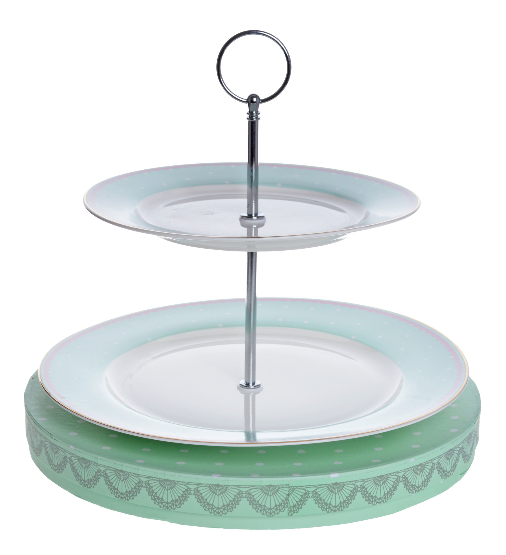 Dwupoziomowa patera KORID na ciasta wykonana z porcelany, z metalowym uchwytem na górze. Patera ma dwa talerze w kolorze zielonym z białymi kropkami, umieszczone jeden nad drugim. Idealna do serwowania ciast, ciasteczek i innych słodkości podczas przyjęć i spotkań towarzyskich.
