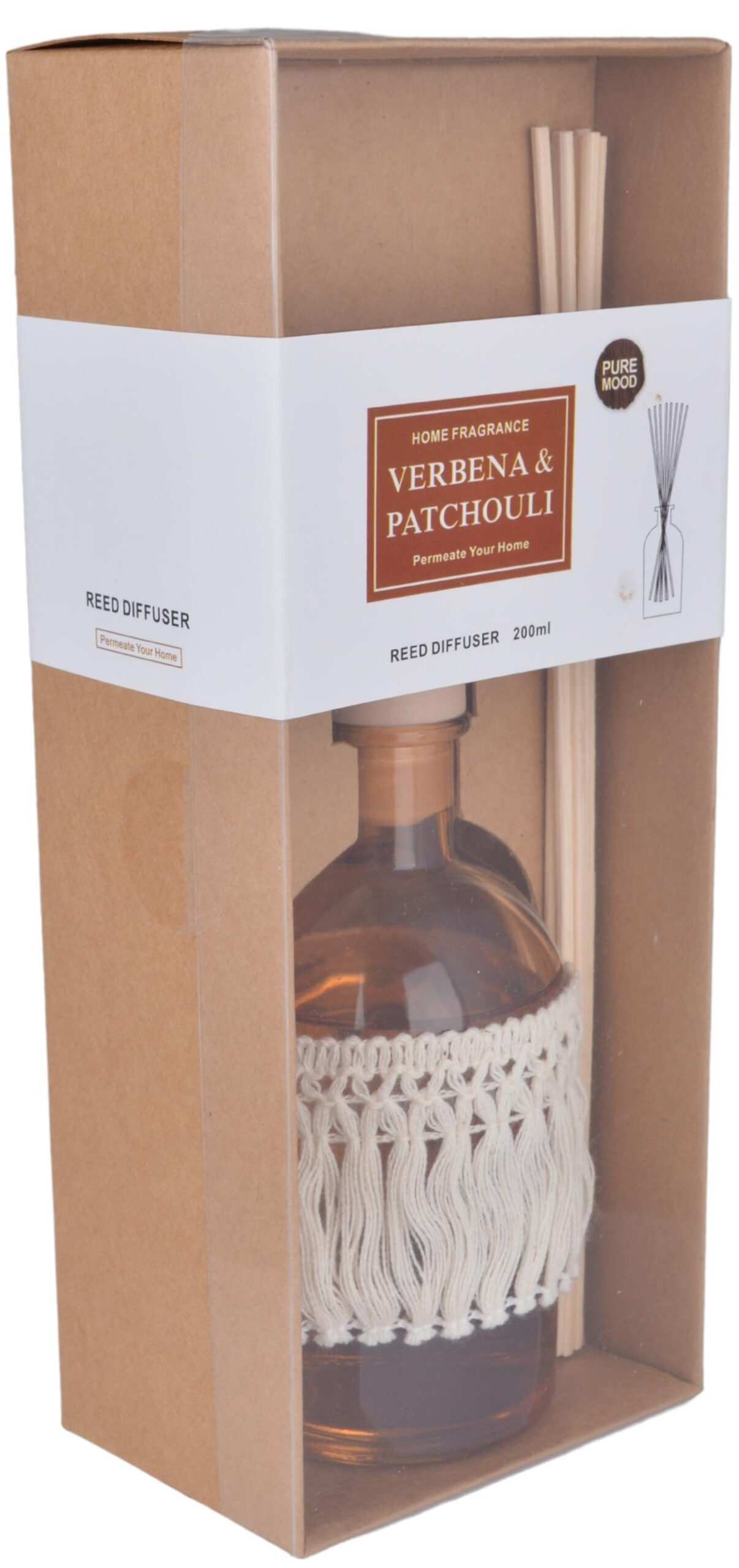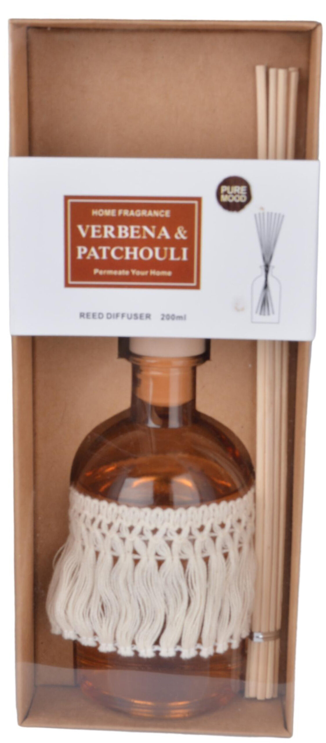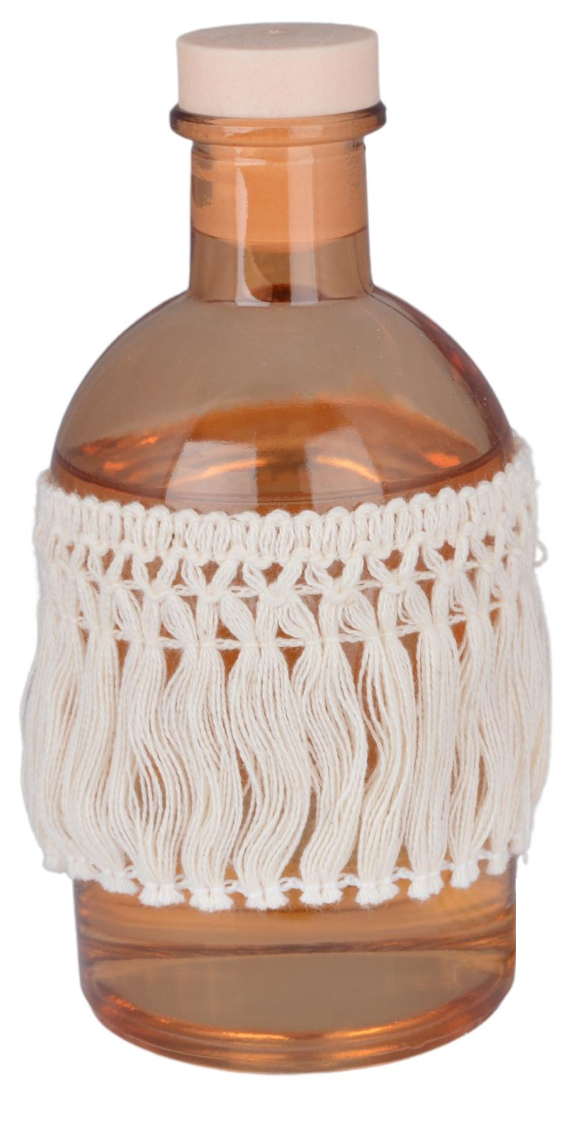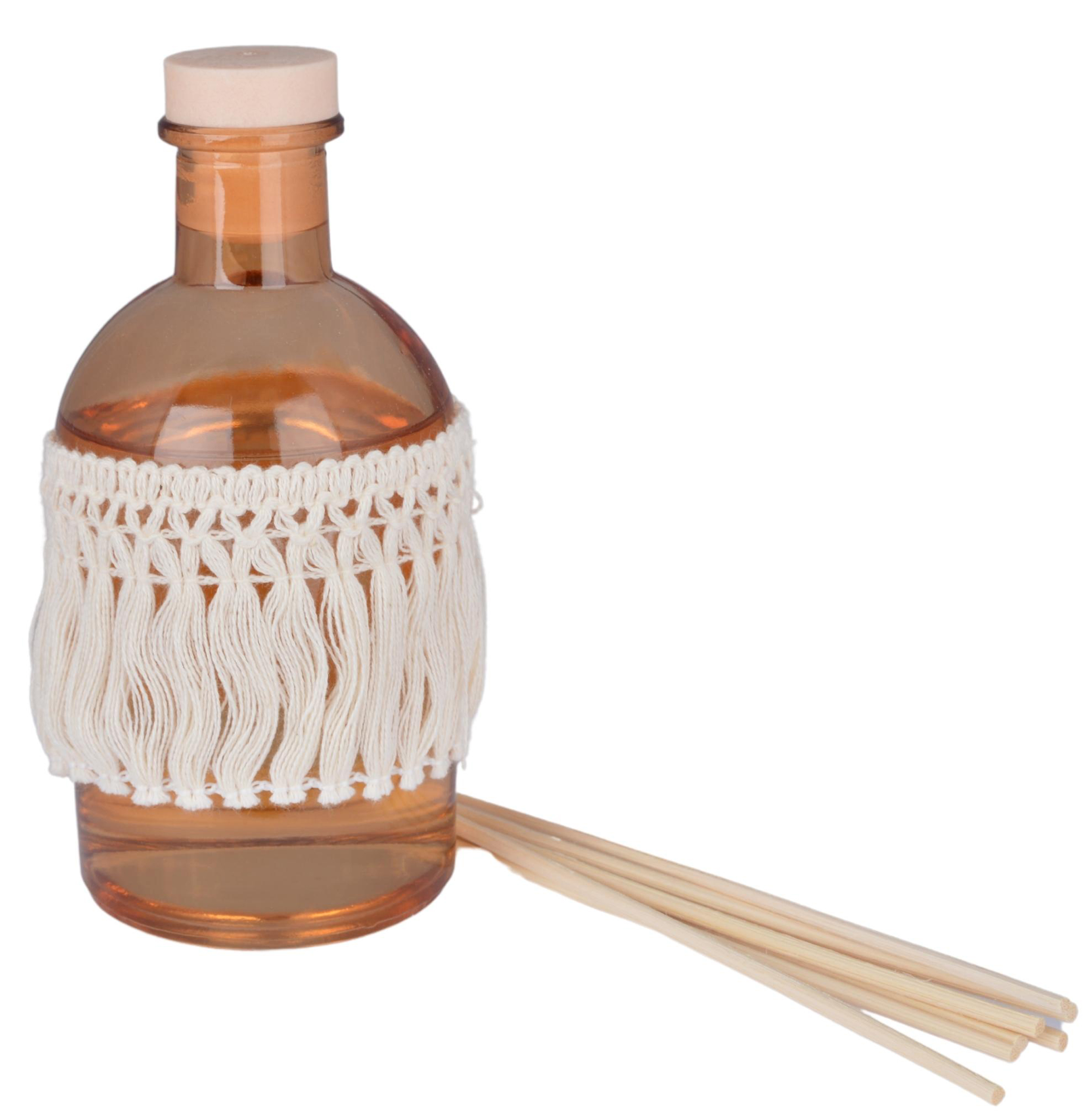 Ten wyjątkowy dyfuzor zapachowy to połączenie naturalnego aromatu i dekoracyjnej formy. W eleganckim kartonowym opakowaniu znajduje się szklany flakon w bursztynowym odcieniu, ozdobiony ręcznie plecioną makramą w kolorze ecru – detal, który dodaje mu boho-charakteru i sprawia, że staje się ozdobą samą w sobie.