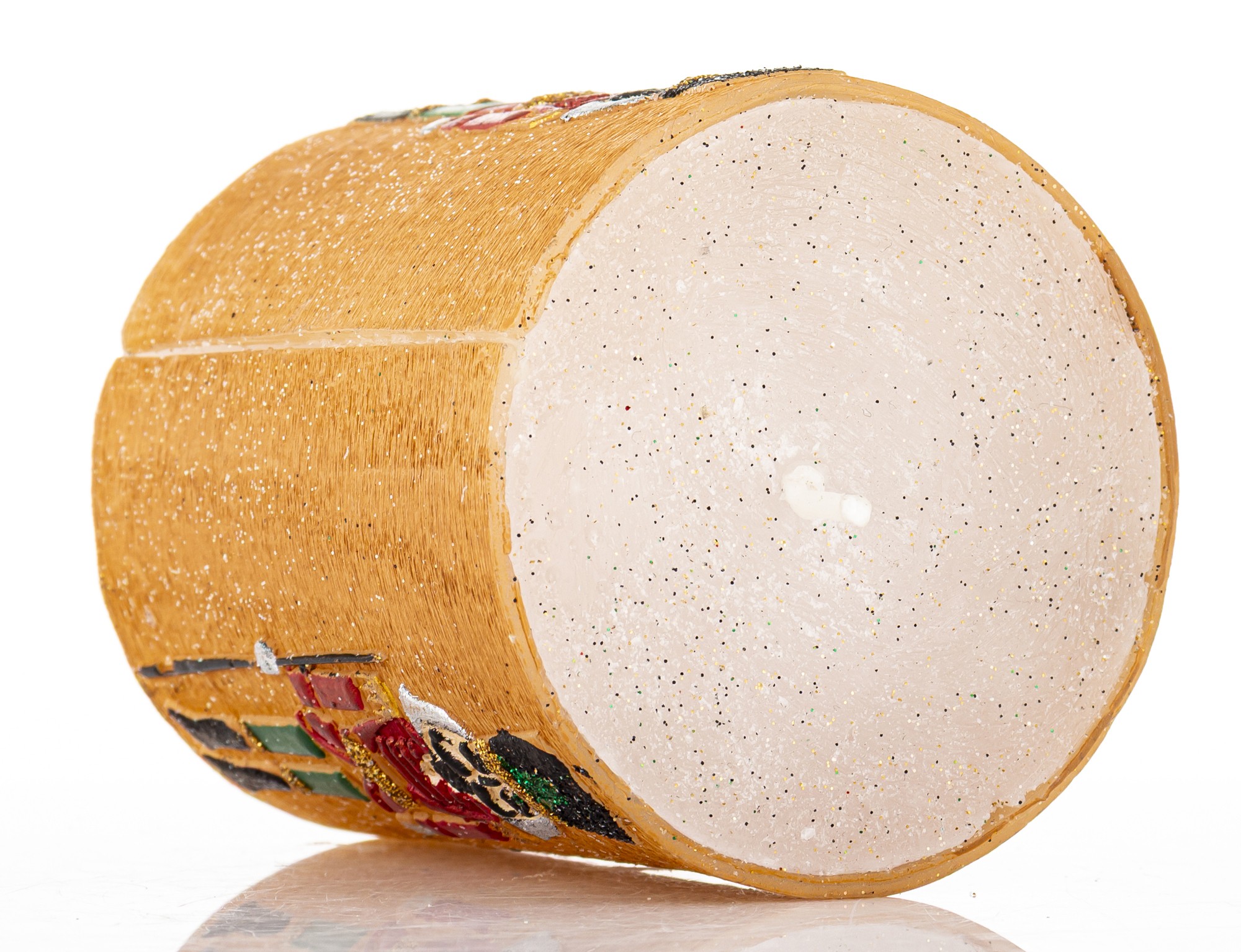 Świeca DZIADEK to hołd dla tradycji i świątecznej elegancji. Wykonana z wysokiej jakości parafiny, w formie małego walca, ozdobiona została trójwymiarowym wizerunkiem klasycznego dziadka do orzechów – w czerwono-zielonym mundurze, z czarnym wysokim kapeluszem, białymi włosami i złotymi detalami. Całość utrzymana jest w ciepłej, brązowej tonacji, która dodaje kompozycji głębi i szlachetności.