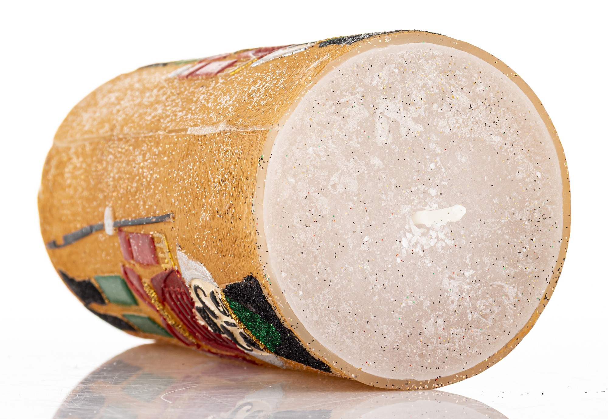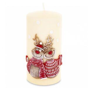 Świeca DZIADEK to hołd dla tradycji i świątecznej elegancji. Wykonana z wysokiej jakości parafiny, w formie średniego walca, ozdobiona została trójwymiarowym wizerunkiem klasycznego dziadka do orzechów – w czerwono-zielonym mundurze, z czarnym wysokim kapeluszem, białymi włosami i złotymi detalami. Całość utrzymana jest w ciepłej, brązowej tonacji, która dodaje kompozycji głębi i szlachetności.