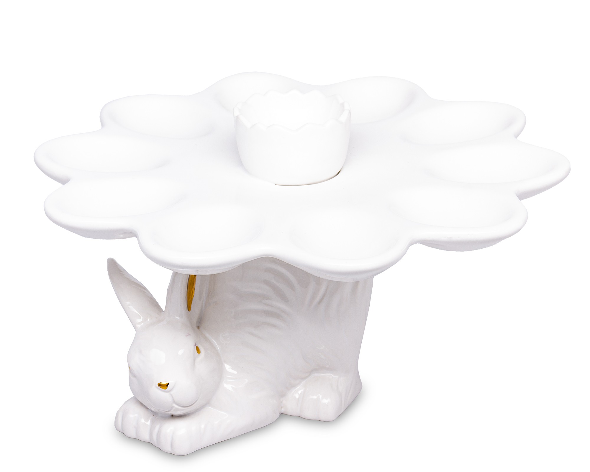 Podstawka Na Jajka Z Zajączkiem DECO to ceramiczna patera w kształcie kwiatka, wsparta na figurze białego zajączka z złotymi detalami. Idealna do serwowania jajek, przekąsek i dipów podczas wielkanocnych spotkań.