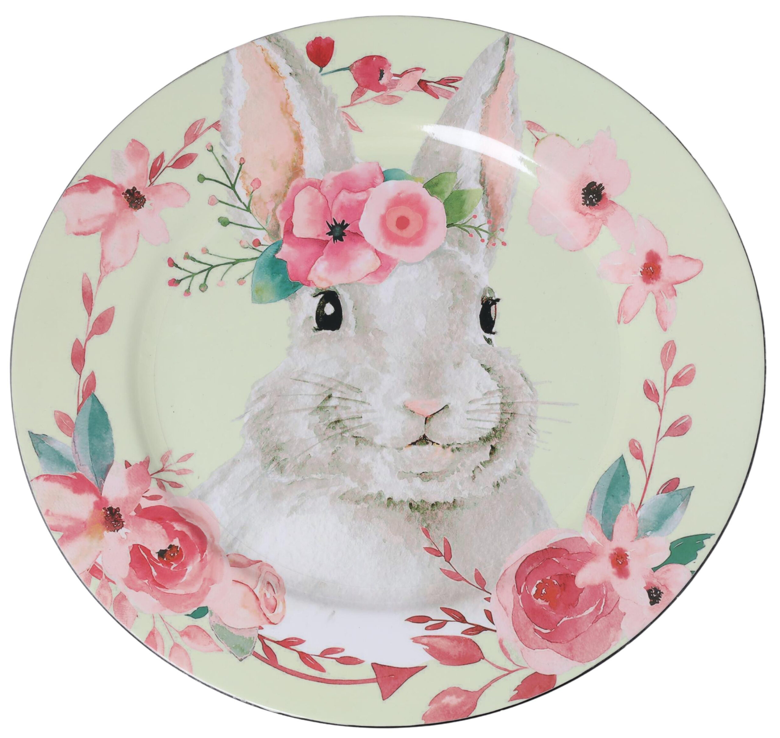 Podtalerz zielony z zajączkiem BISTKE to wyjątkowy element dekoracyjny, który doda uroku każdemu stołowi. Na jasnym, zielonym tle znajduje się realistyczny wizerunek białego zajączka z dużymi, czarnymi oczami i różowym noskiem. Zajączek jest ozdobiony kwiatowym wieńcem na głowie, składającym się z różowych i czerwonych kwiatów oraz zielonych liści. Dookoła talerza rozmieszczone są dodatkowe kwiatowe motywy, które harmonizują z głównym obrazem. Ten podtalerz jest idealny na wiosenne i wielkanocne dekoracje, wprowadzając radosny i świeży akcent do każdego wnętrza.