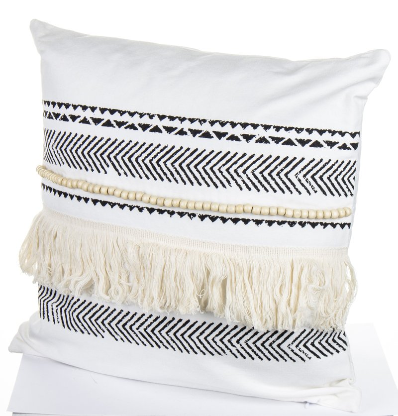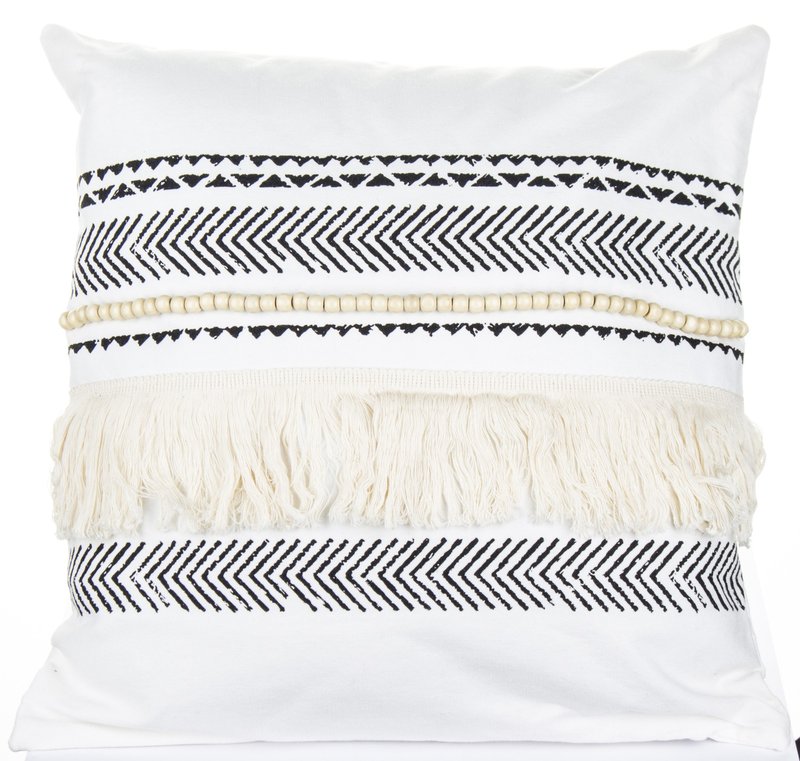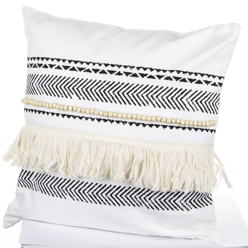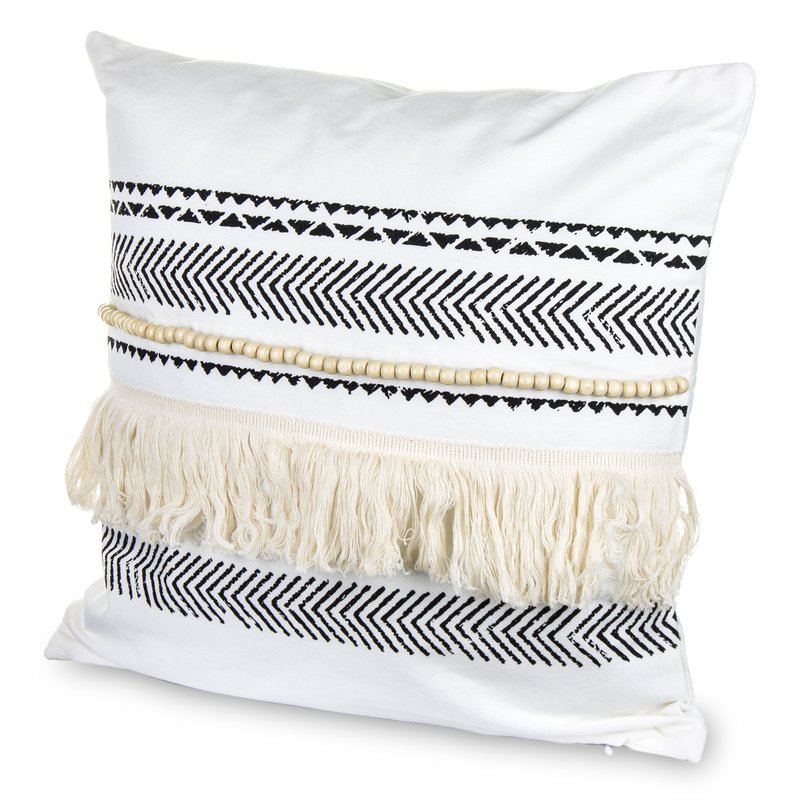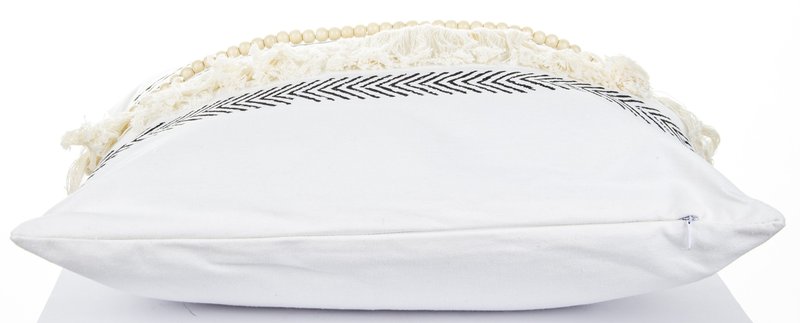 Poduszka Perpetua w kolorze białym, z dodatkowymi kolorami czarnym i kremowym, to niezwykle stylowy element dekoracyjny w stylu boho. Jest to doskonały wybór dla osób, które cenią sobie wyjątkowość i oryginalność w swoim otoczeniu. Poduszka została ozdobiona kremowymi farfoclami, co dodaje jej dodatkowego uroku i sprawia, że prezentuje się niezwykle efektownie.