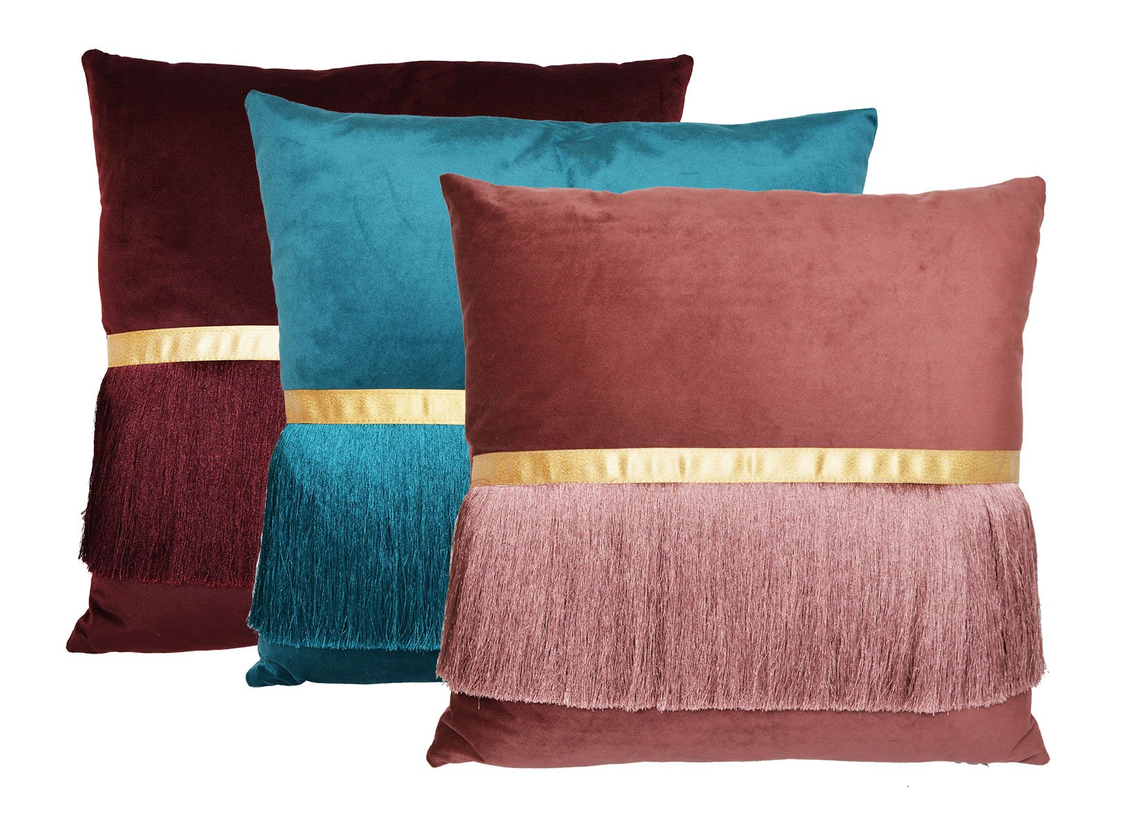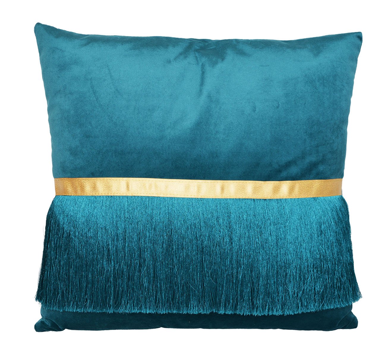 Turkusowa poduszka dekoracyjna PLUVEK z ozdobnym złotym paskiem i frędzlami, idealna do eleganckich i stylowych wnętrz.