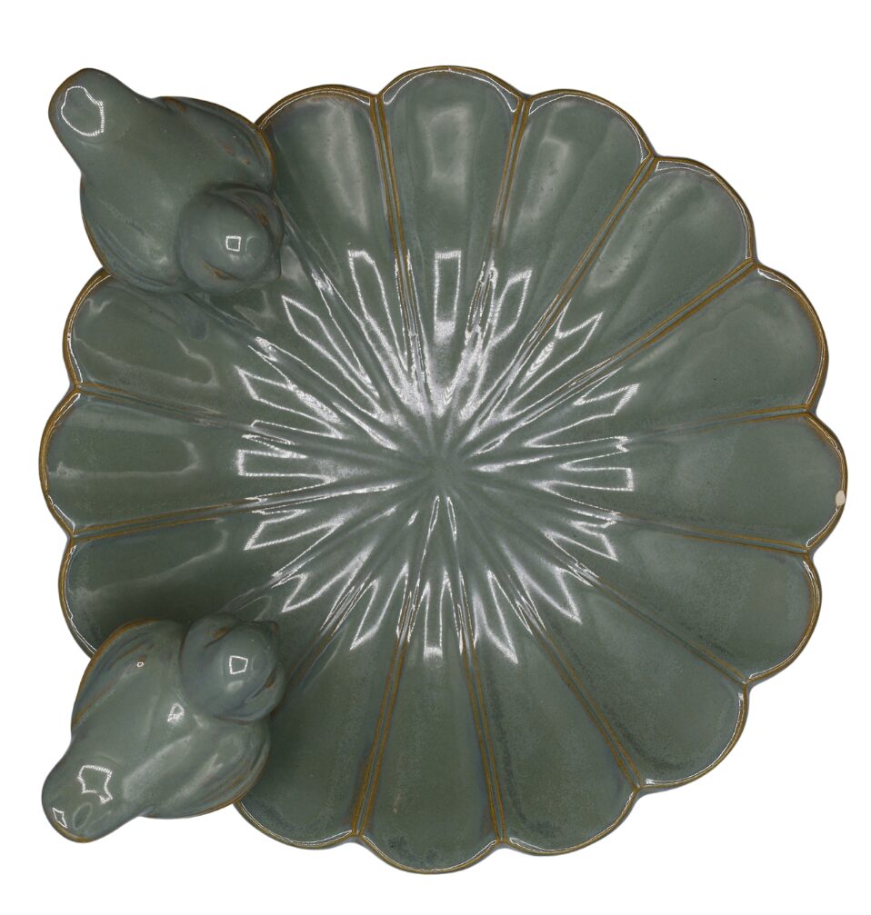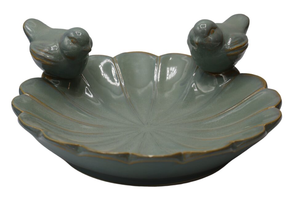 Duże miętowe ceramiczne poidełko SLOBAN z dwiema uroczymi figurkami ptaszków na krawędzi. Idealna dekoracja ogrodowa, zapewniająca miejsce do pojenia ptaków i podnosząca estetykę otoczenia.