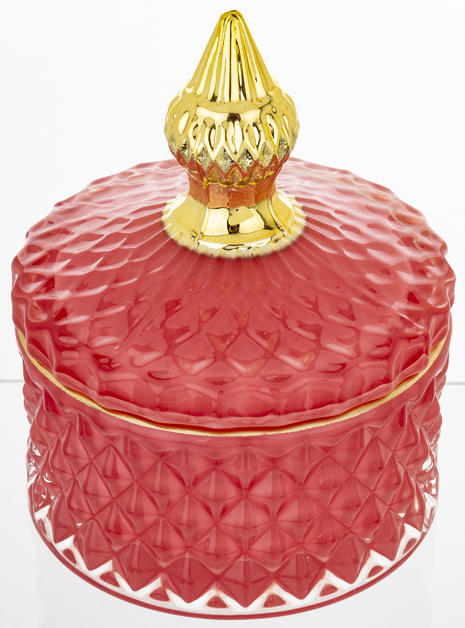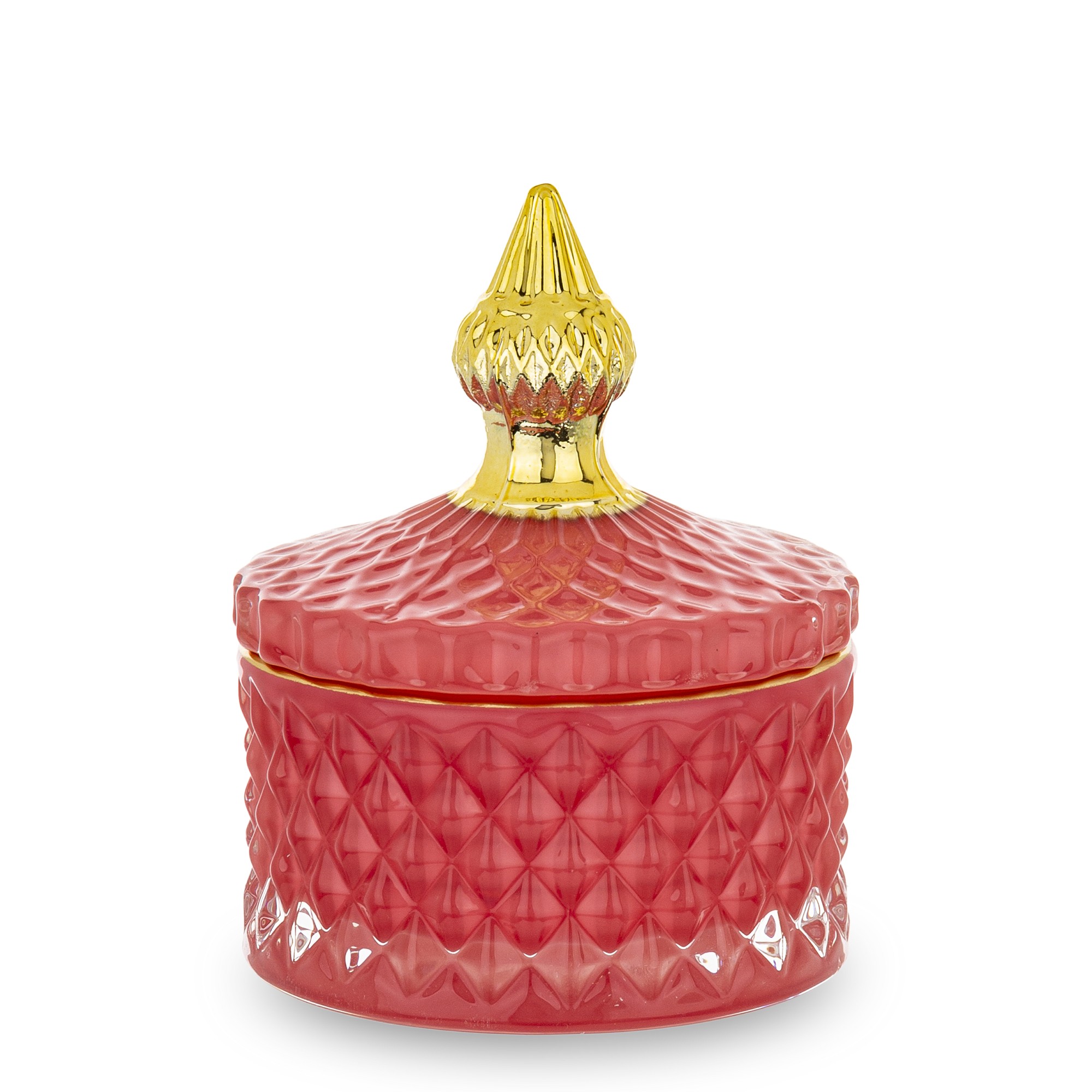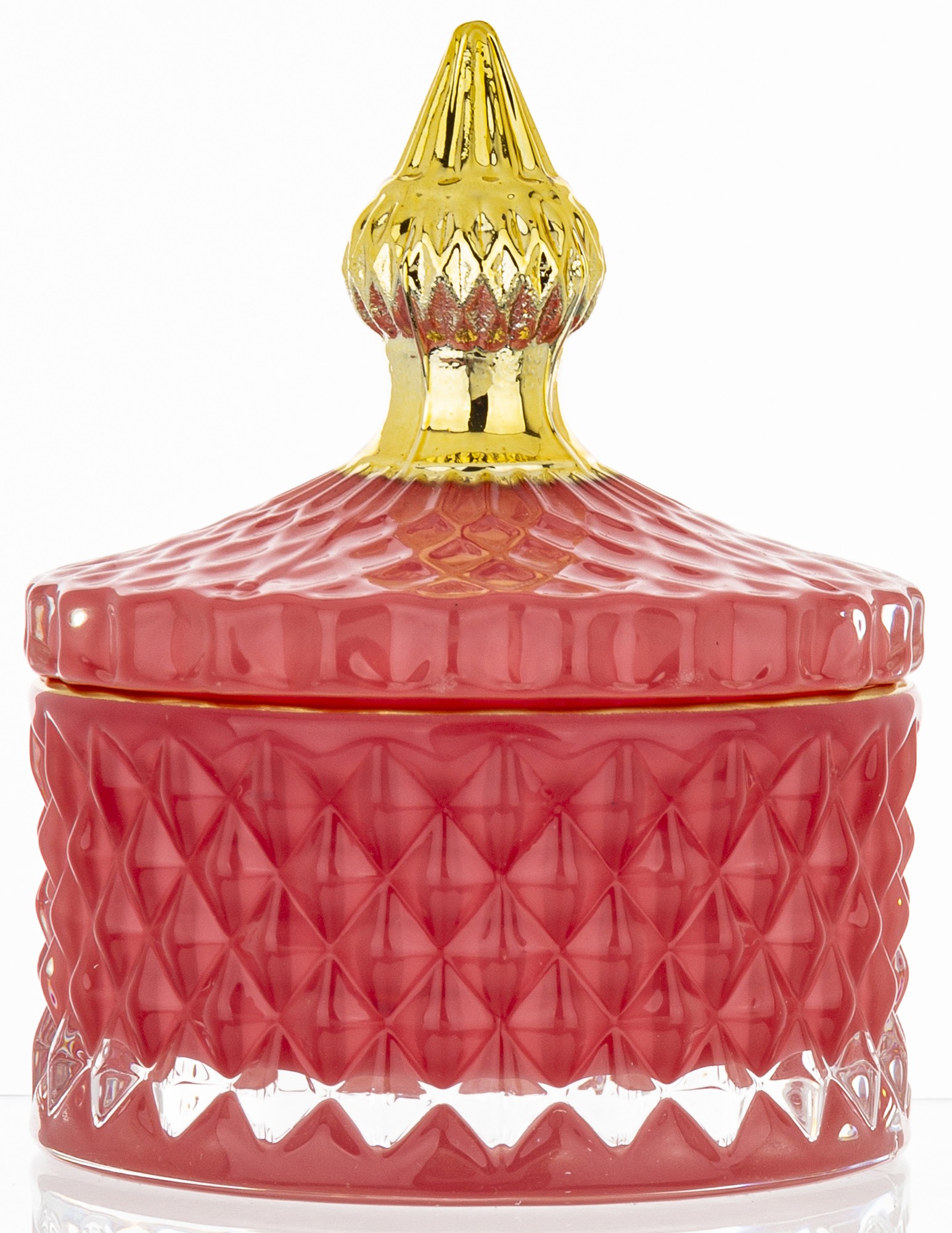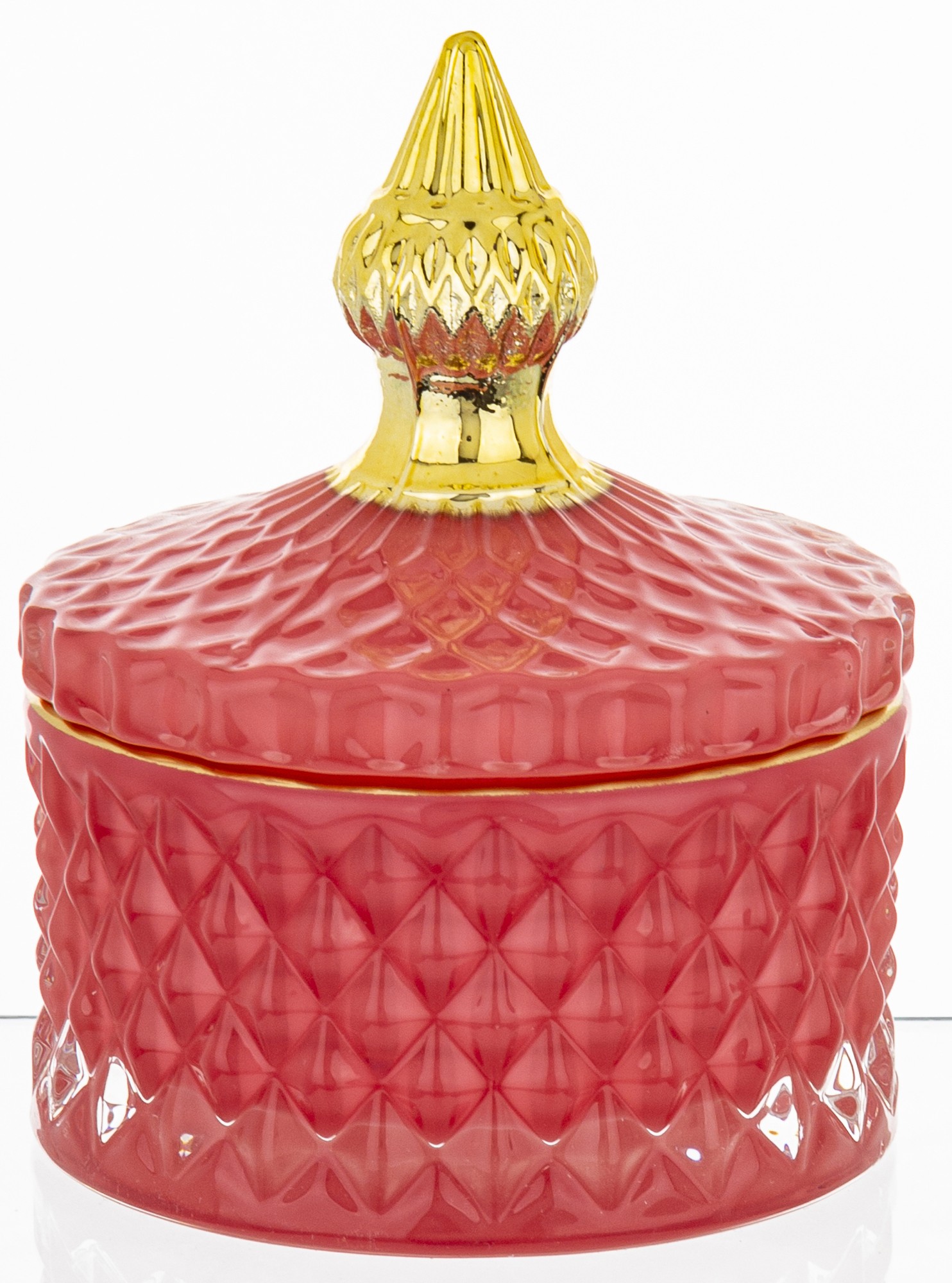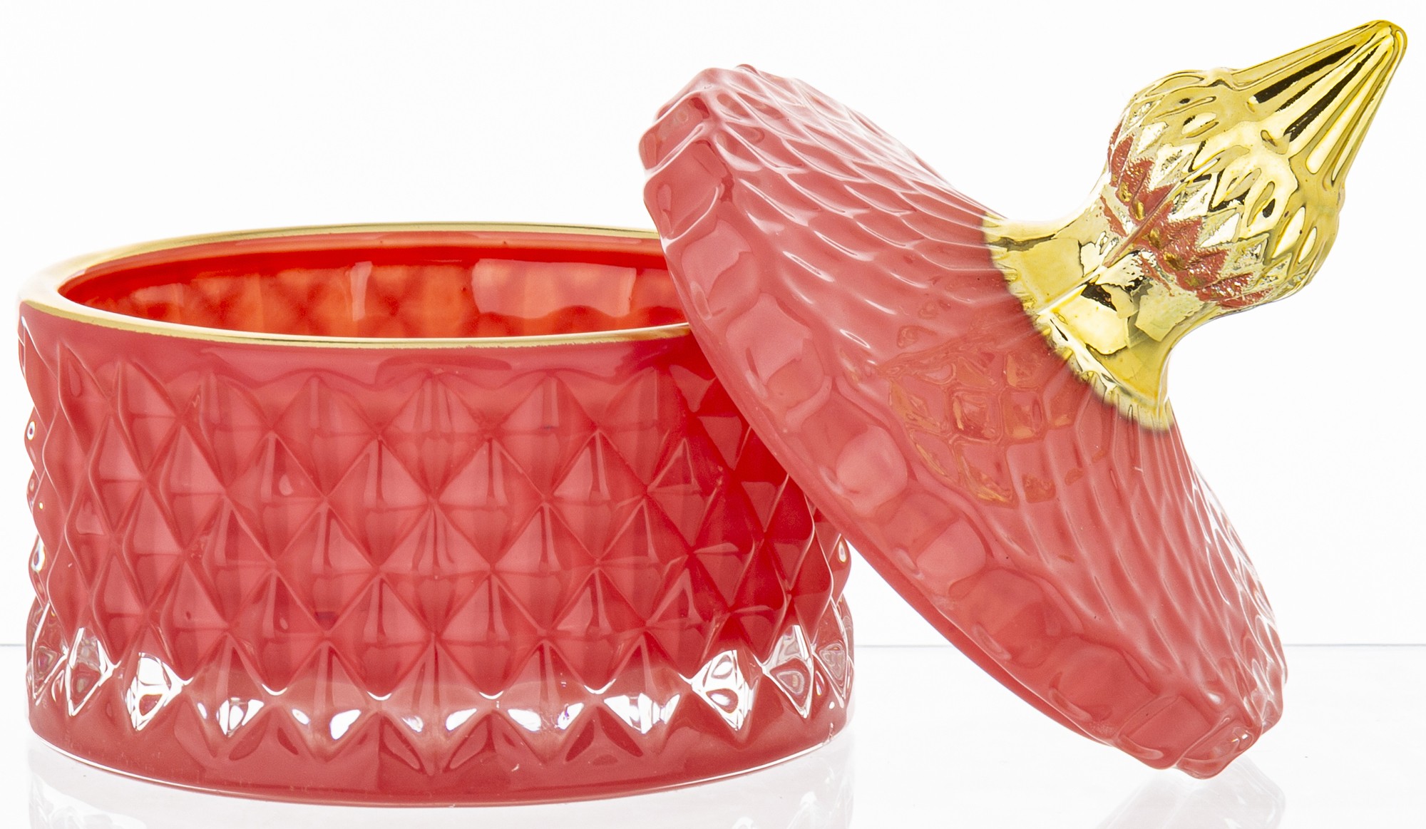 Ten wyjątkowy pojemnik dekoracyjny zachwyca intensywną kolorystyką i eleganckim wykończeniem. Wykonany z materiału o efektownej, diamentowej fakturze w głębokim odcieniu różu, pięknie odbija światło i przyciąga uwagę. Złota pokrywka z ozdobnym, misternie zdobionym uchwytem dodaje całości wyrafinowanego charakteru, tworząc harmonijny kontrast i podkreślając luksusowy styl produktu.