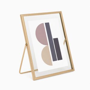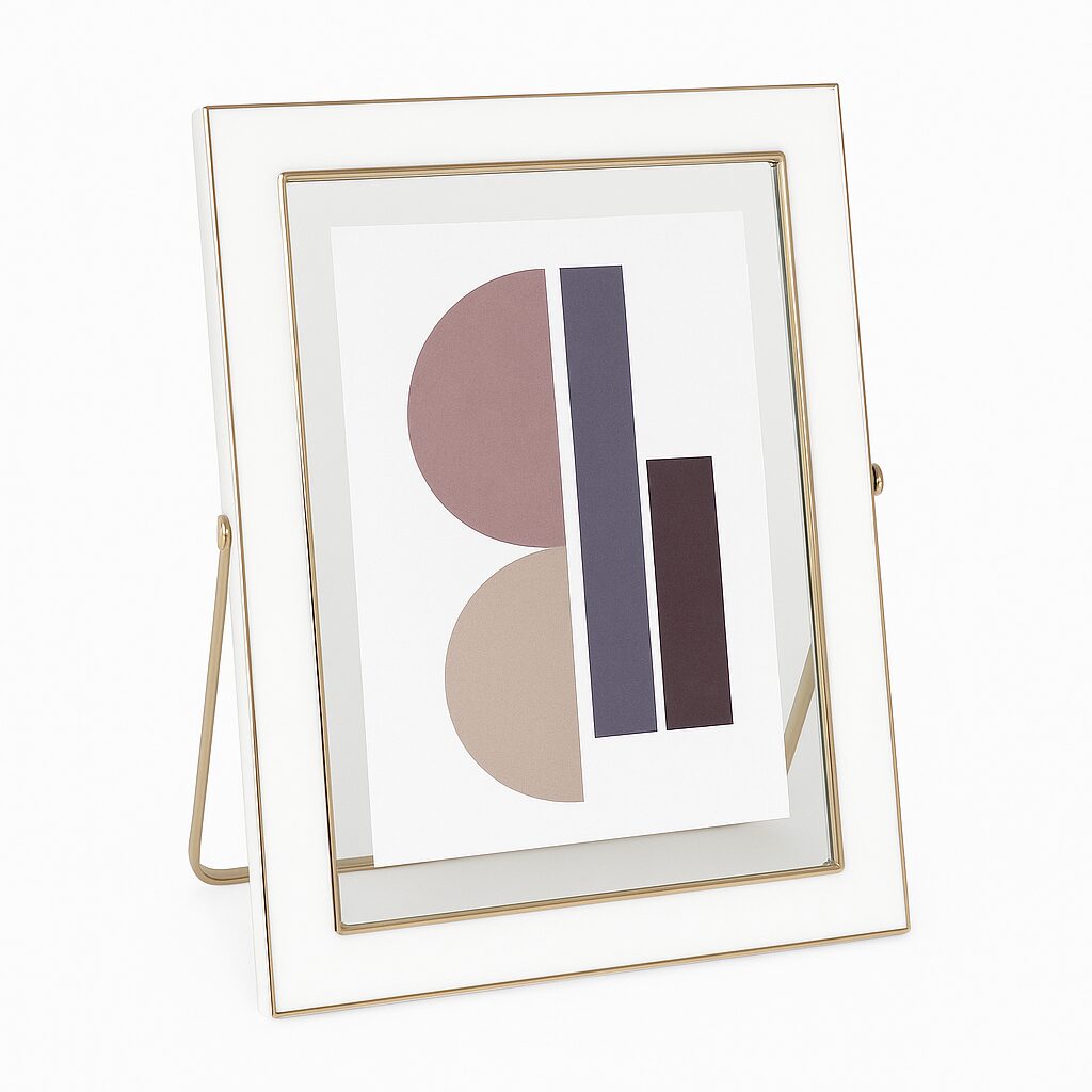 Ramka została wykonana z wysokiej jakości materiałów, a jej minimalistyczny design sprawia, że doskonale komponuje się zarówno z nowoczesnymi, jak i klasycznymi aranżacjami. Z tyłu znajduje się elegancka, złota nóżka, która umożliwia stabilne ustawienie na komodzie, biurku czy półce. Wewnątrz ramki znajduje się abstrakcyjna grafika, którą można łatwo wymienić na ulubione zdjęcie.