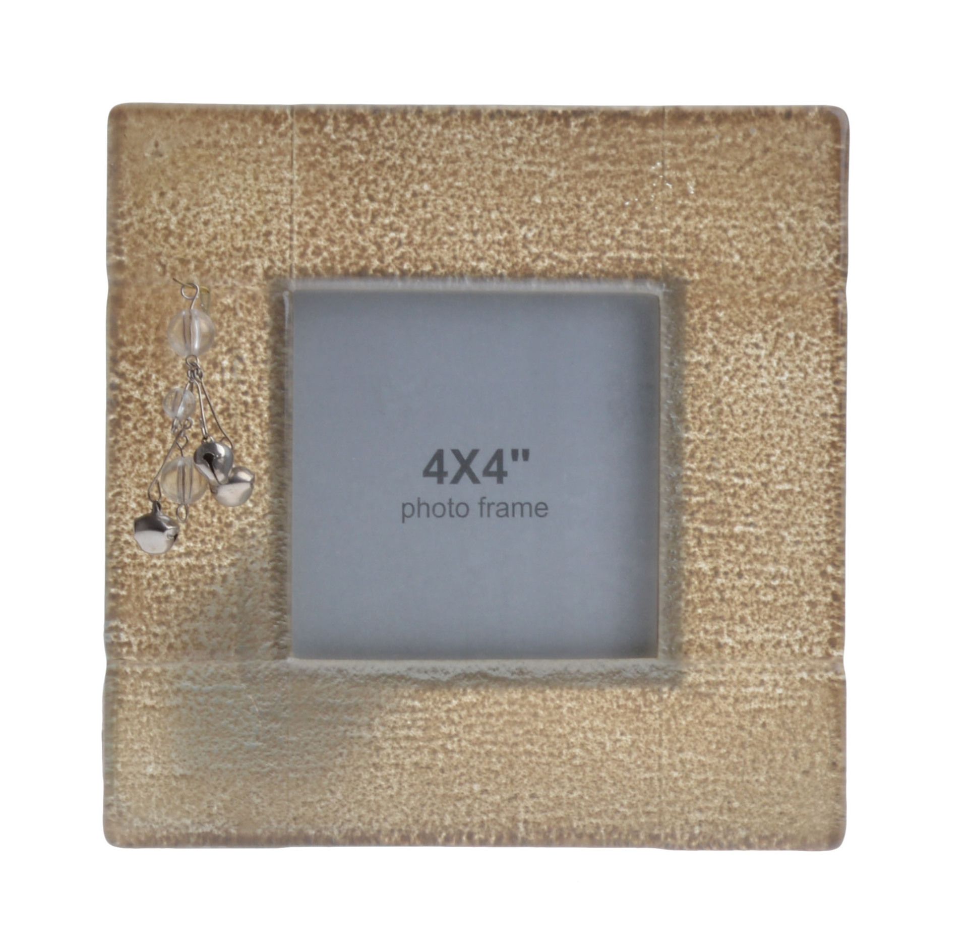 Ramka szklana BOLI mała – kwadratowa ramka na zdjęcie 10×10 cm, z rustykalnym wykończeniem w odcieniu beżu i ozdobnym zawieszeniem z dzwoneczkami. Idealna do wnętrz w stylu boho, vintage lub naturalnym.