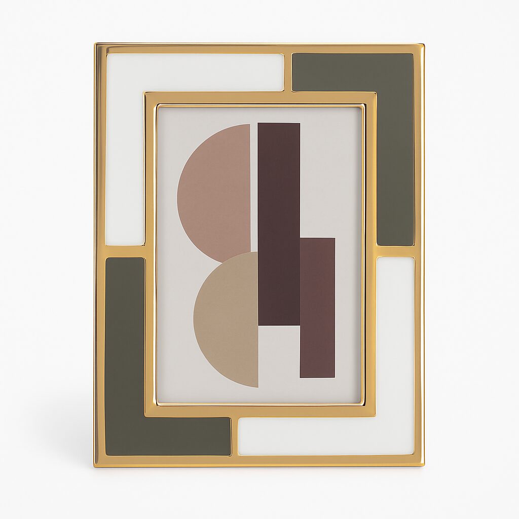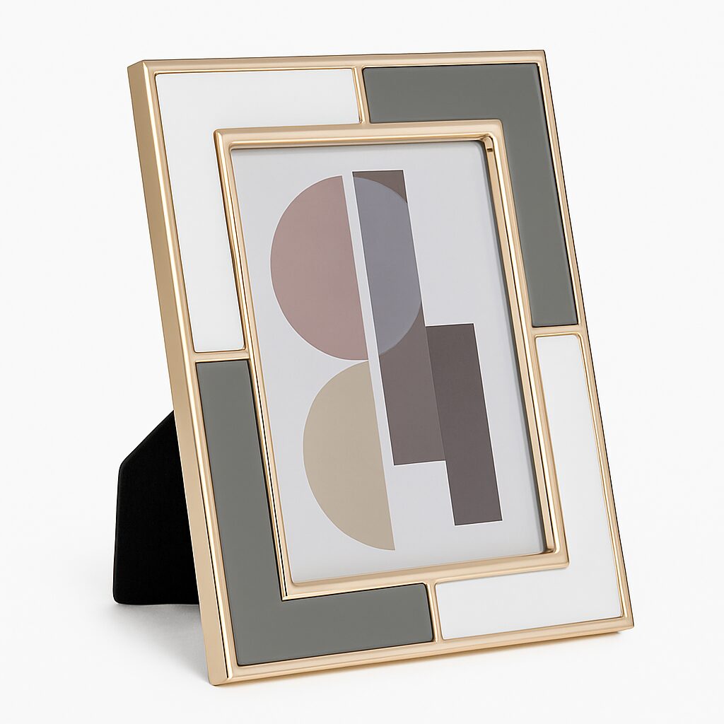 Dodaj do swojego wnętrza nutę wyrafinowanej elegancji z RAMKĄ ZŁOTĄ GRELD Z BIAŁO-SZARYMI ELEMENTAMI w rozmiarze średnim. Jej geometryczny design przyciąga wzrok dzięki połączeniu lśniącego złota z matowymi wstawkami w odcieniach bieli, jasnej i ciemnej szarości. Całość tworzy harmonijną kompozycję, która doskonale podkreśla charakter nowoczesnych i stylowych przestrzeni.