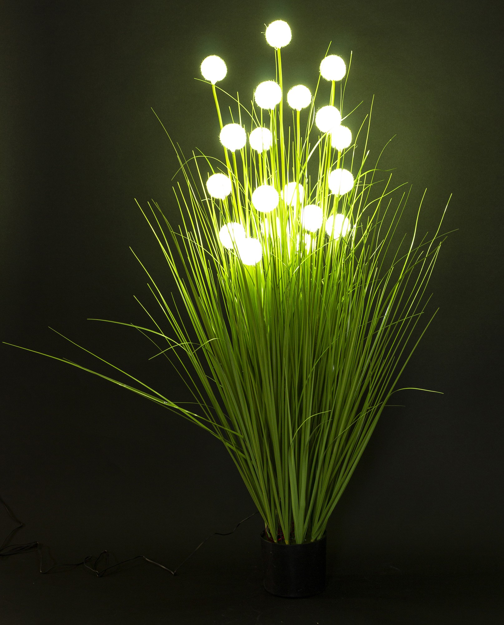Roślina Dekoracyjna Led SILENT BLOOM to minimalistyczna kompozycja, która łączy naturalną formę z subtelnym efektem świetlnym. Długie, smukłe źdźbła trawy przeplatają się z delikatnymi, białymi kulkami przypominającymi kwiatowe pąki, tworząc wizualnie spokojną i harmonijną strukturę. Całość osadzona jest w eleganckiej, czarnej doniczce, która podkreśla nowoczesny charakter dekoracji.