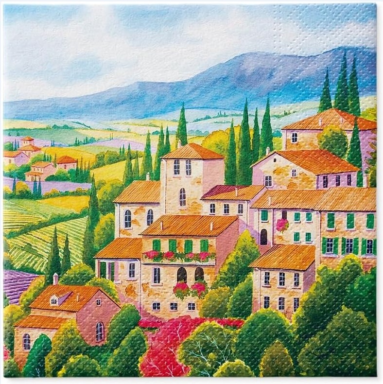 Serwetki Italian Countryside KARIK – sielankowy krajobraz włoskiej wsi z kolorowymi domkami, zielonymi wzgórzami i smukłymi cyprysami. Stylowy dodatek do eleganckich przyjęć i kolacji z włoskim akcentem.