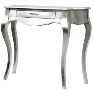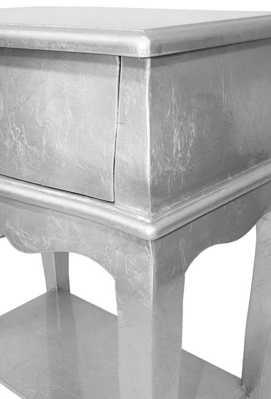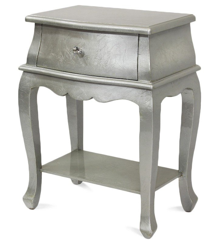 Stolik nocny Fiona z drewna w kolorze srebrnym to elegancki dodatek do pokoju, pasujący do stylu glamour. Posiada jedną szufladę z okrągłym uchwytem oraz dodatkową półkę, na której można trzymać różne drobiazgi.