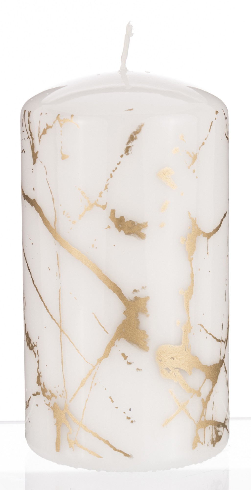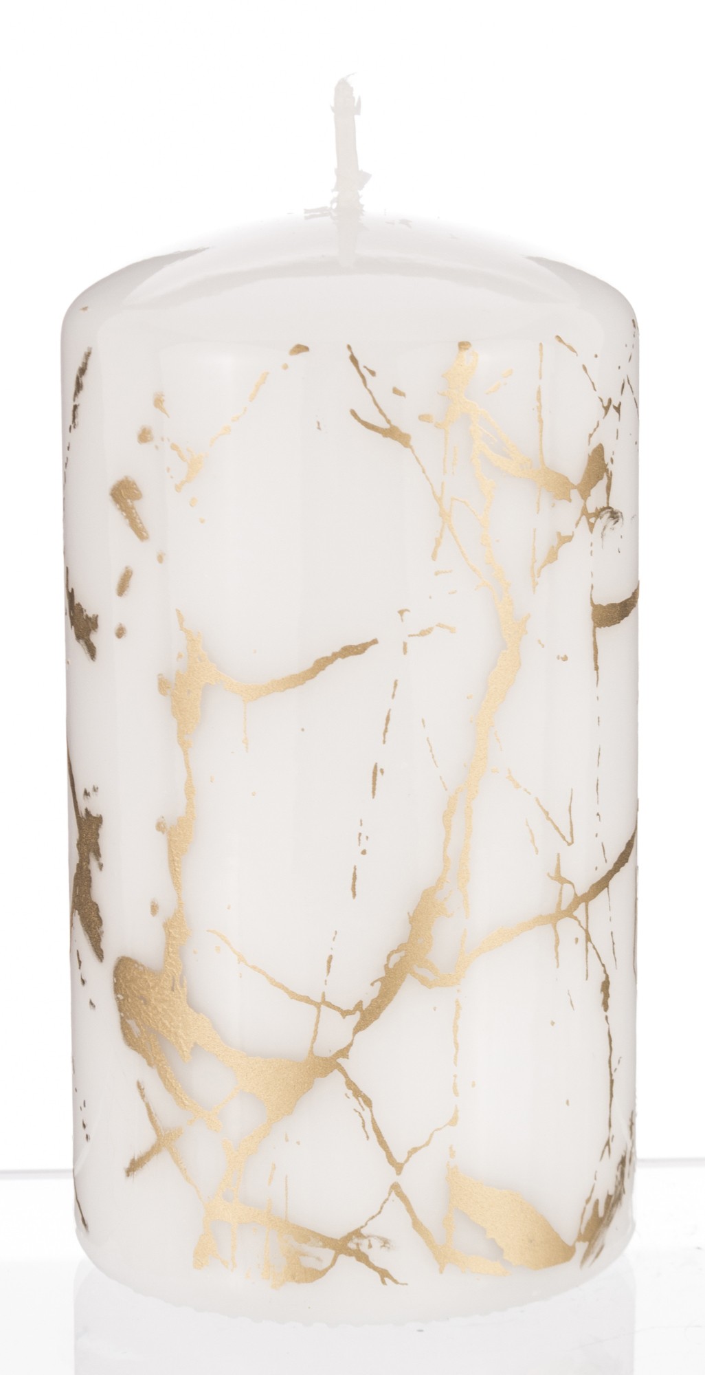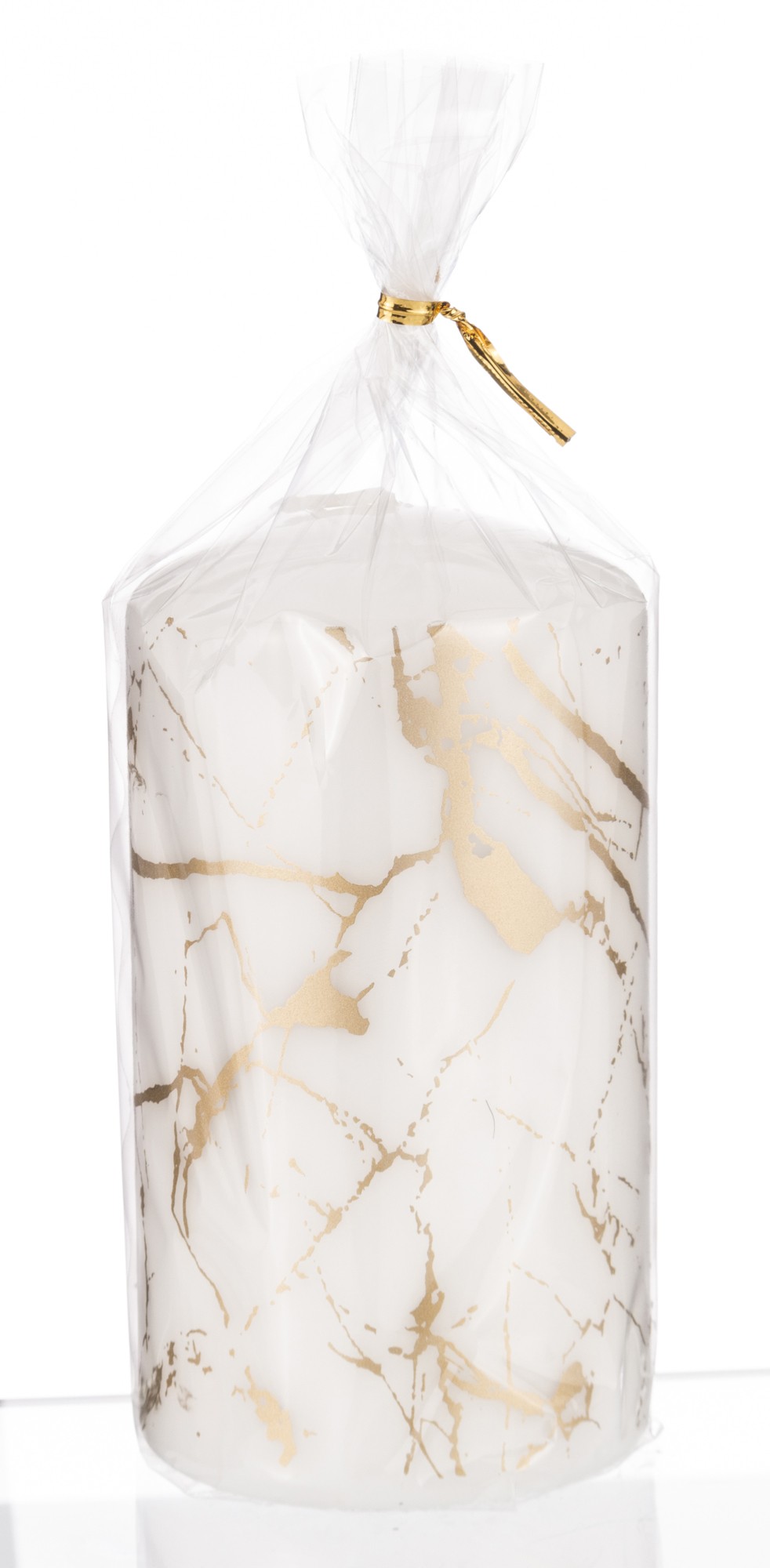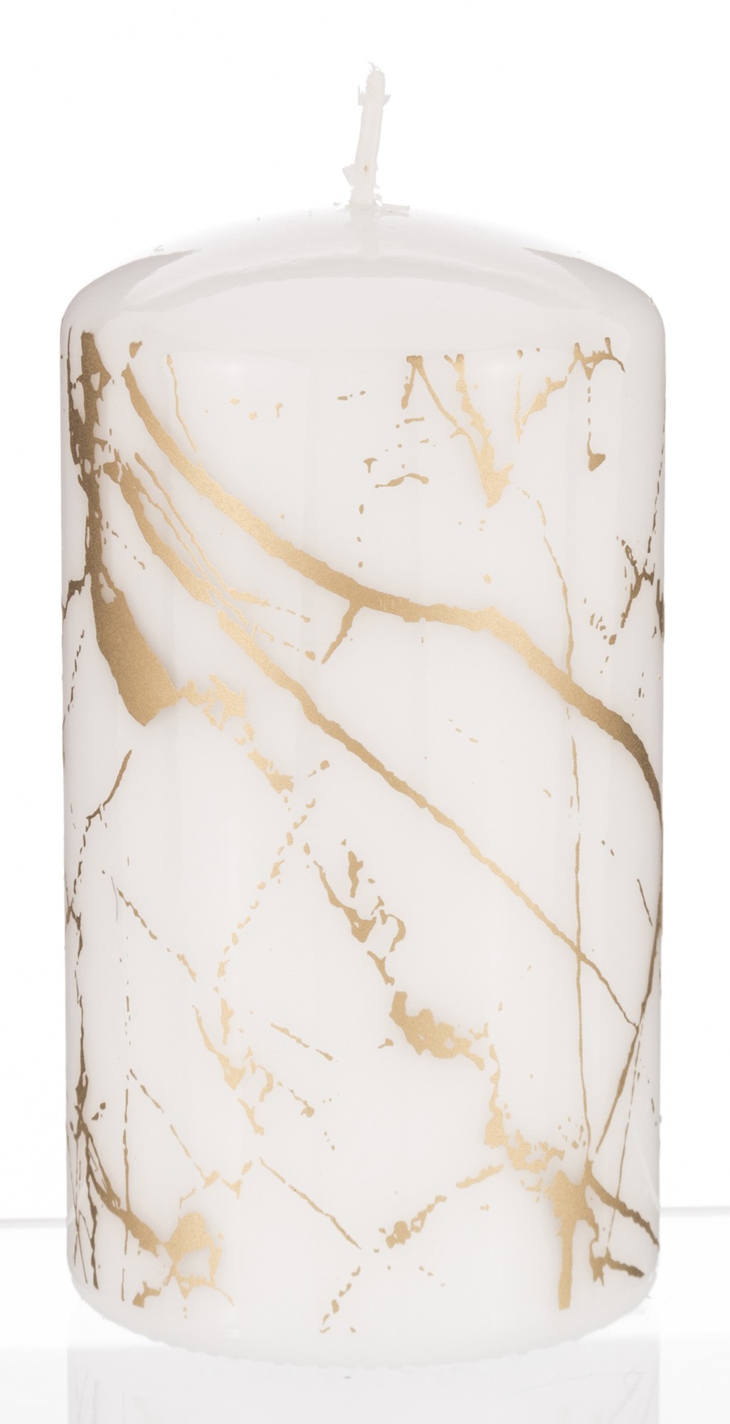 Świeca marmur biało-złota średnia to wyjątkowa ozdoba, która wkomponowuje w Twoje wnętrze elegancję i nowoczesność. Ta średniej wielkości świeca o wysokości 15 cm łączy delikatny kolor biały z efektem marmuru w złotych dodatkach. Została starannie wykonana z trwałej parafiny, co nie tylko zapewnia jej trwałość, ale także gwarantuje długi czas palenia wynoszący średnio 75 godzin. Dzięki swojemu wyjątkowemu wzornictwu, ta świeca doskonale pasuje do różnych stylów wnętrz i pomaga podkreślić nowoczesny charakter. Możesz ją umieścić w eleganckim świeczniku, postawić w lampionie lub na ozdobnej tacy, gdzie jej modny szablon marmuru staje się centralnym punktem dekoracji.