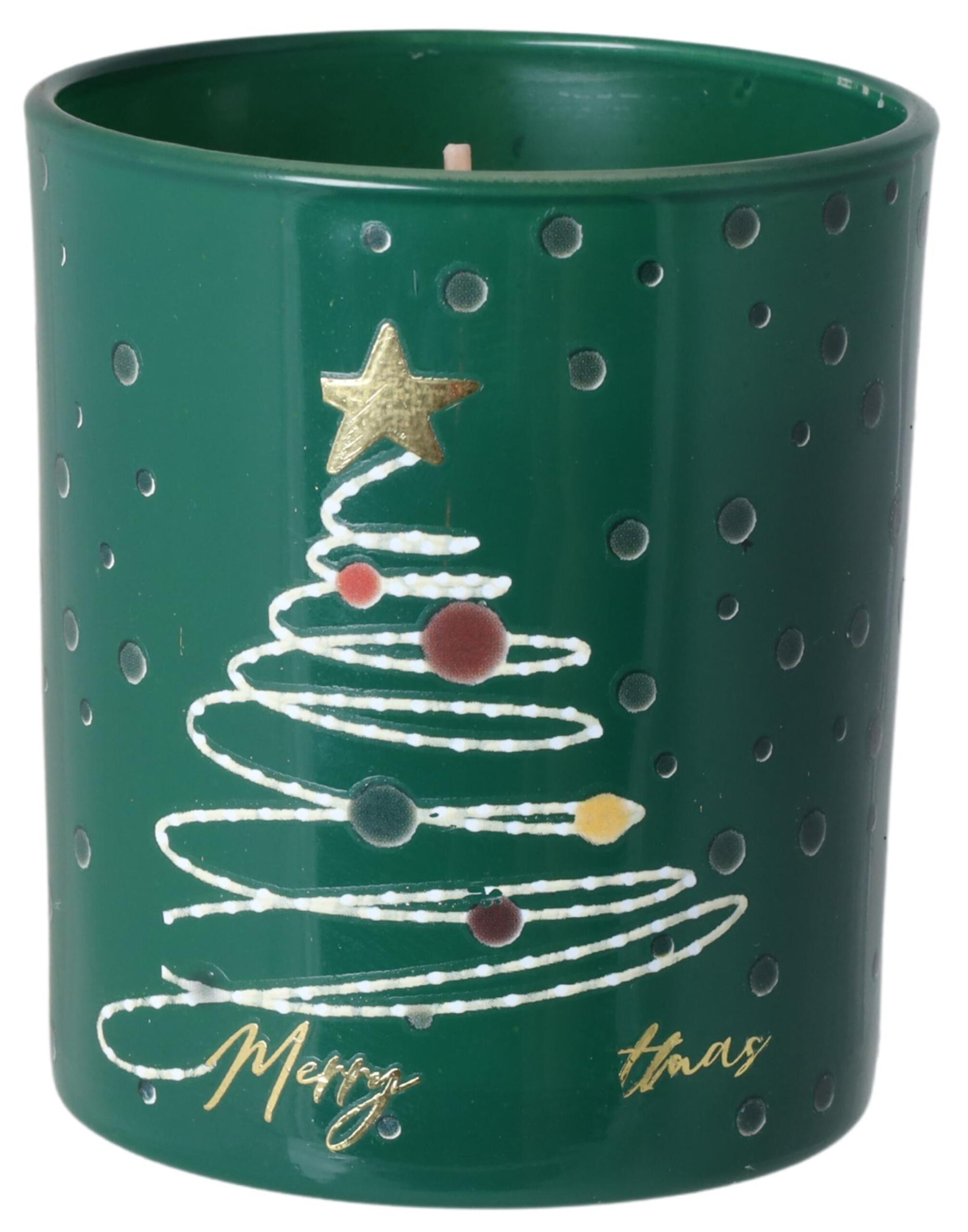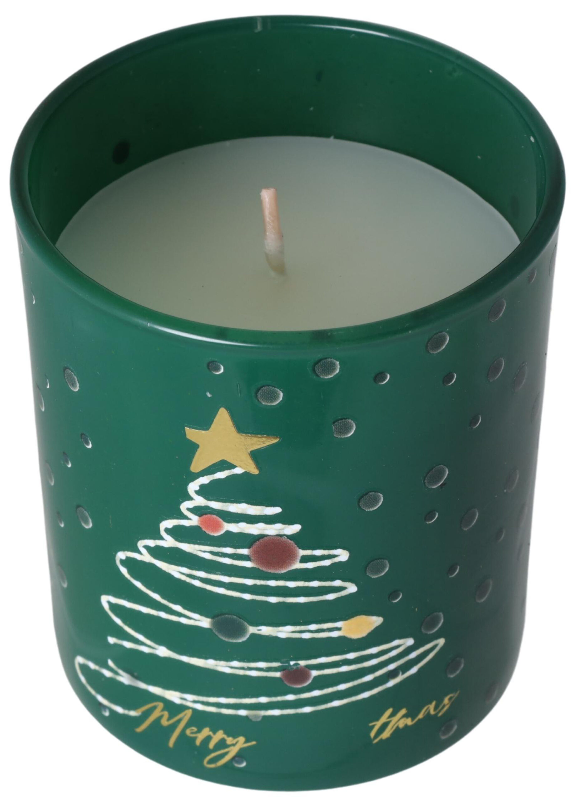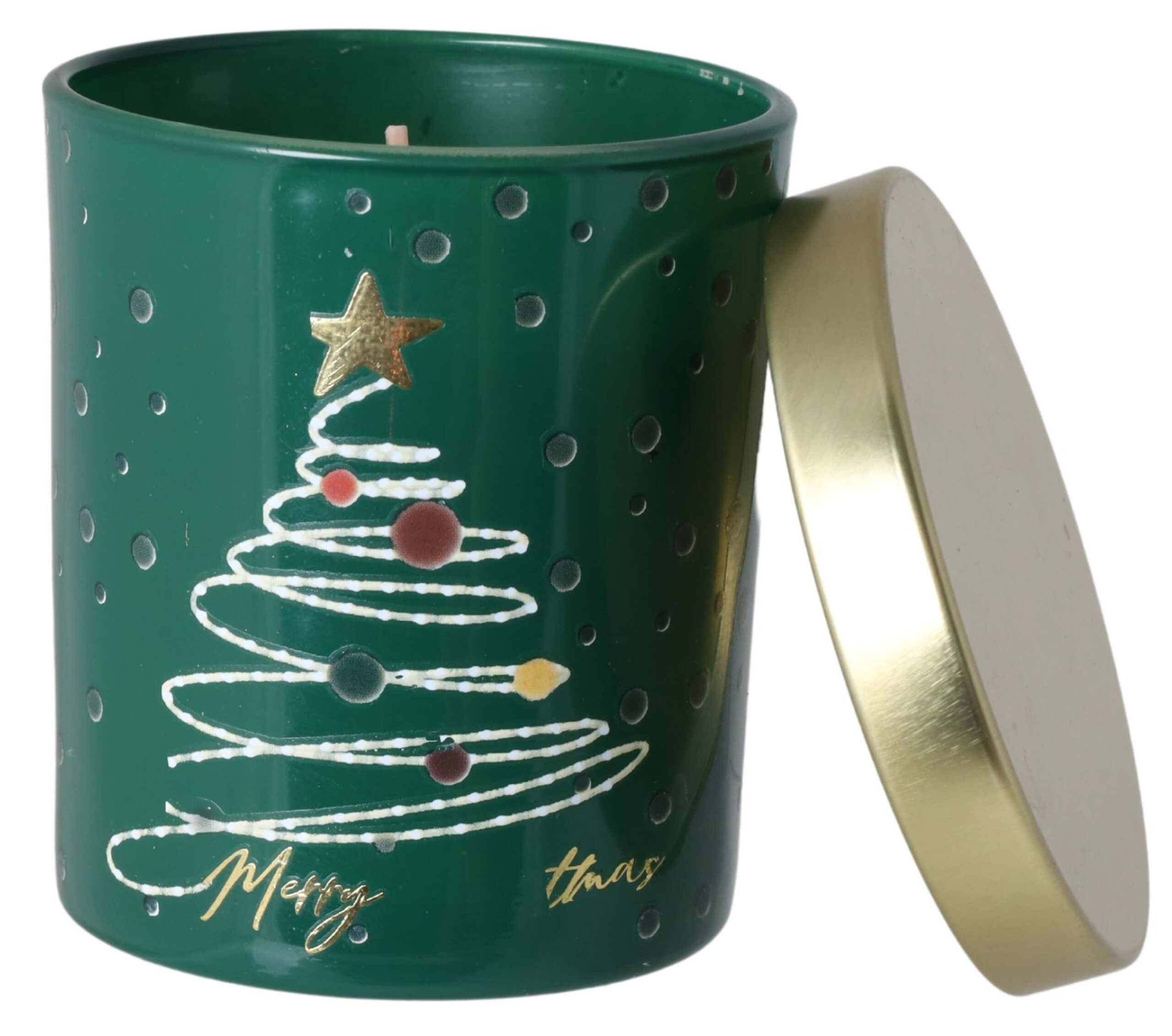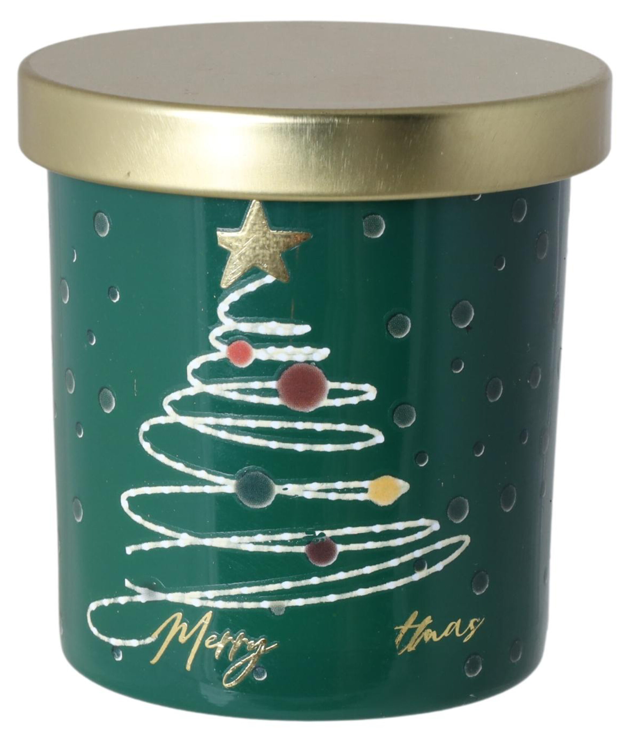 Zamknięta w ciemnozielonym szkle o połyskującym wykończeniu, świeca zdobiona jest stylizowaną choinką z kolorowymi bombkami i złotą gwiazdką na szczycie. Napis „Merry Xmas” w złotej kaligrafii podkreśla jej świąteczny charakter, a złote wieczko dodaje elegancji i sprawia, że świeca prezentuje się wyjątkowo — zarówno na stole, komodzie, jak i w zestawie prezentowym.