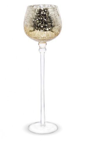 Wyjątkowy świecznik ASTRIS wykonany z wysokiej jakości szkła z efektem, który przypomina delikatnie popękaną powierzchnię. Jego lustrzane złociste wykończenie pięknie odbija światło, tworząc magiczną grę refleksów i ciepły, przytulny klimat. Prosta, lecz elegancka forma z wysoką nóżką sprawia, że świecznik staje się centralnym elementem dekoracyjnym każdego pomieszczenia.