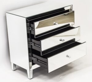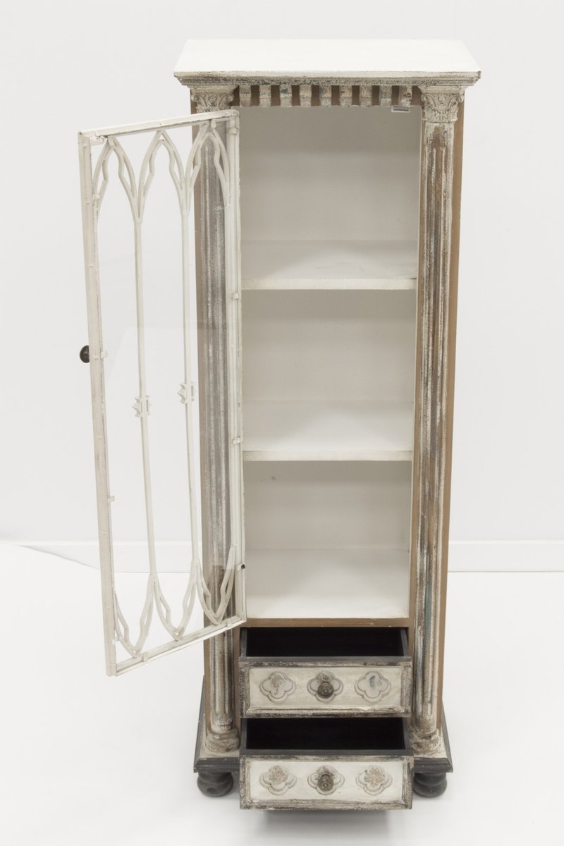 Szafka Izolda to drewniana szafka w stylu postarzanym, koloru kremowego. Posiada szafkę z trzema półkami oraz dwie szufladki.