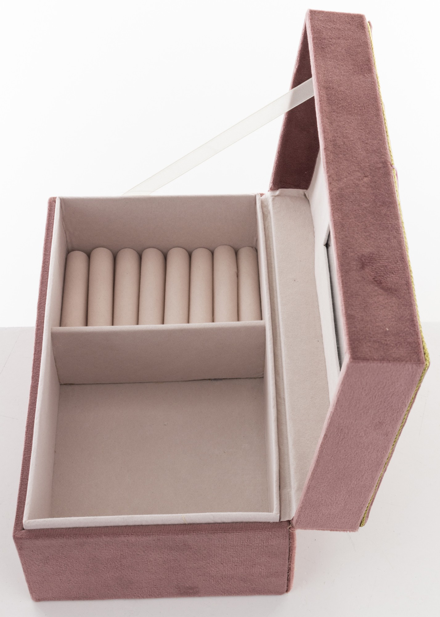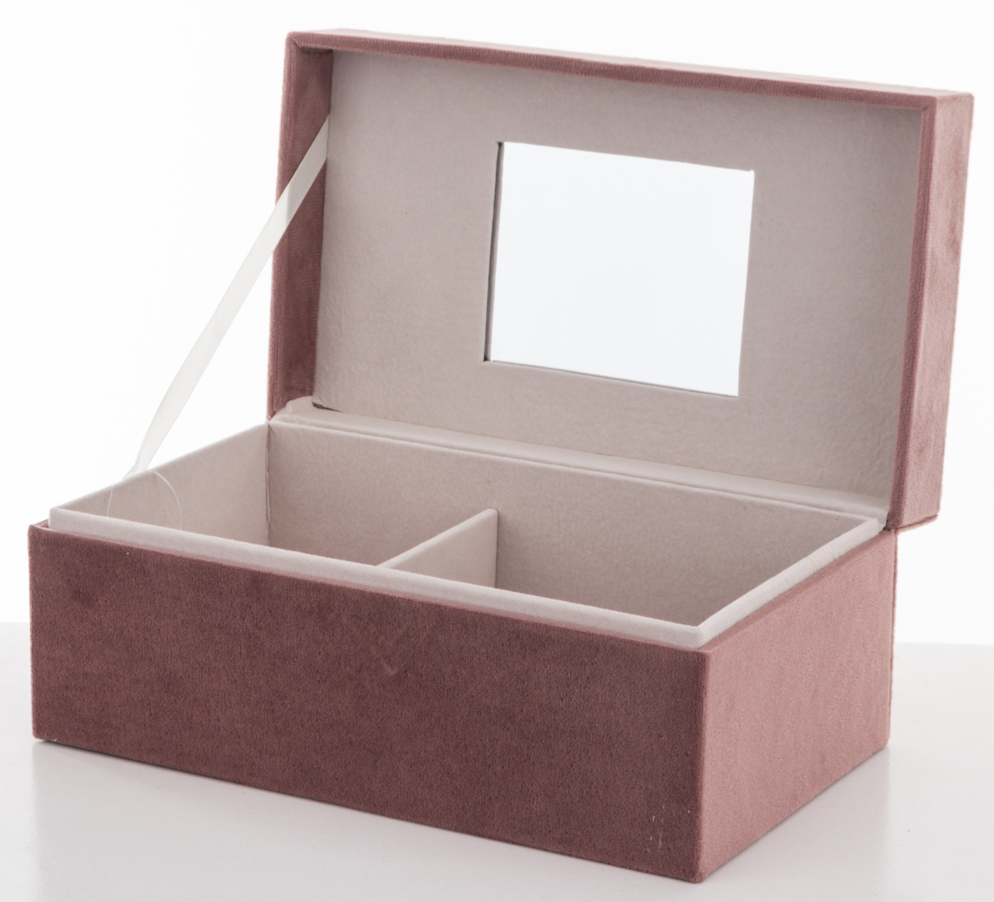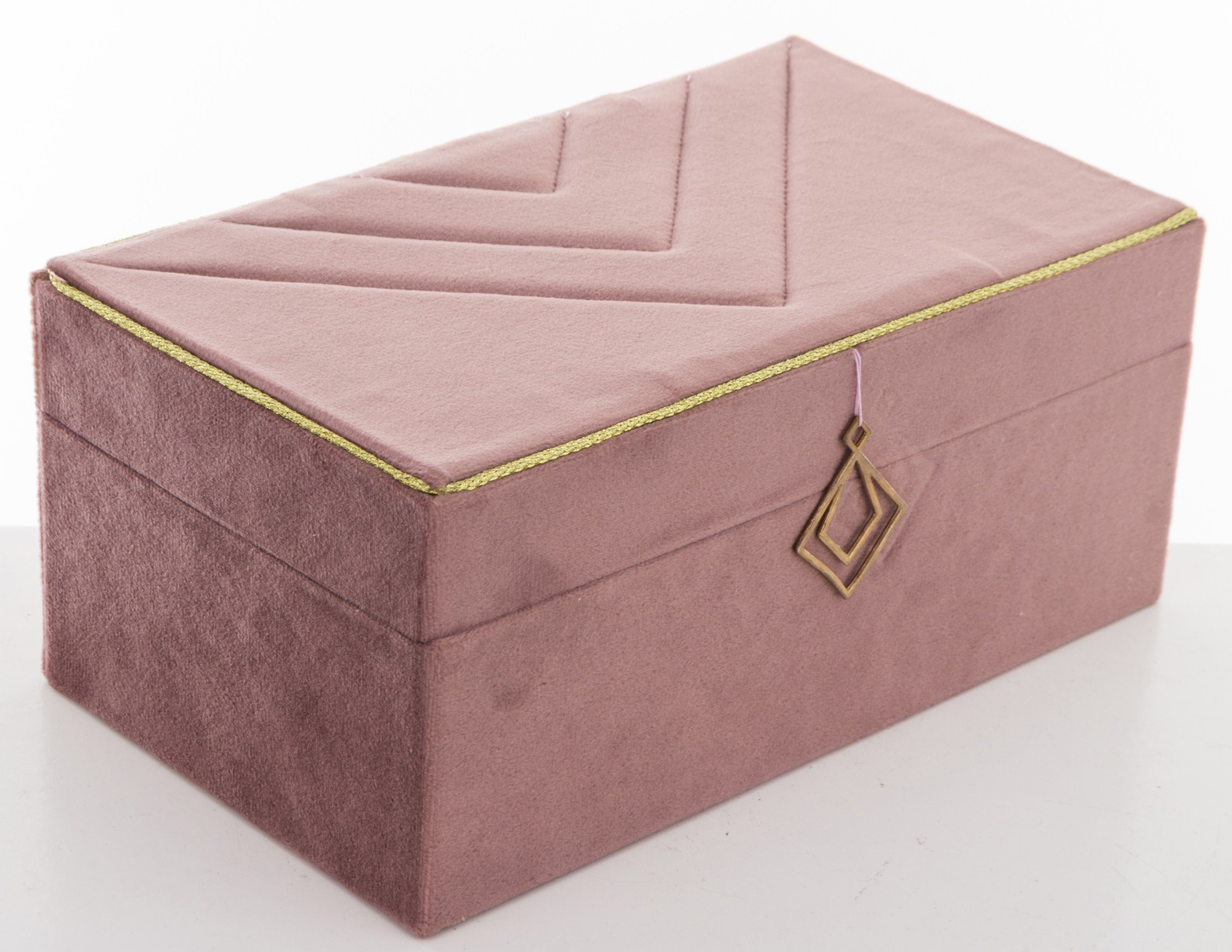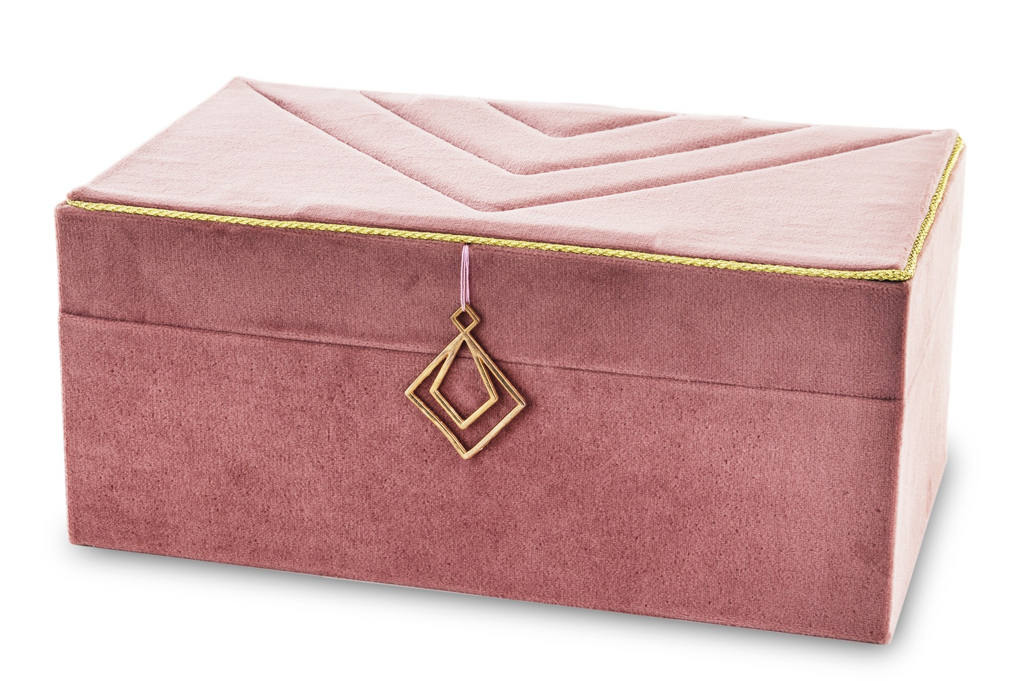 Elegancka, kobieca szkatułka na biżuterię pokryta różową, miękką tkaniną to stylowy i funkcjonalny dodatek. Wieczko zdobi ozdobna złota zawieszka ułatwiająca otwieranie. W środku, pod pokrywą, znajduje się prostokątne lusterko. Wnętrze szkatułki, wyściełane jasnoróżowym miękkim materiałem, podzielone jest na dwie części: jedną na pierścionki i drugą na pozostałą biżuterię. Doskonała możliwość organizacji swoich kosztowności i estetyczny wygląd sprawiają, że jest to doskonały podarunek dla każdej posiadaczki biżuterii.