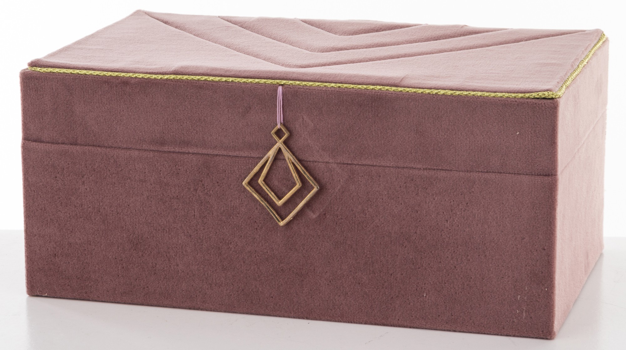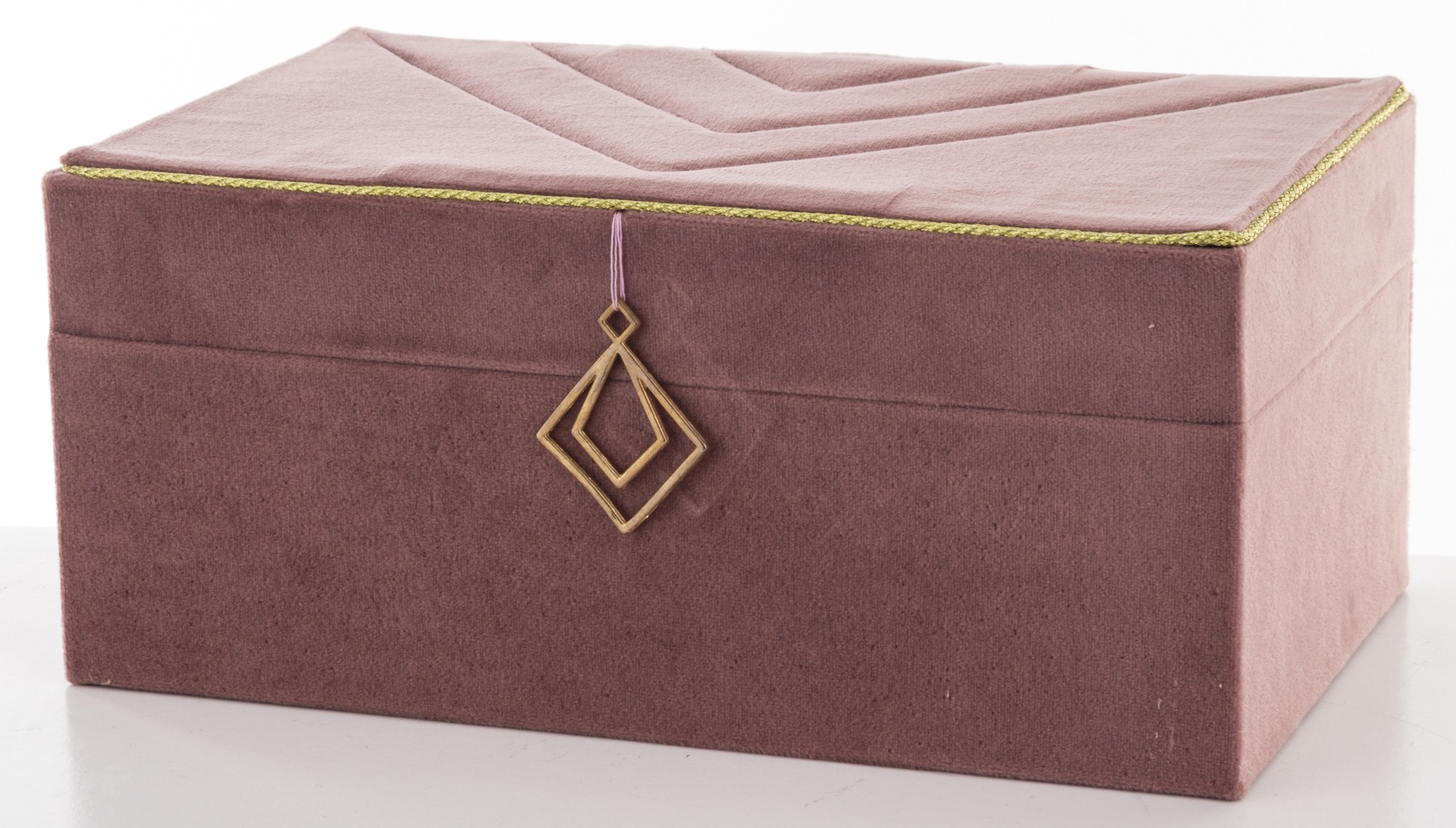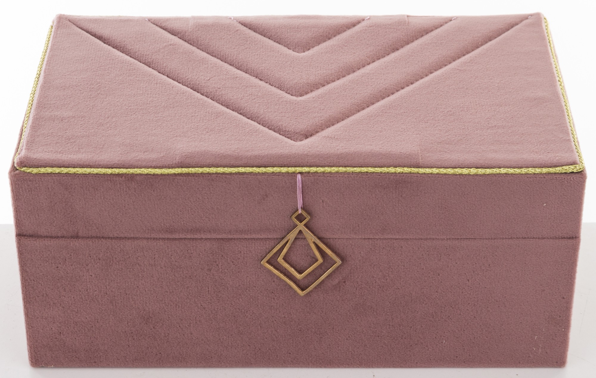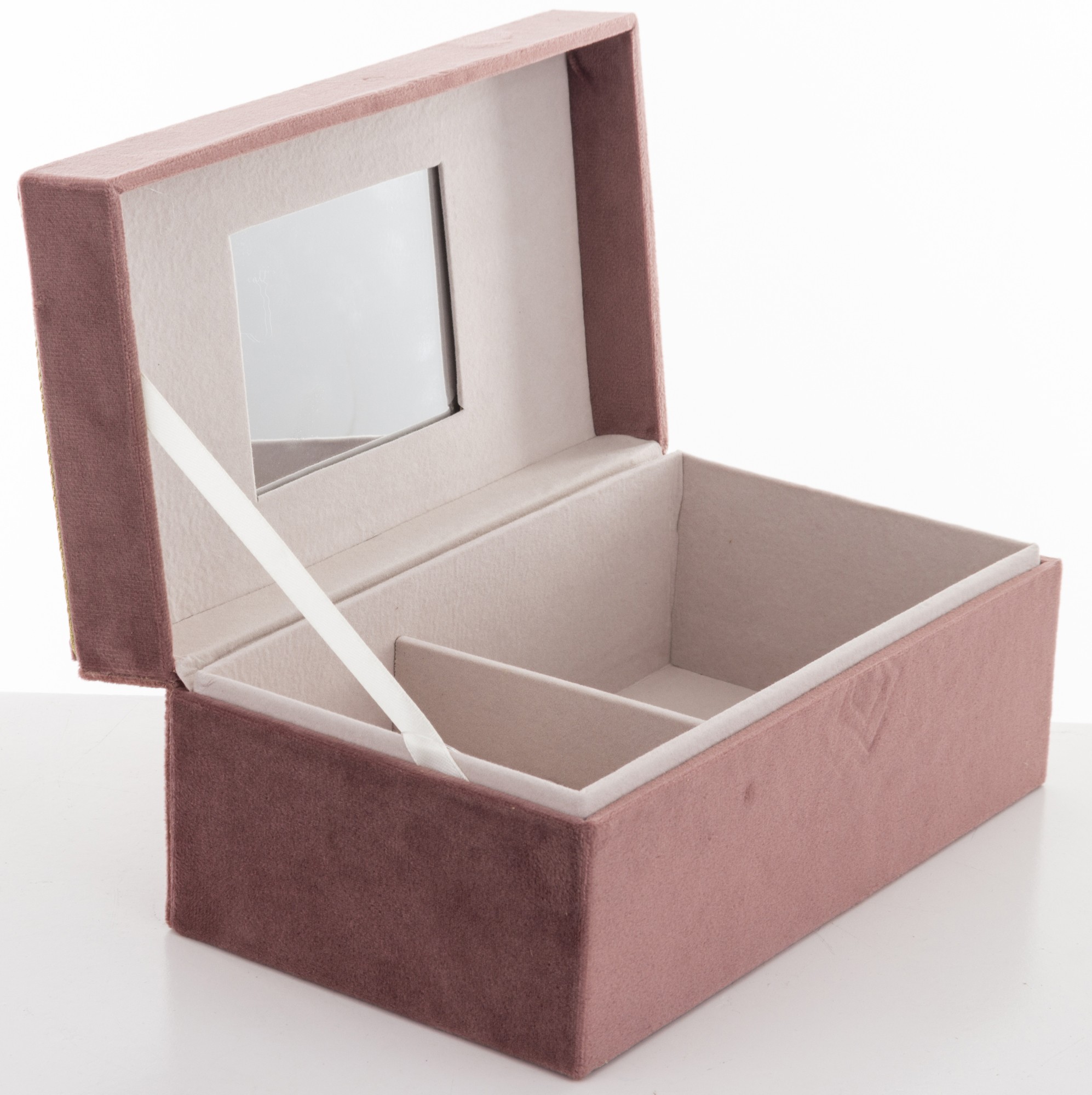 Elegancka, kobieca szkatułka na biżuterię pokryta różową, miękką tkaniną to stylowy i funkcjonalny dodatek. Wieczko zdobi ozdobna złota zawieszka ułatwiająca otwieranie. W środku, pod pokrywą, znajduje się prostokątne lusterko. Wnętrze szkatułki, wyściełane jasnoróżowym miękkim materiałem, podzielone jest na dwie części: jedną na pierścionki i drugą na pozostałą biżuterię. Doskonała możliwość organizacji swoich kosztowności i estetyczny wygląd sprawiają, że jest to doskonały podarunek dla każdej posiadaczki biżuterii.