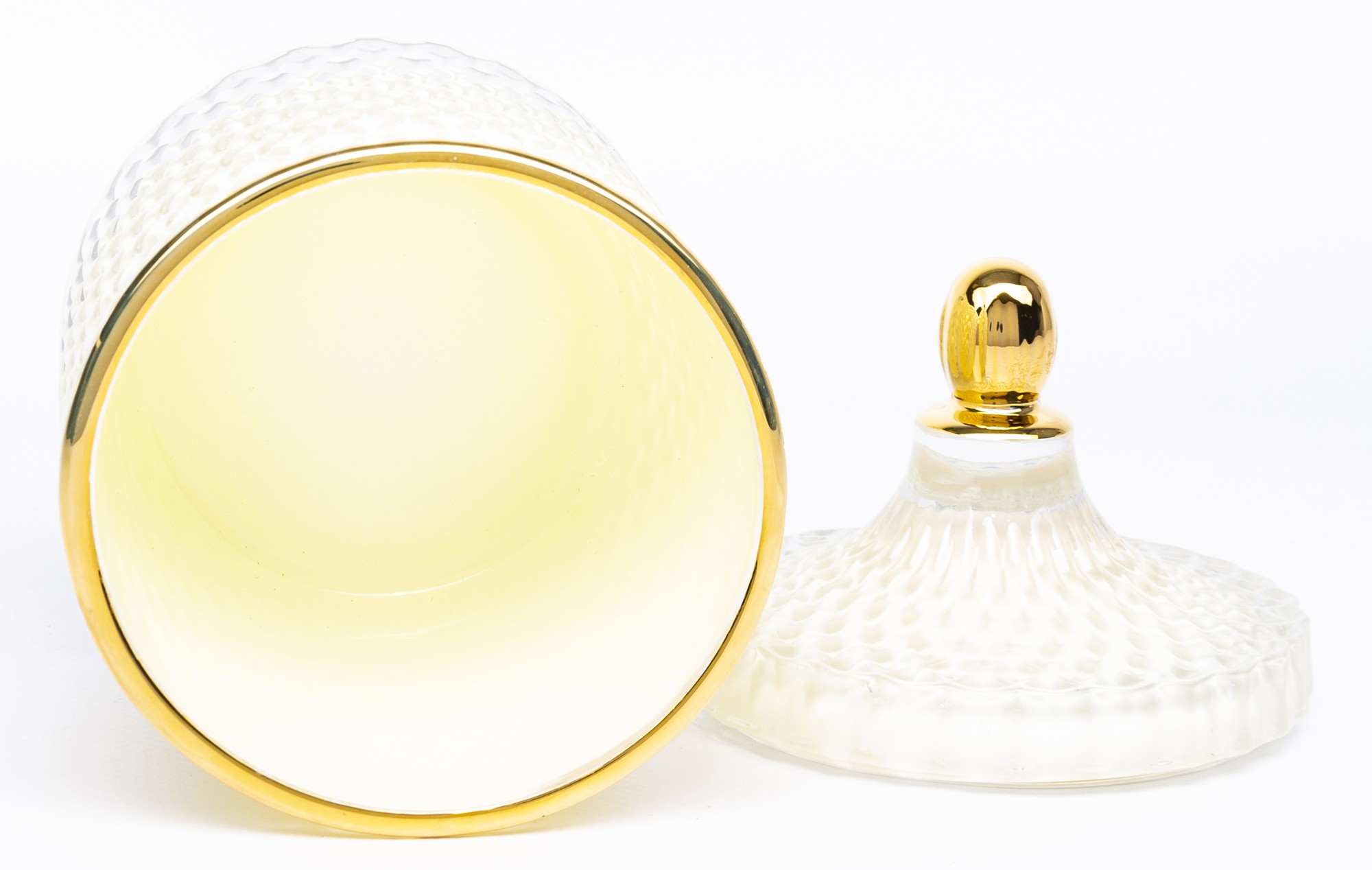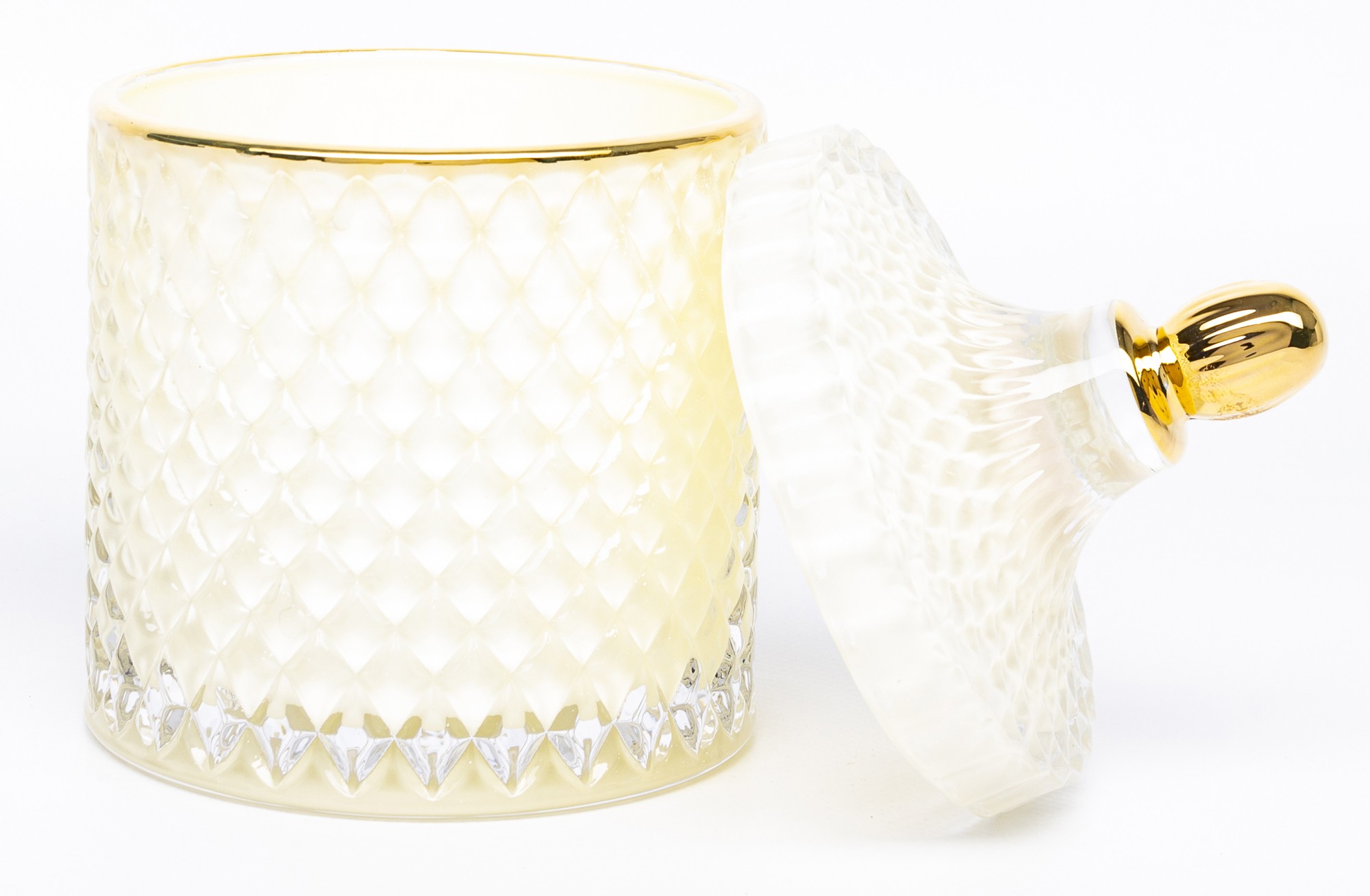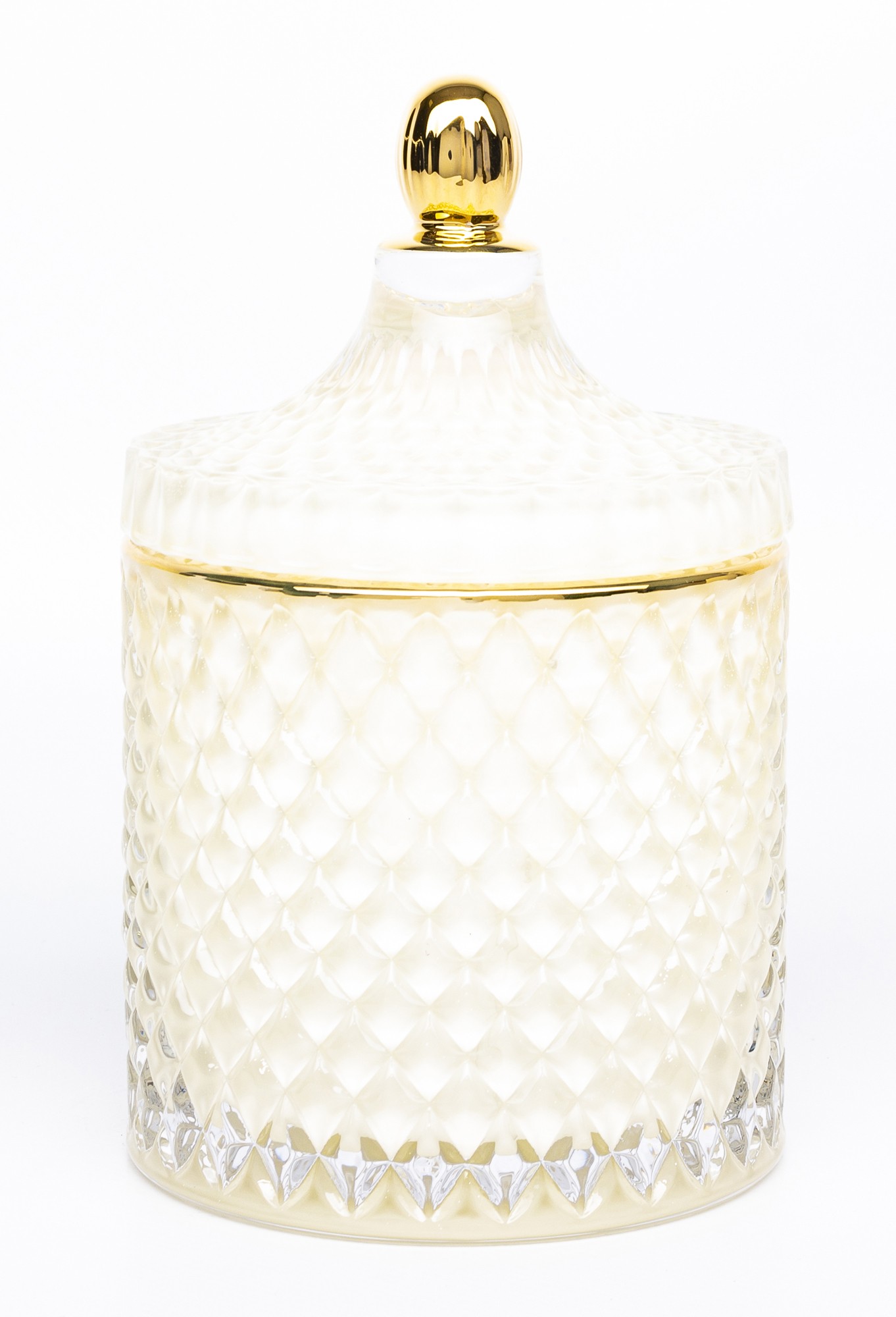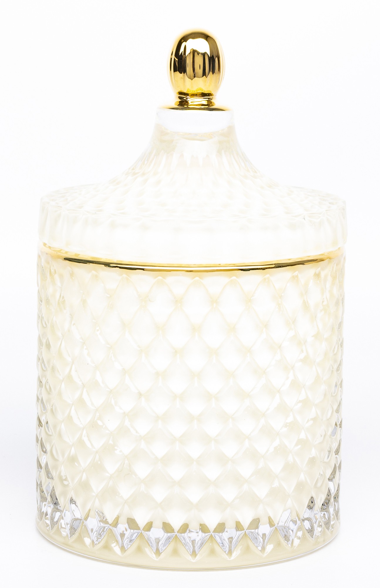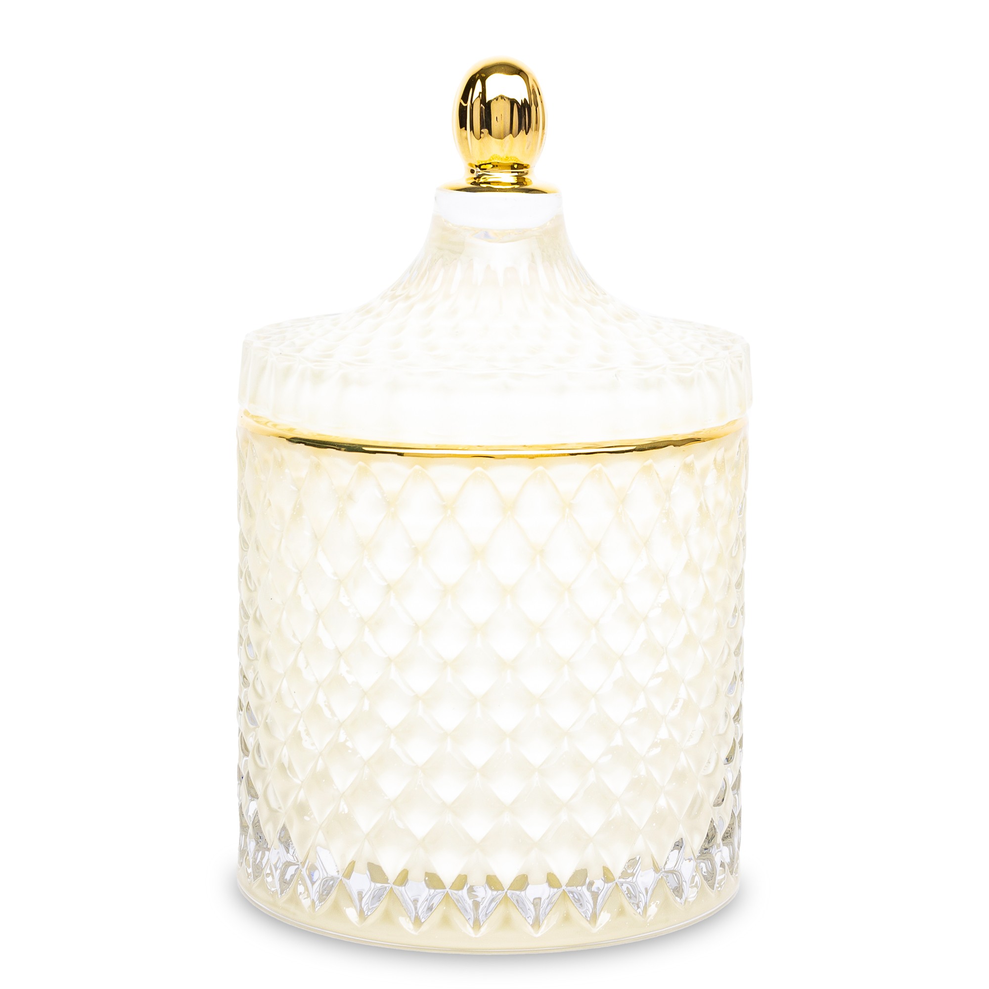 Ten dekoracyjny pojemnik to połączenie klasycznej estetyki i funkcjonalności. Wykonany z transparentnego szkła o kremowym odcieniu i efektownej, diamentowej fakturze, pięknie odbija światło i dodaje wnętrzu delikatnego blasku. Złota pokrywka z ozdobnym uchwytem podkreśla luksusowy charakter pojemnika, tworząc harmonijną i elegancką całość.