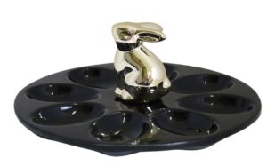 Wyjątkowy talerz na jajka GOTA wykonany z wysokiej jakości ceramiki, utrzymany w klasycznej bieli. Posiada osiem wgłębień, które umożliwiają wygodne podanie jajek. Na środku talerza znajduje się srebrny królik, który stanowi piękną ozdobę, dodając talerzowi subtelnego uroku i elegancji. Produkt doskonale sprawdzi się zarówno jako funkcjonalny element podczas świątecznych posiłków, jak i jako dekoracja stołu. Idealny na Wielkanoc oraz inne specjalne okazje. Dodaj odrobinę klasy i wyjątkowości do swojej kuchni!